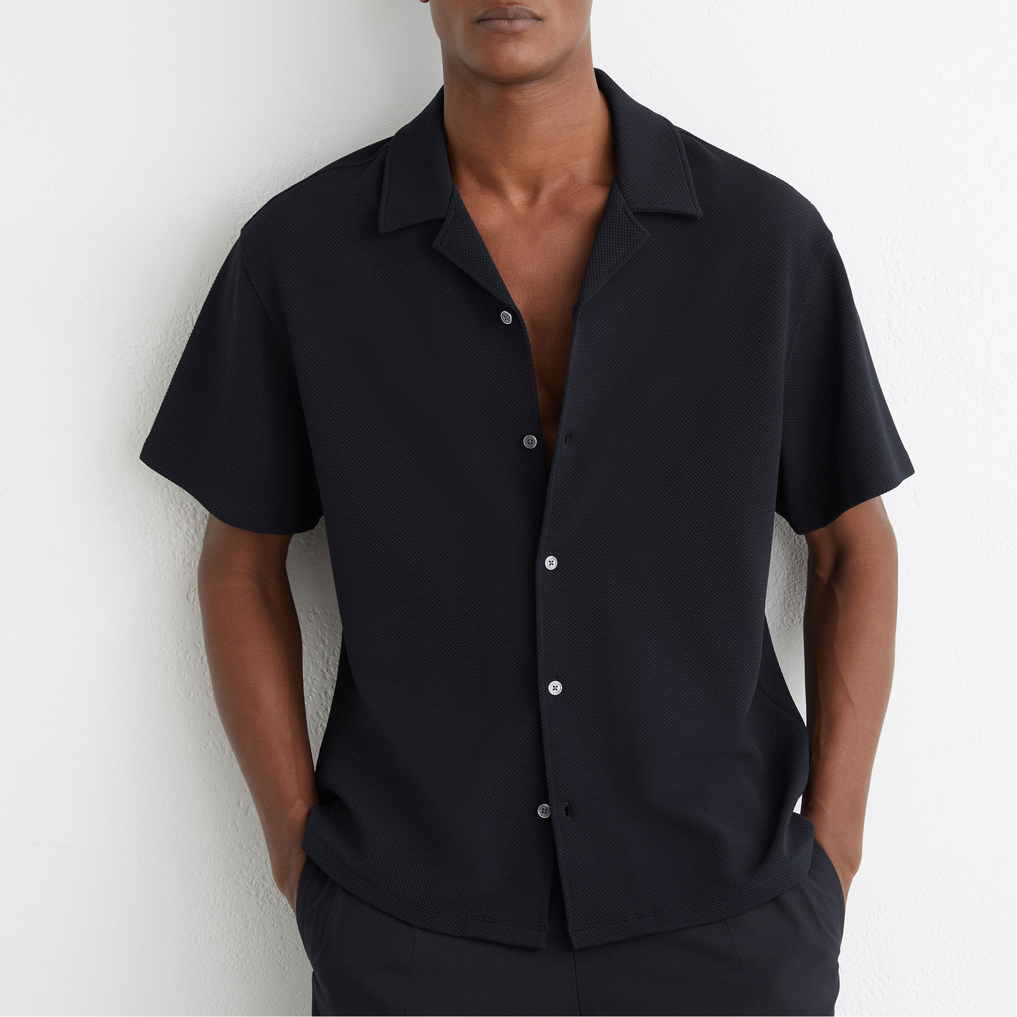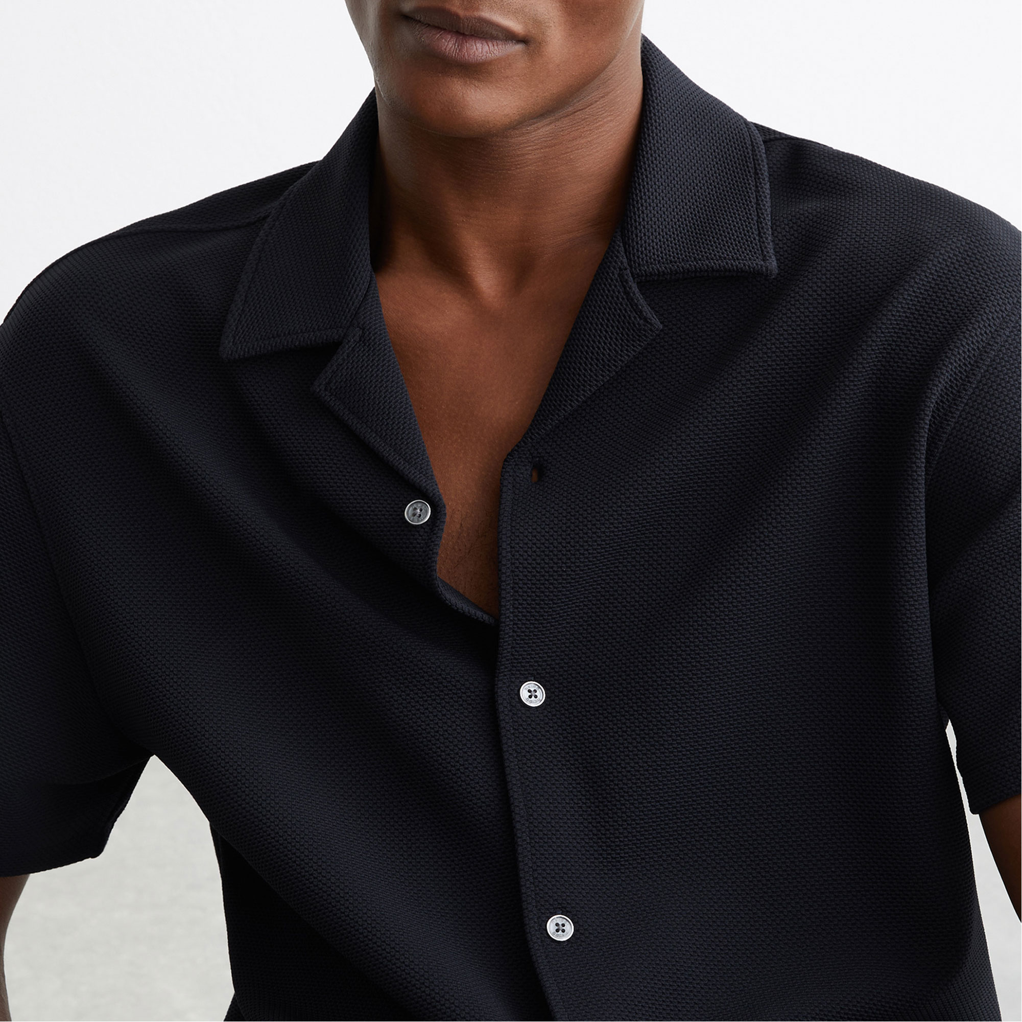 - Textured finish, Cuban collar, short sleeves, front buttons