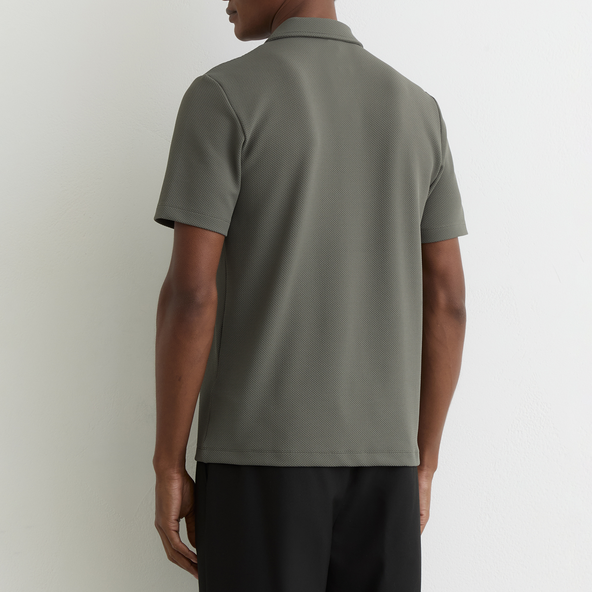- Textured finish, polo collar, short sleeves, half-zip fastening