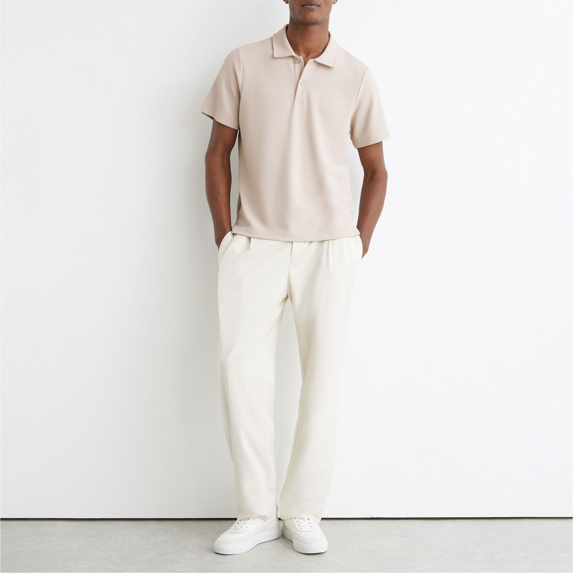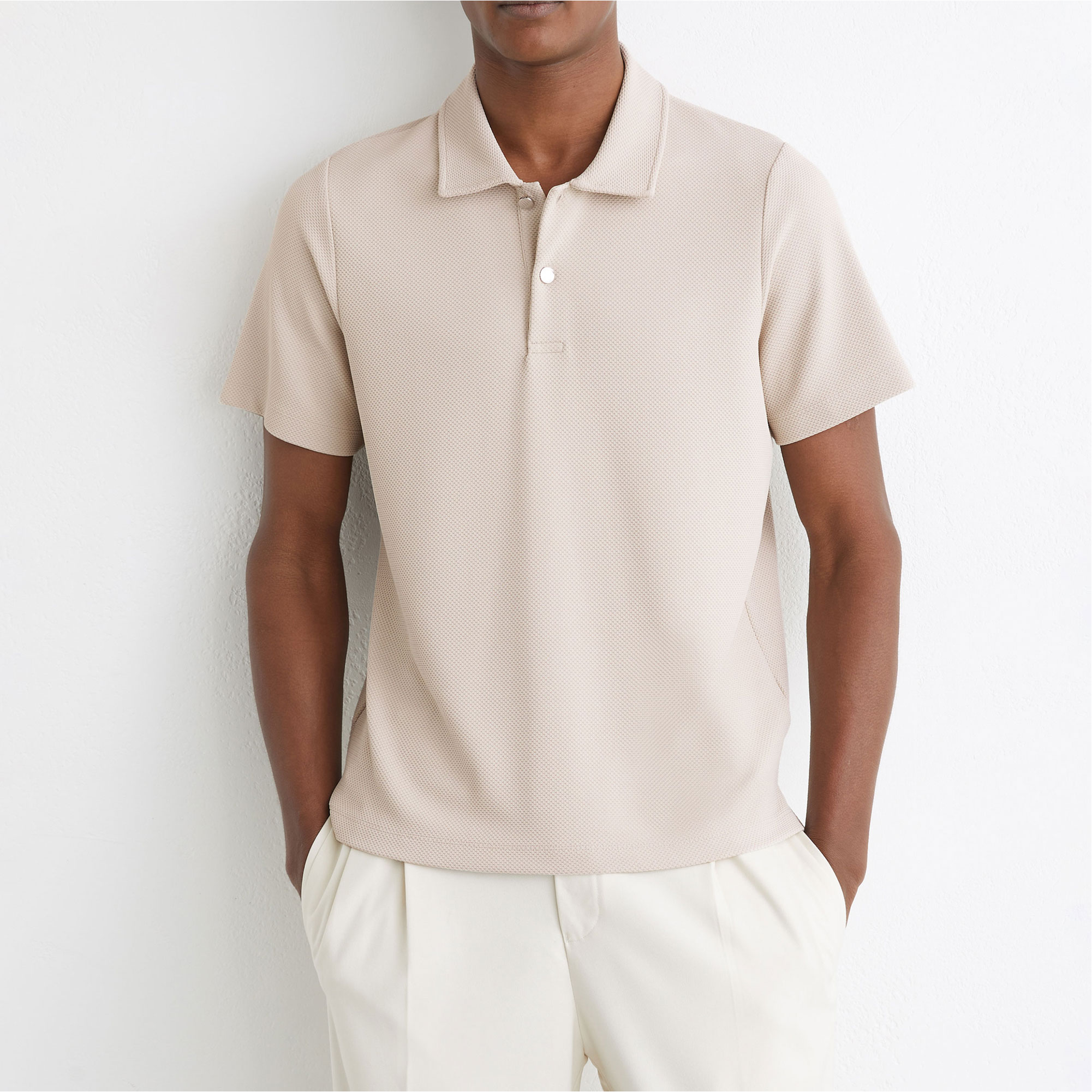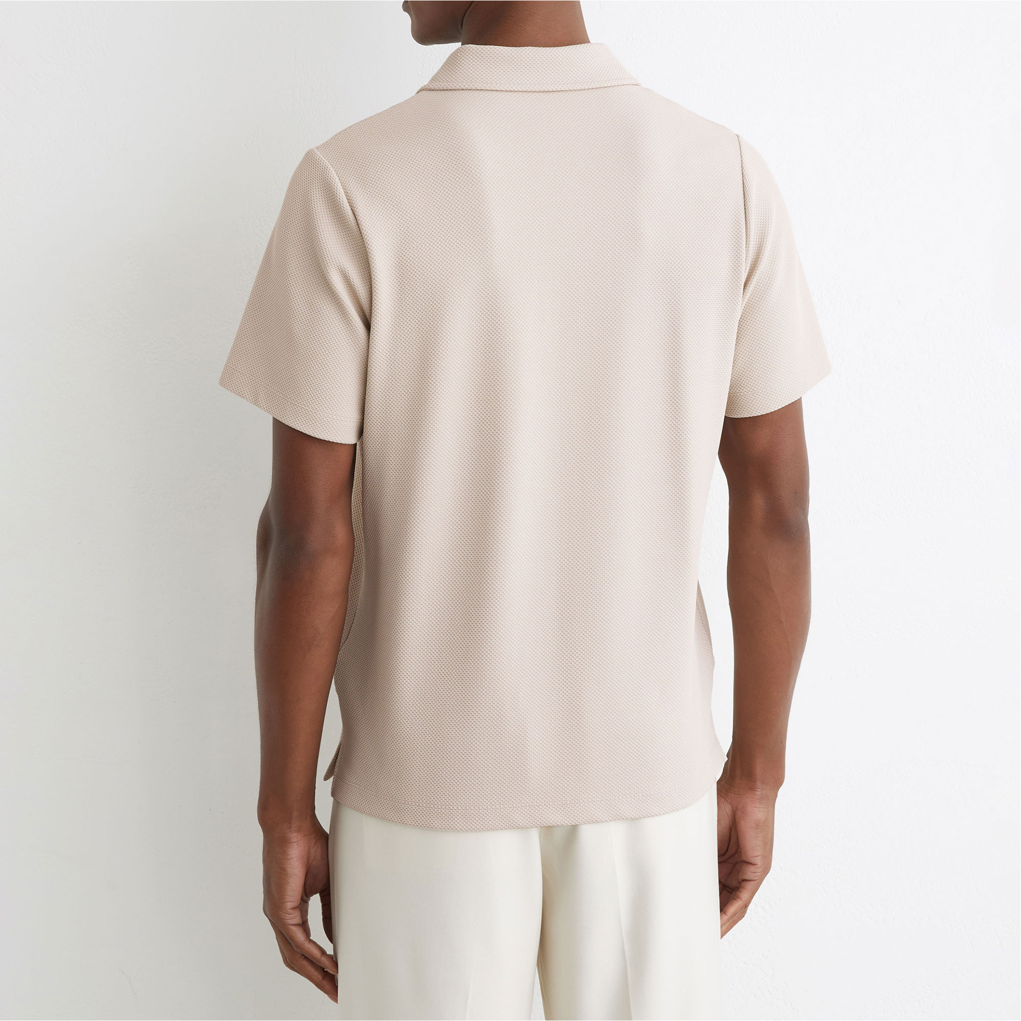 • Polo collar, textured fabric, short button placket, logo-engraved buttons, short sleeves