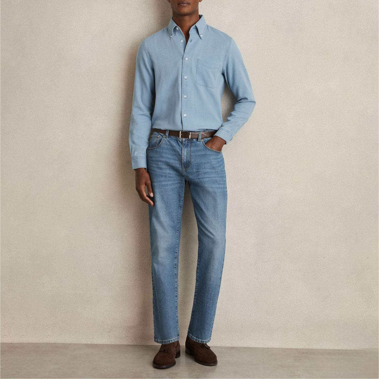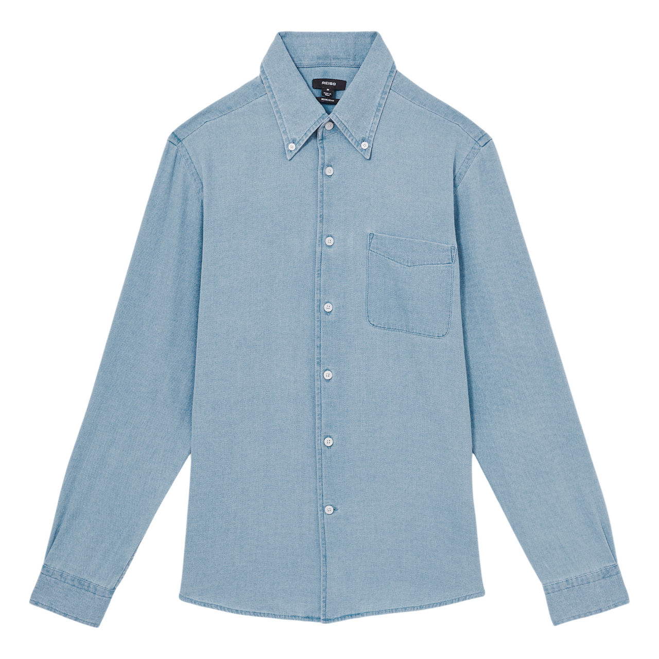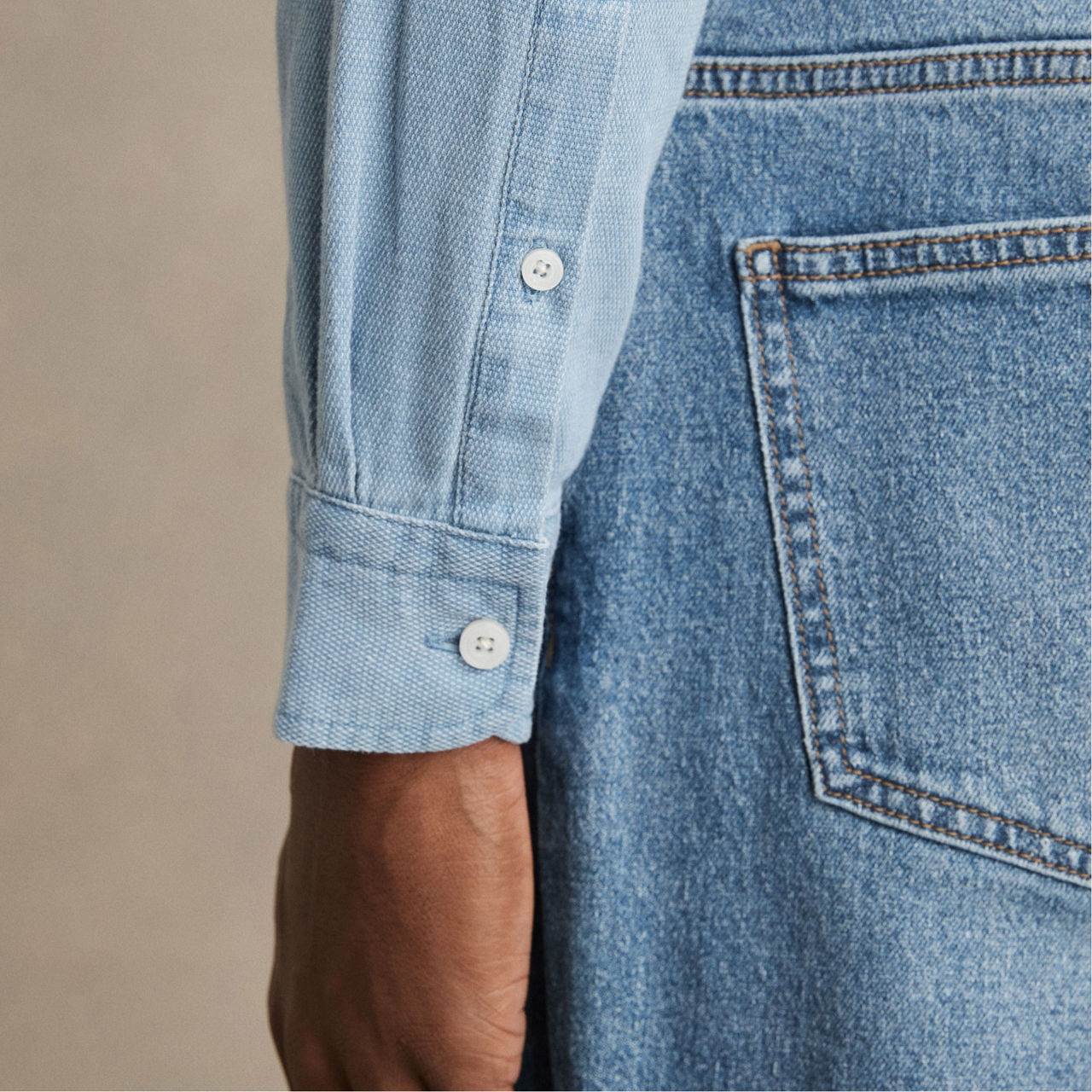 - Cotton piqué, chambray, button-down collar, chest patch pocket, button cuffs, front buttons, regular length, cutaway collar, full-length sleeves