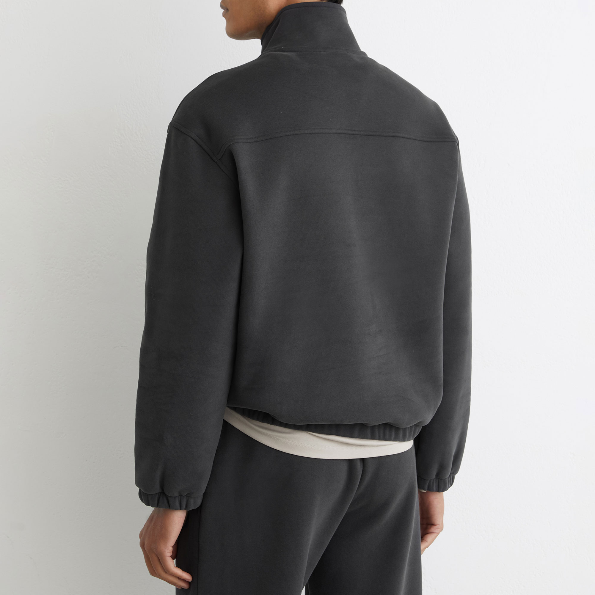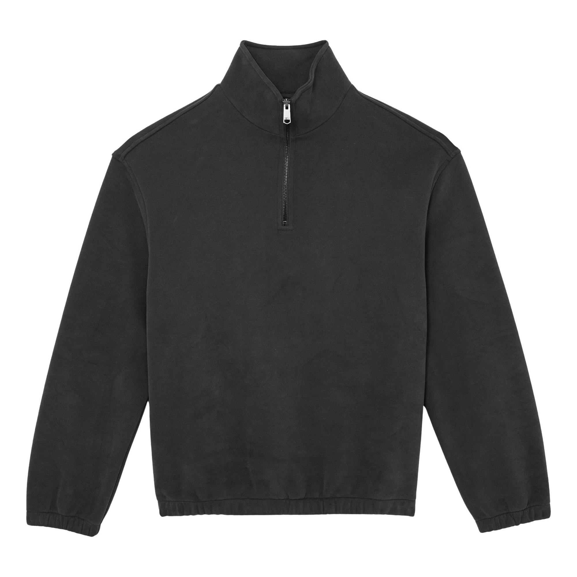 - Fleece-back brushed jersey, midweight, funnel neck, long sleeves, elasticated hem and cuffs, half-zip fastening