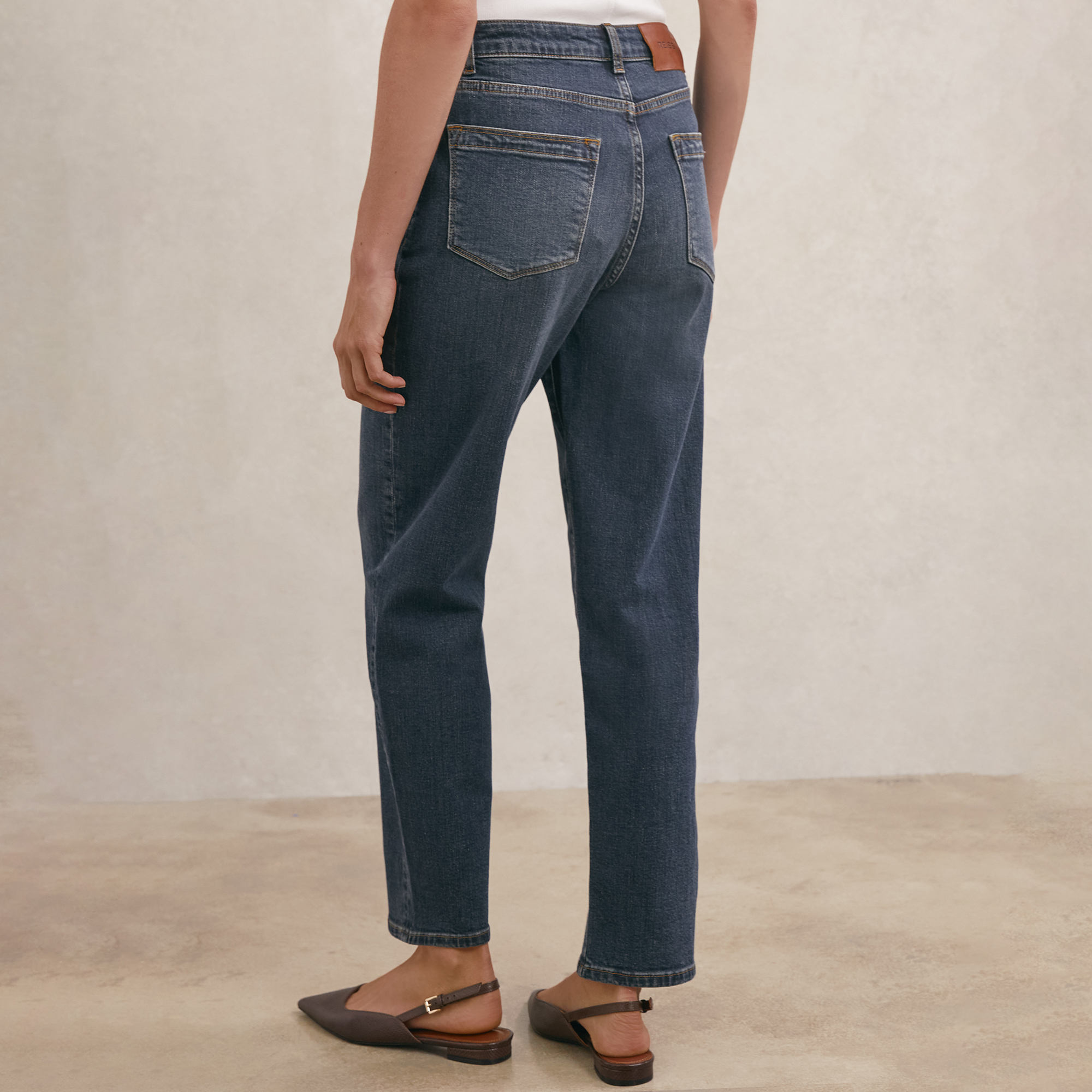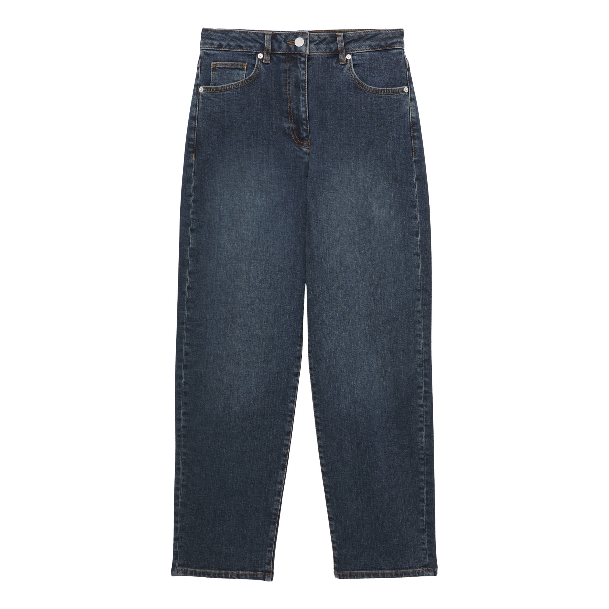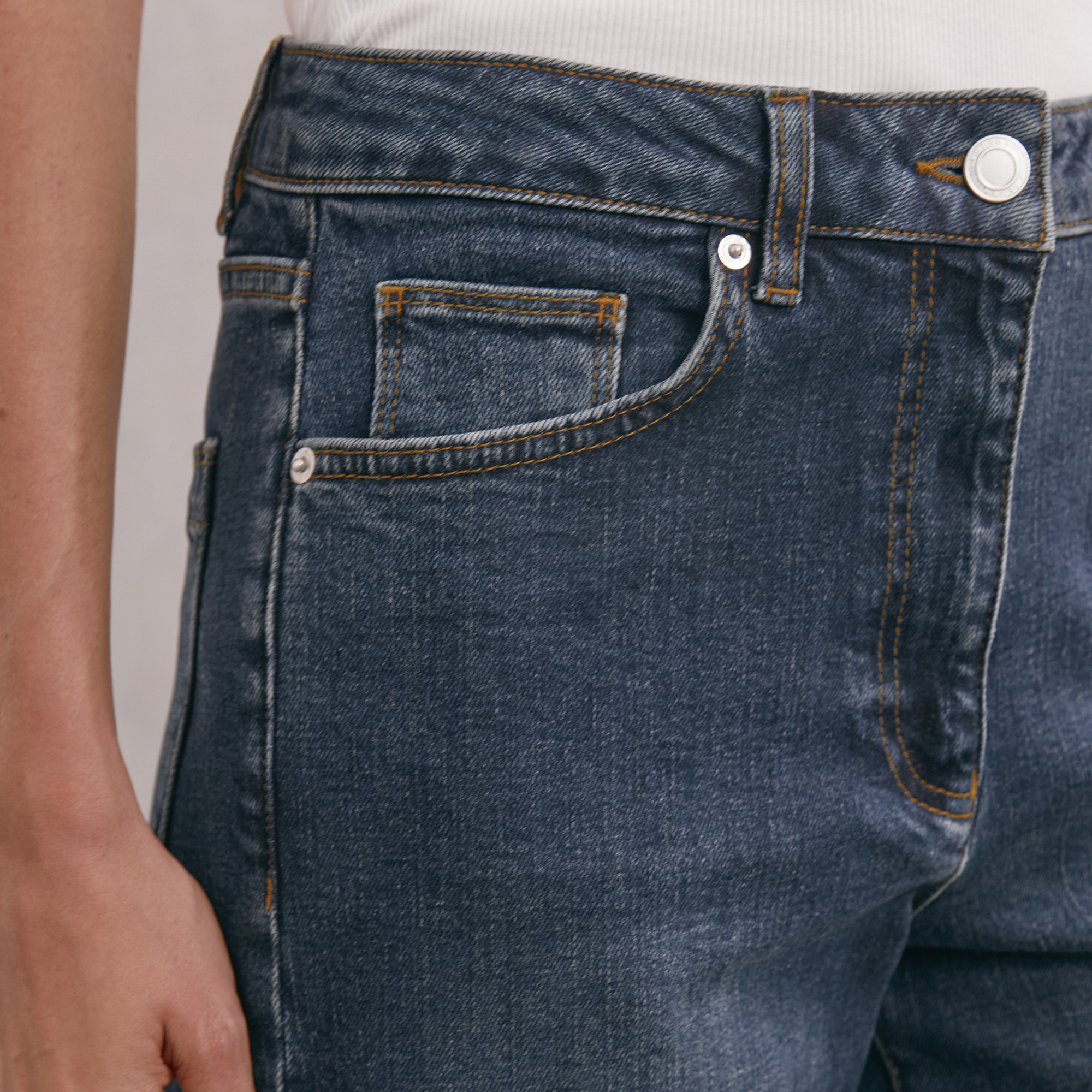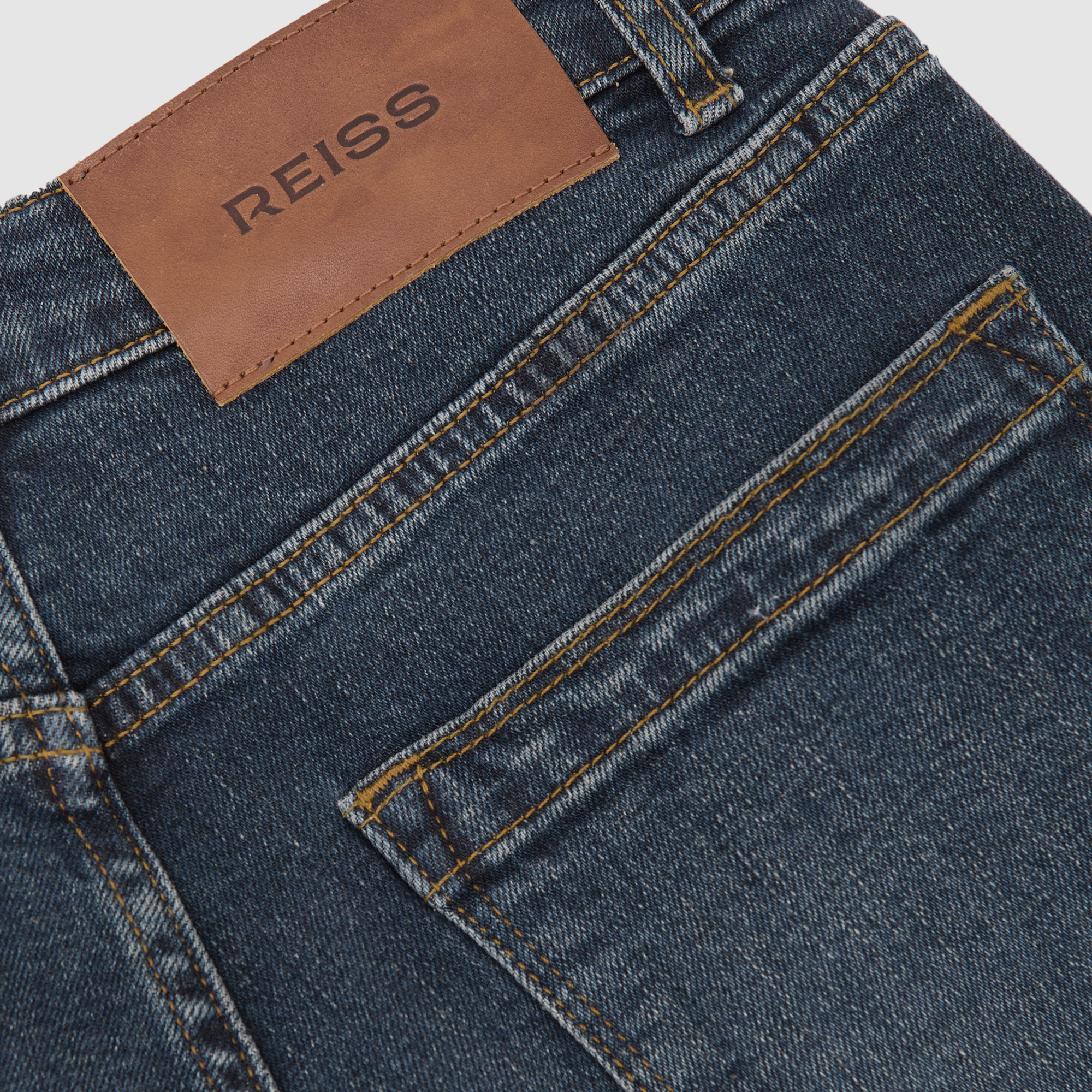 • Mid rise, straight leg, subtle fading, brand patch to reverse, five pockets, front button and zip