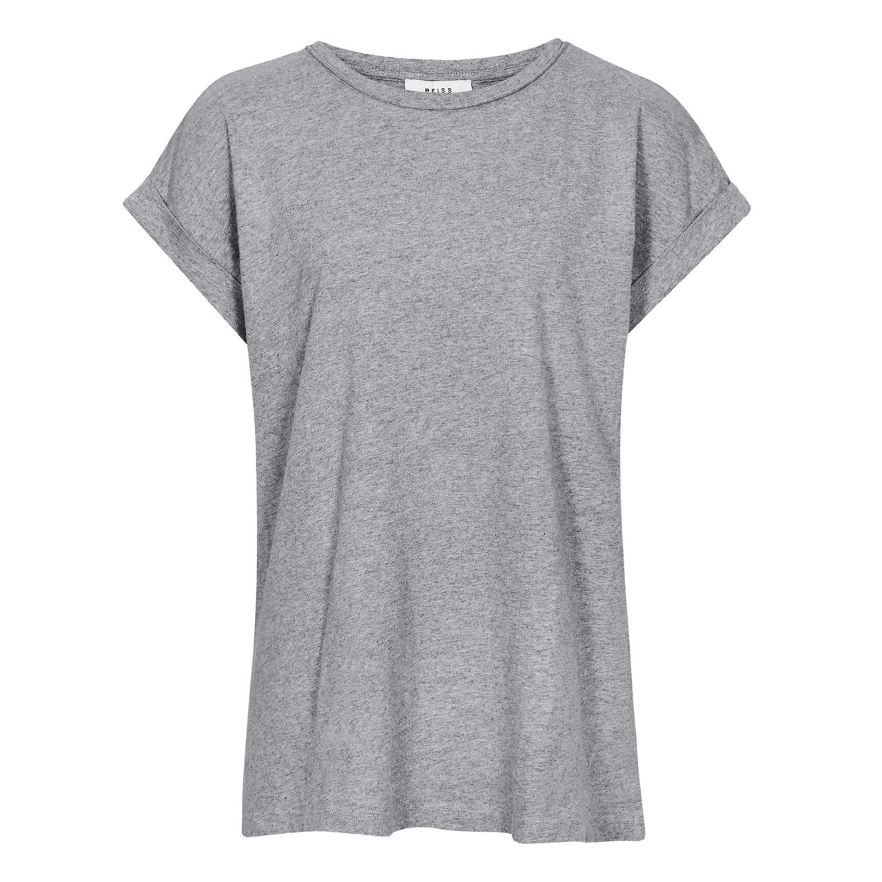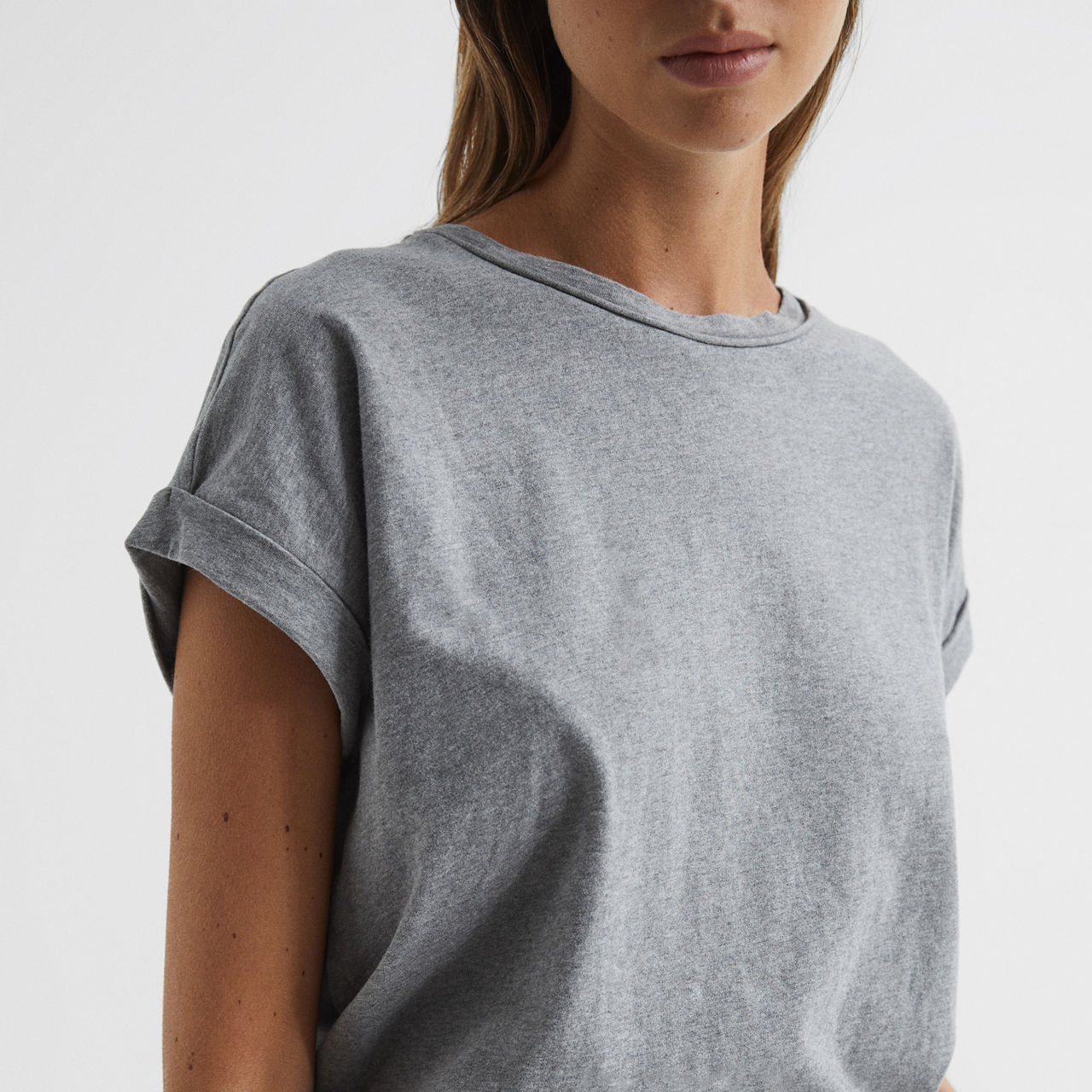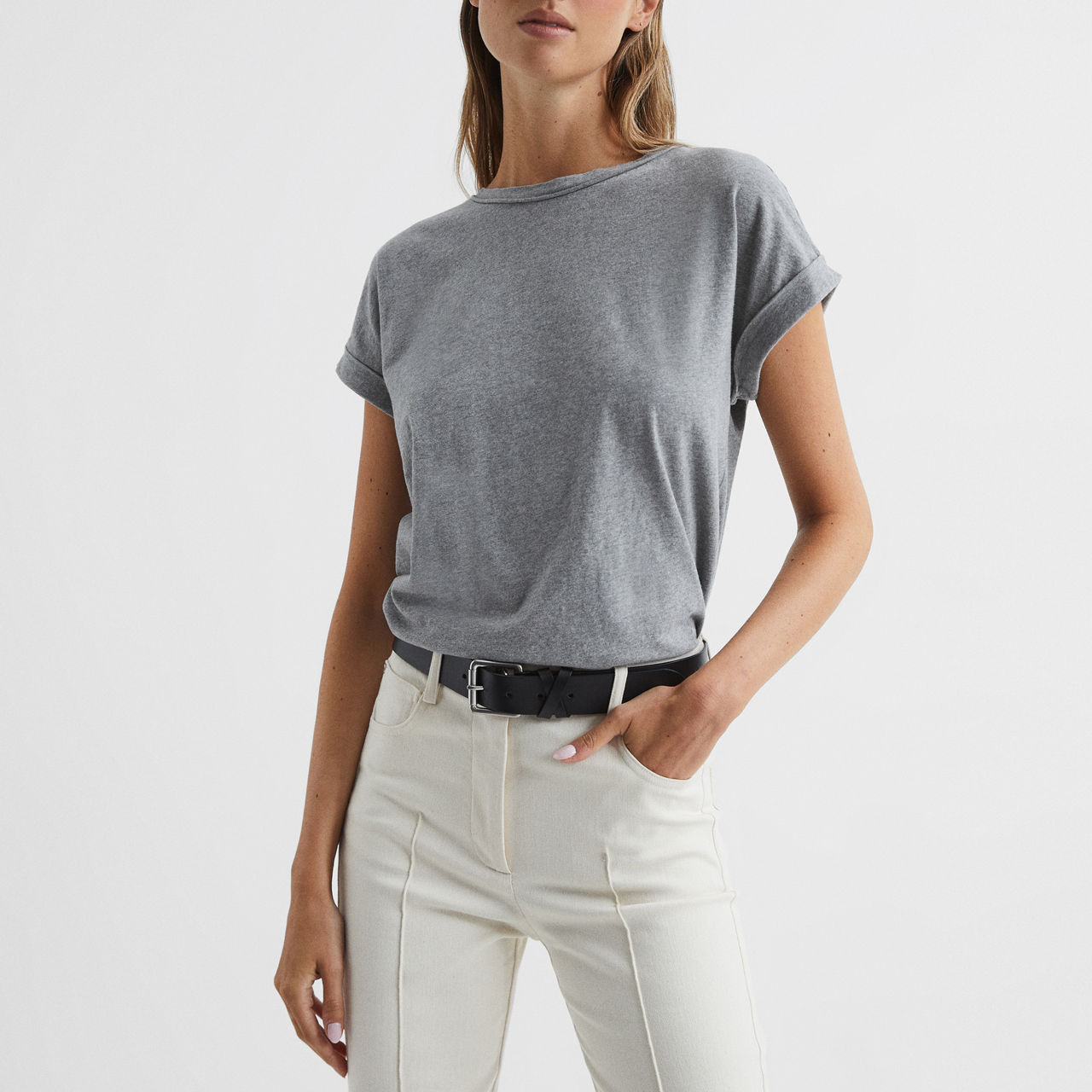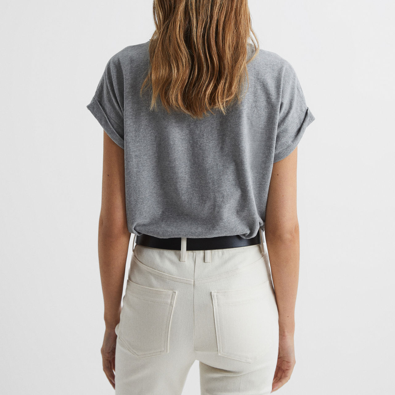 - Crew neckline, short sleeves, tonal stitching, straight hemline, smooth fabric