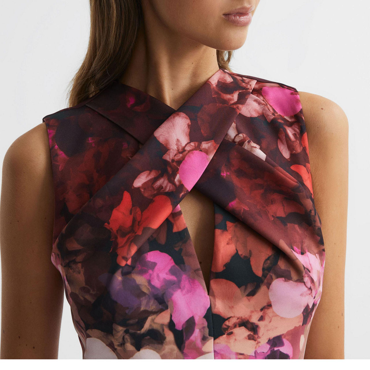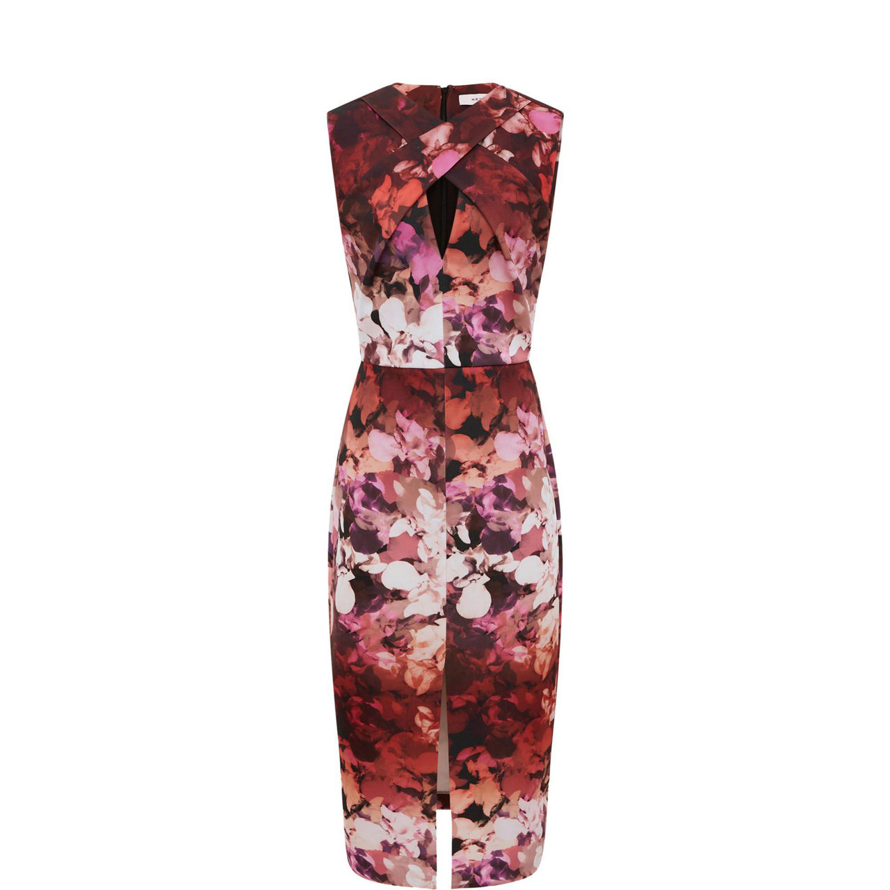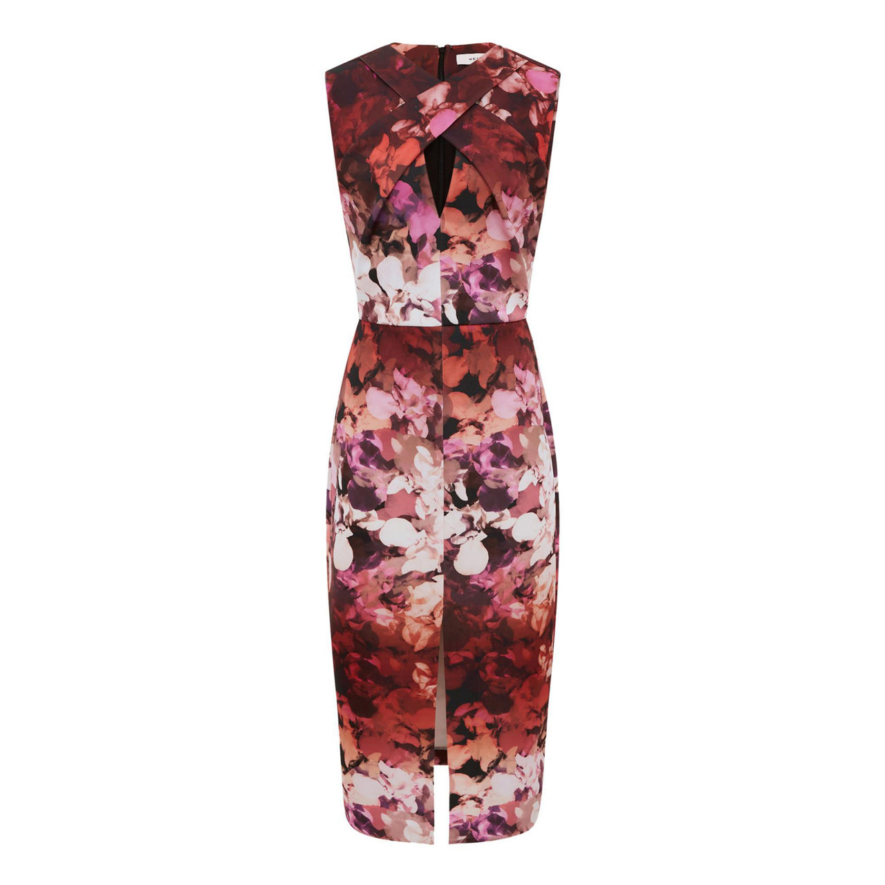 - Sleeveless, wrap neckline, keyhole detail, zip fastening, front slit, floral pattern