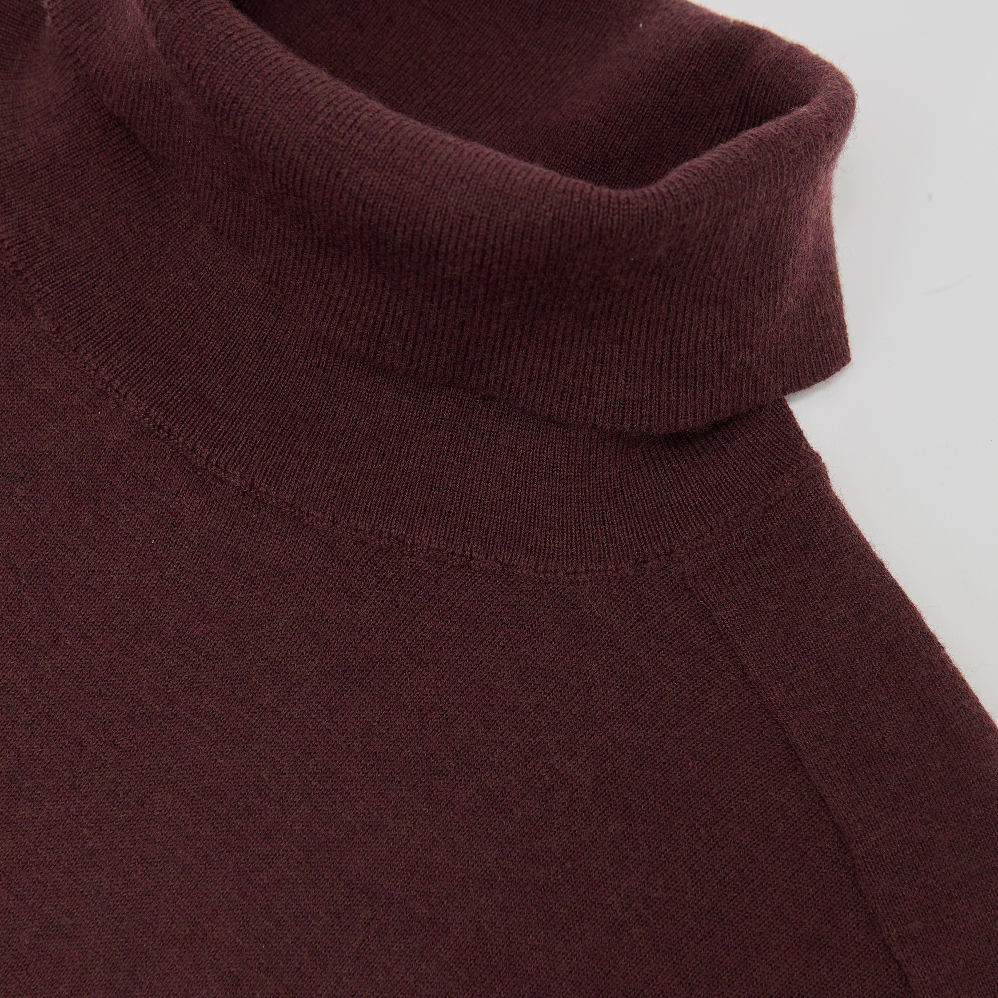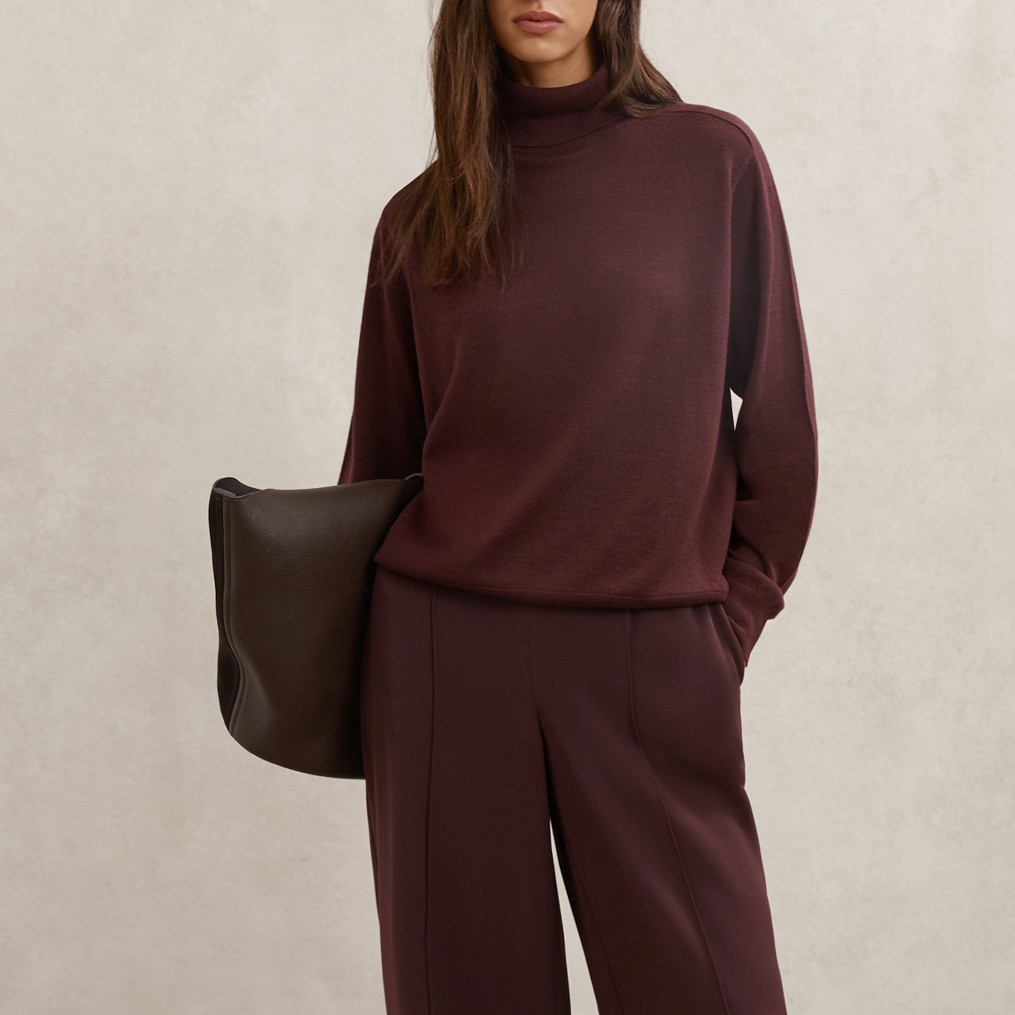- Roll neck, saddle sleeves, decorative stitch at reverse, finely-ribbed trims