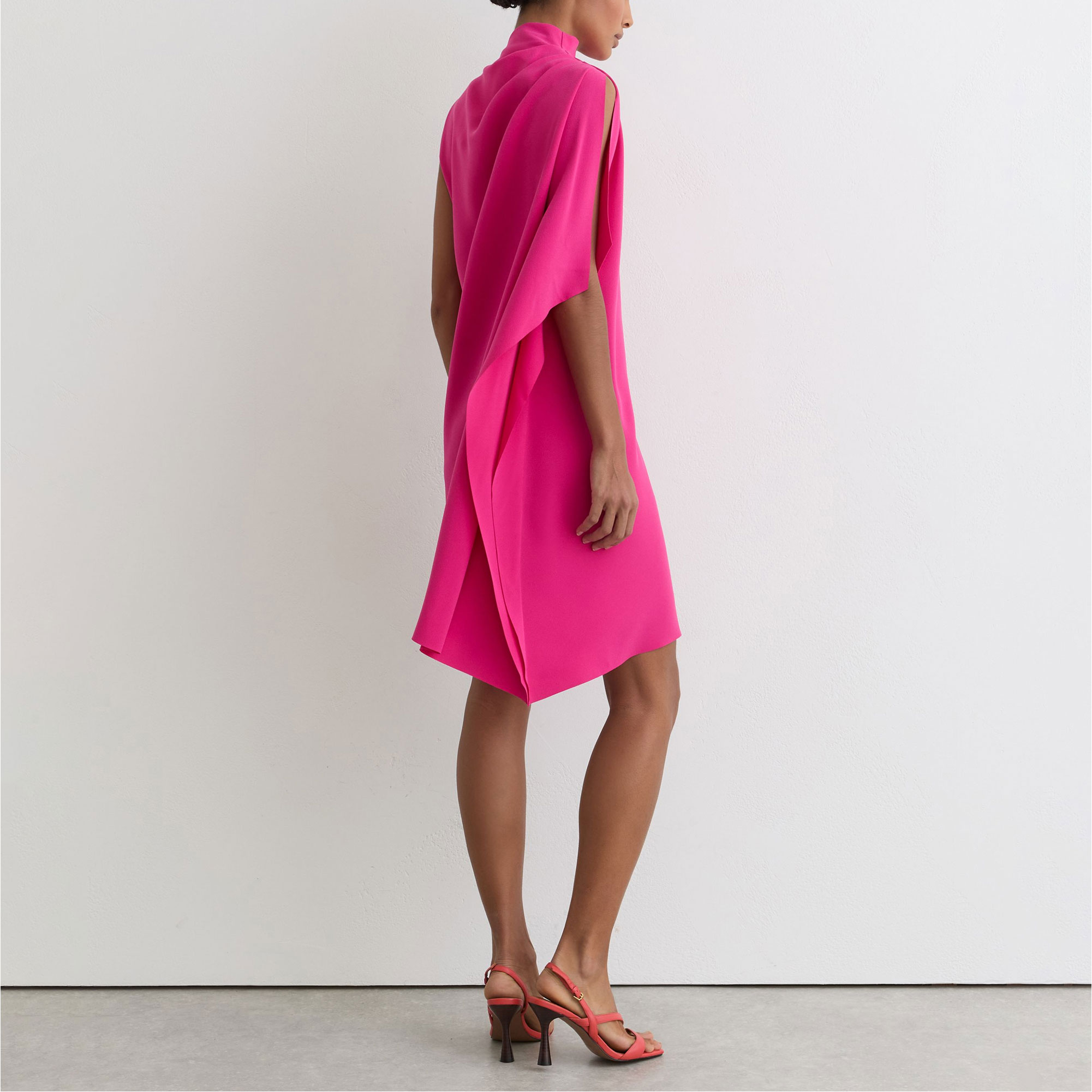 - High neckline, asymmetric silhouette, single split sleeve, draped design, press-stud shoulder fastening