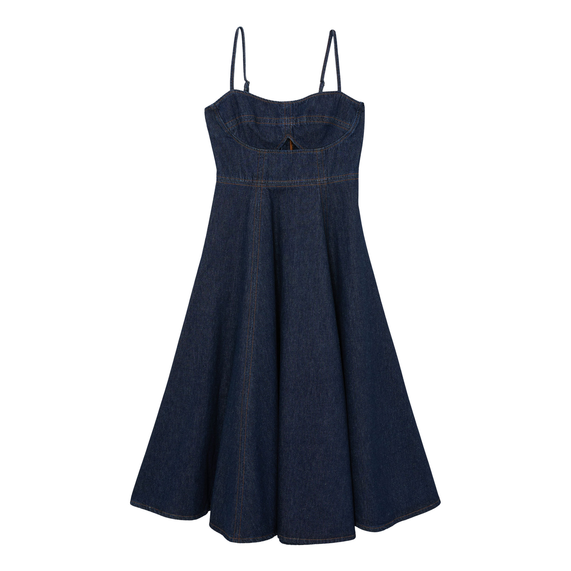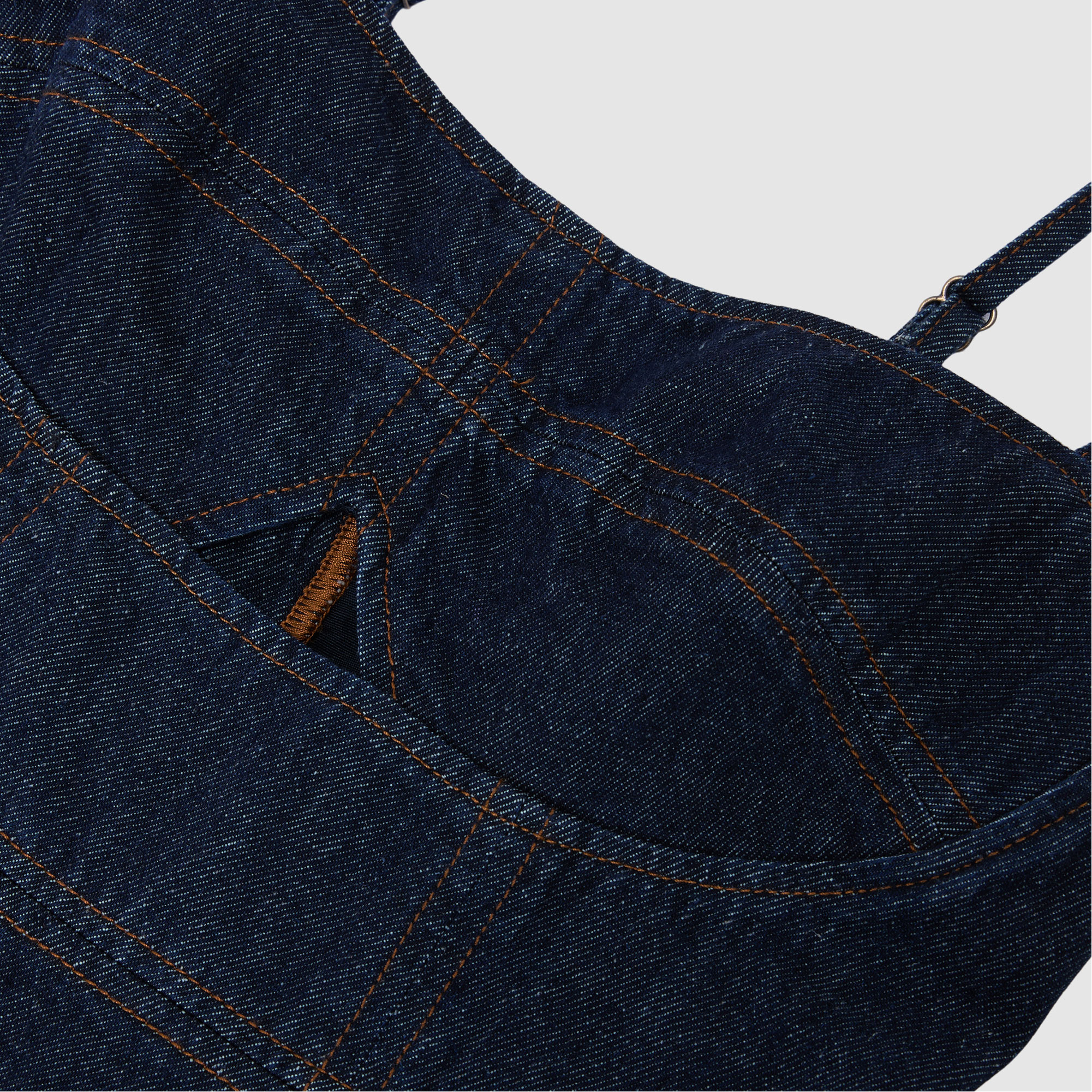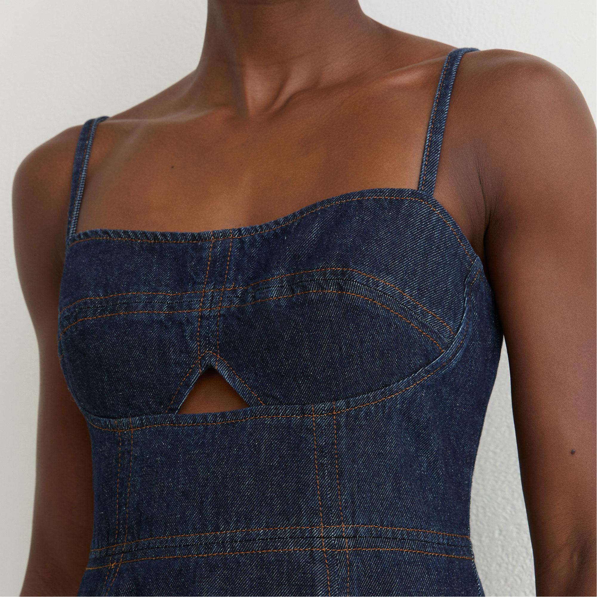- Adjustable shoulder straps, cut-out bust detail, exposed back zip fastening, contrast topstitching