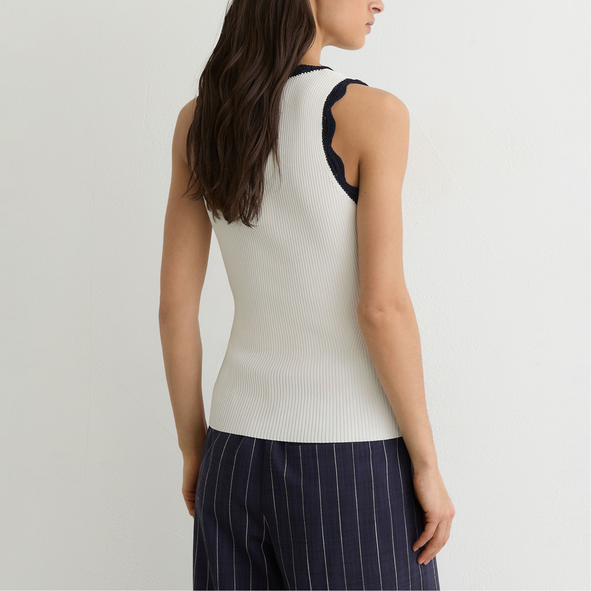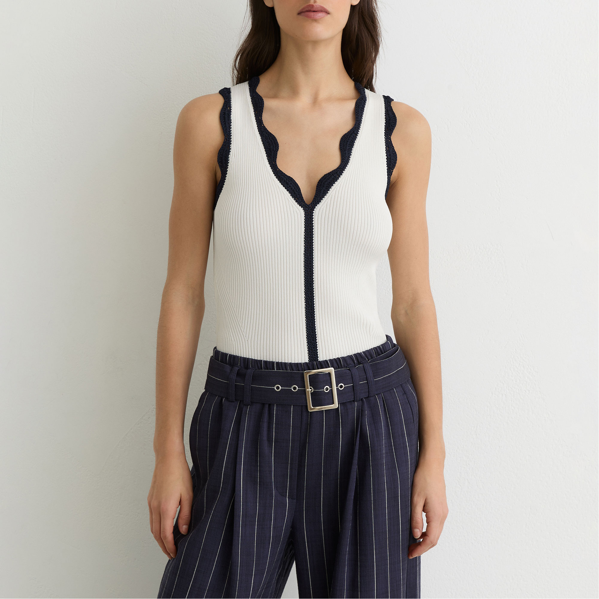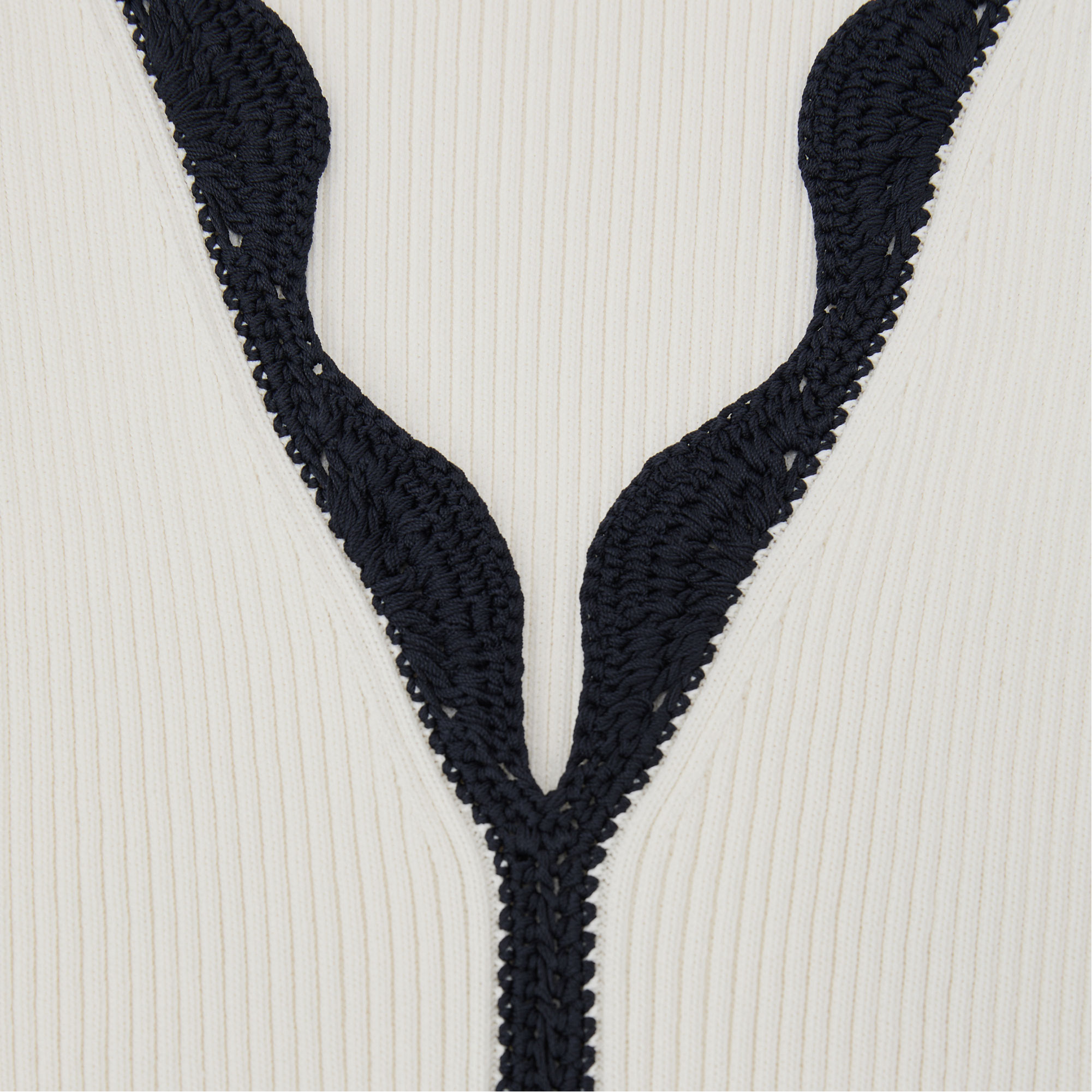 - V-neckline, ribbed knit, scallop trim detailing
