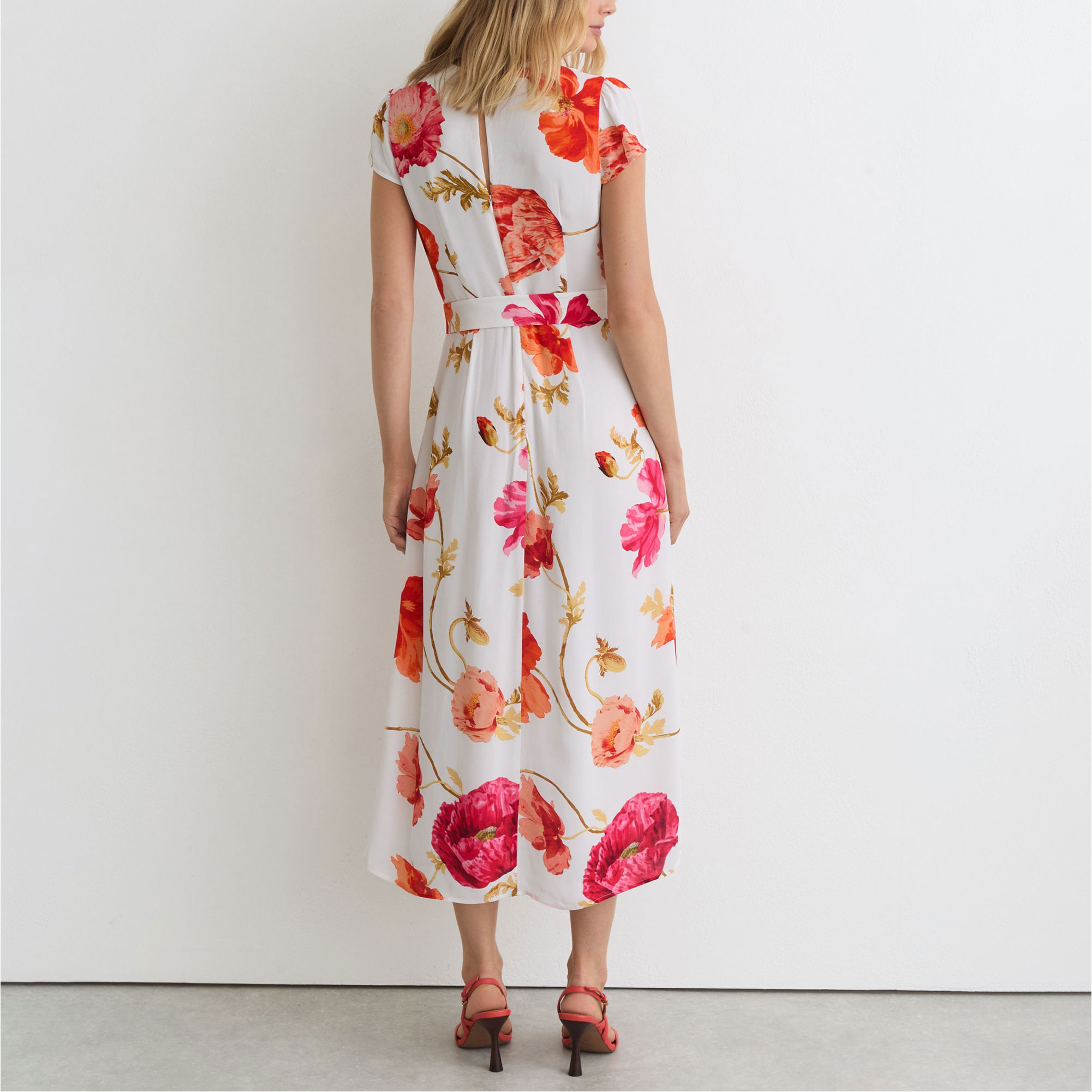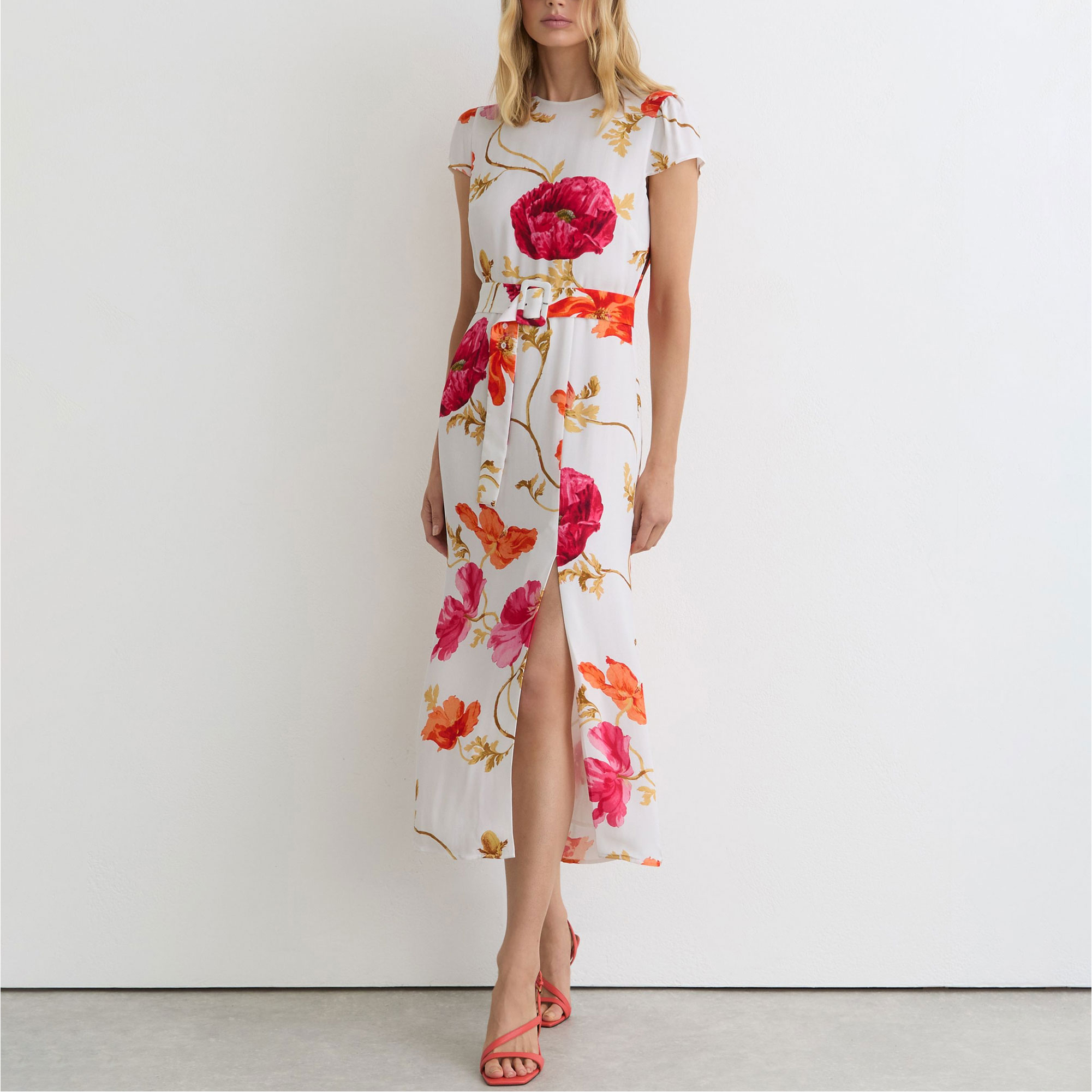 - Round neckline, gathered cap sleeves, waist belt, side slit, keyhole back with concealed zip fastening, floral print