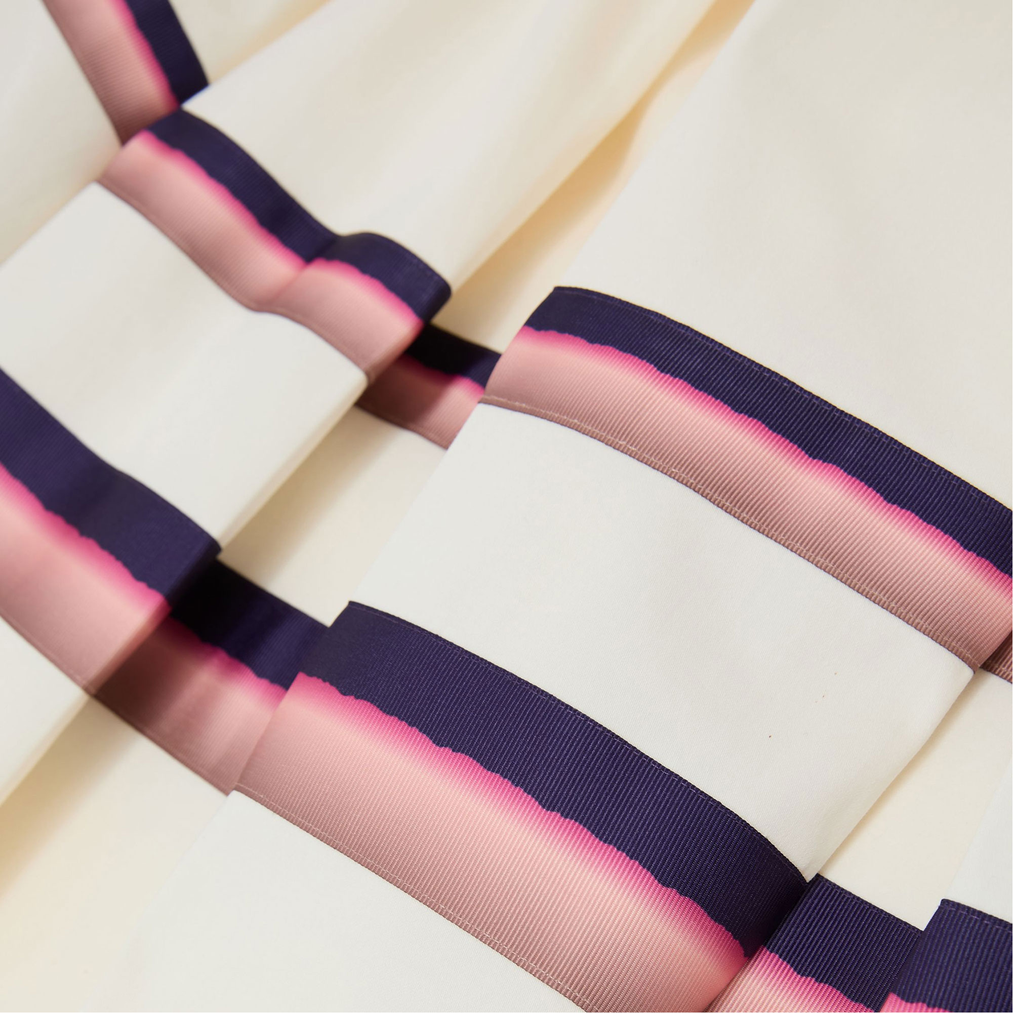 - Buckled waist belt, pleated design, side pockets, concealed fastening, striped trim, stretch fabric