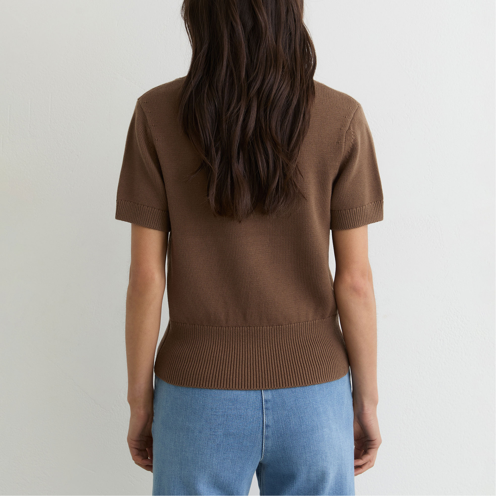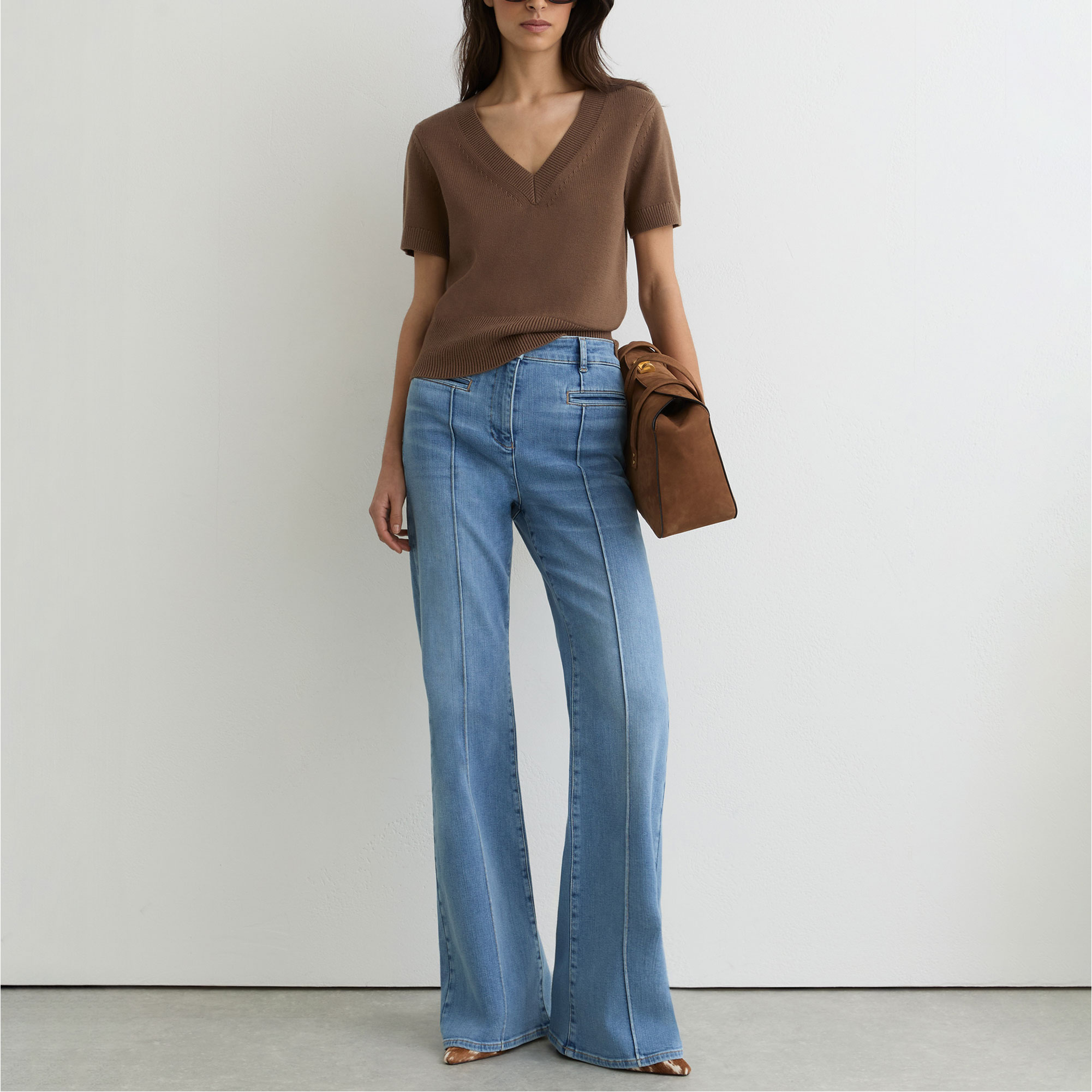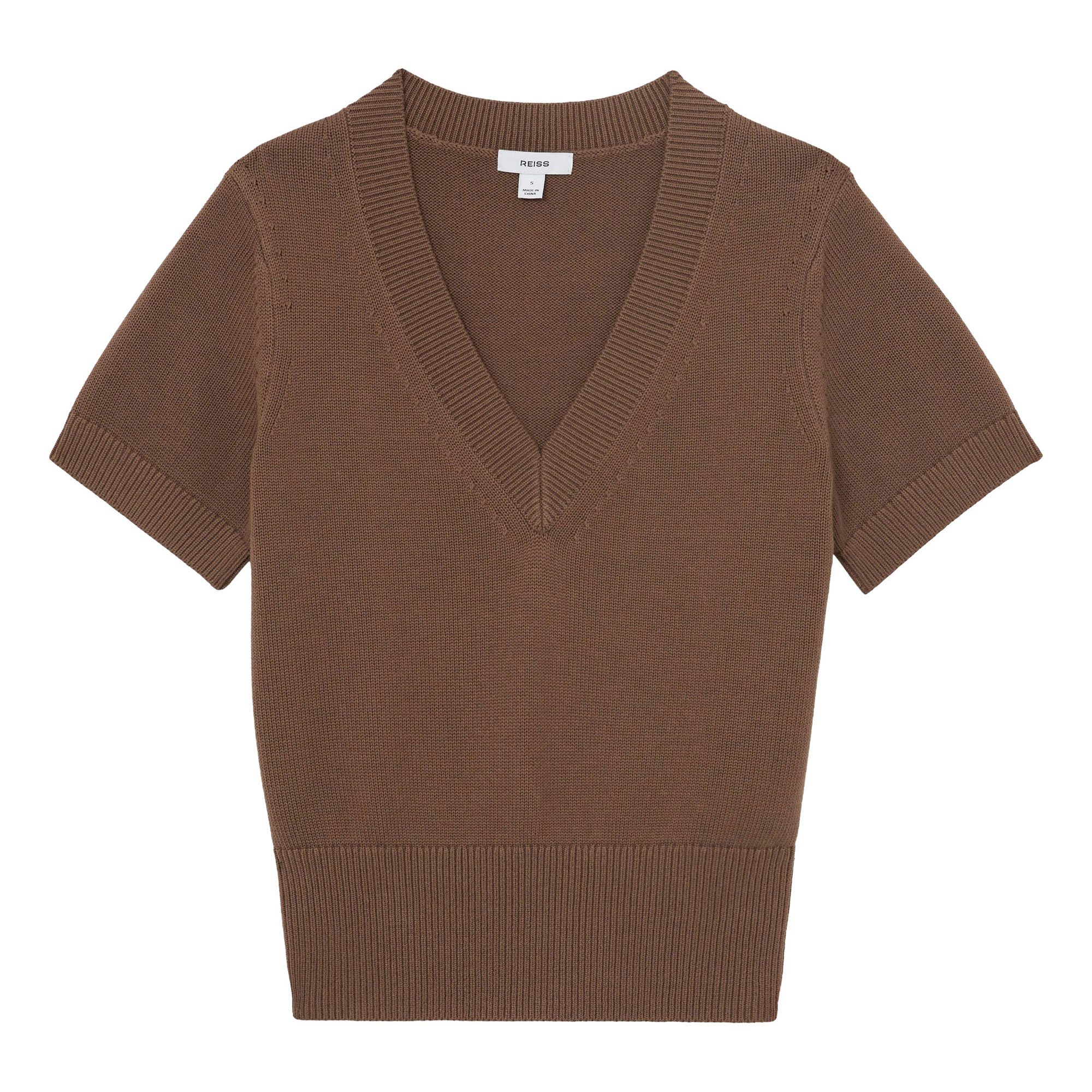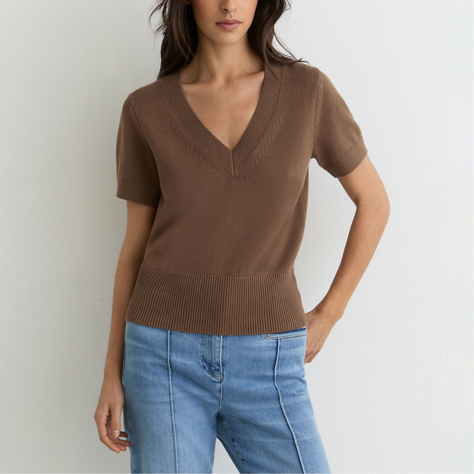 - V-neckline, short sleeves, ribbed trims, fine-knit construction