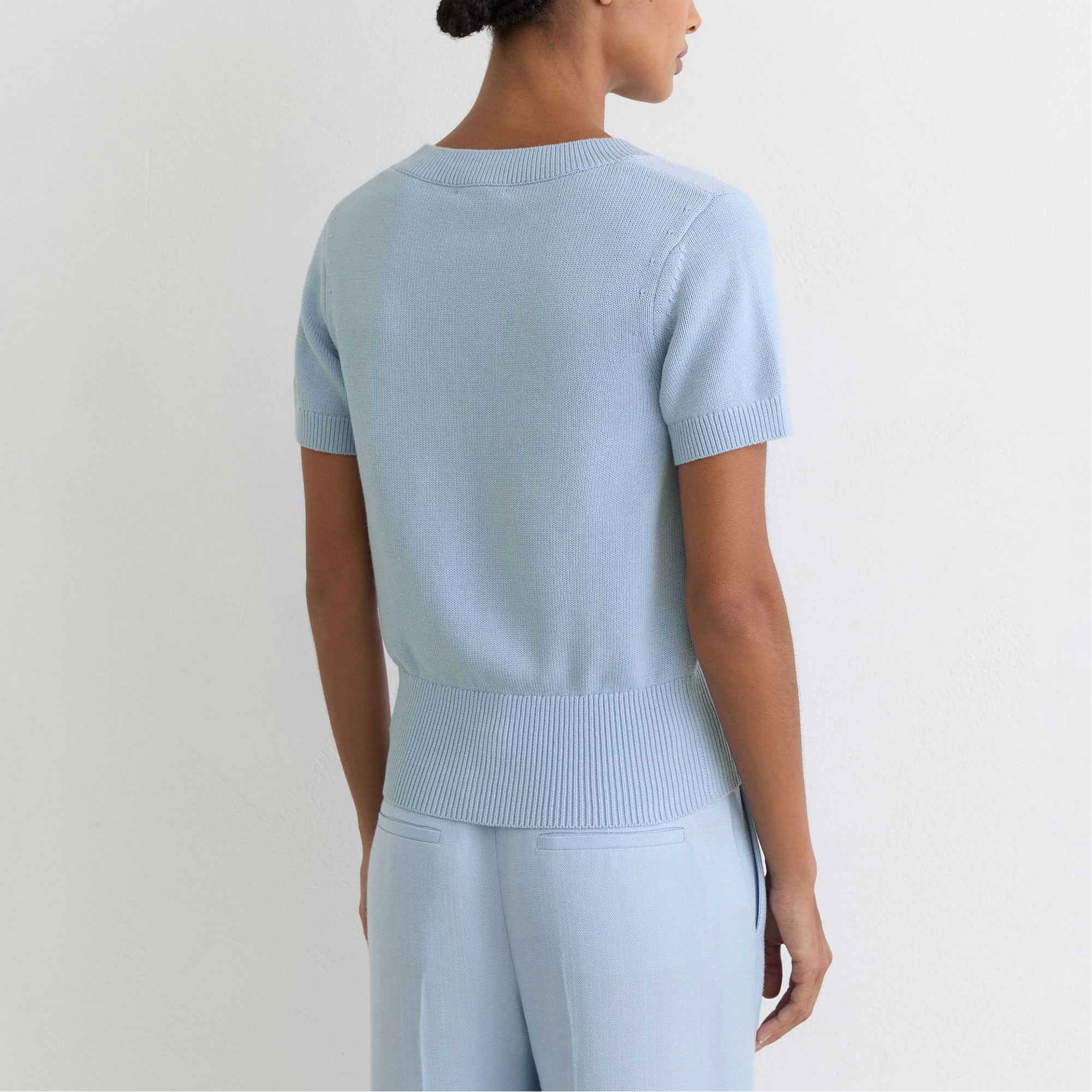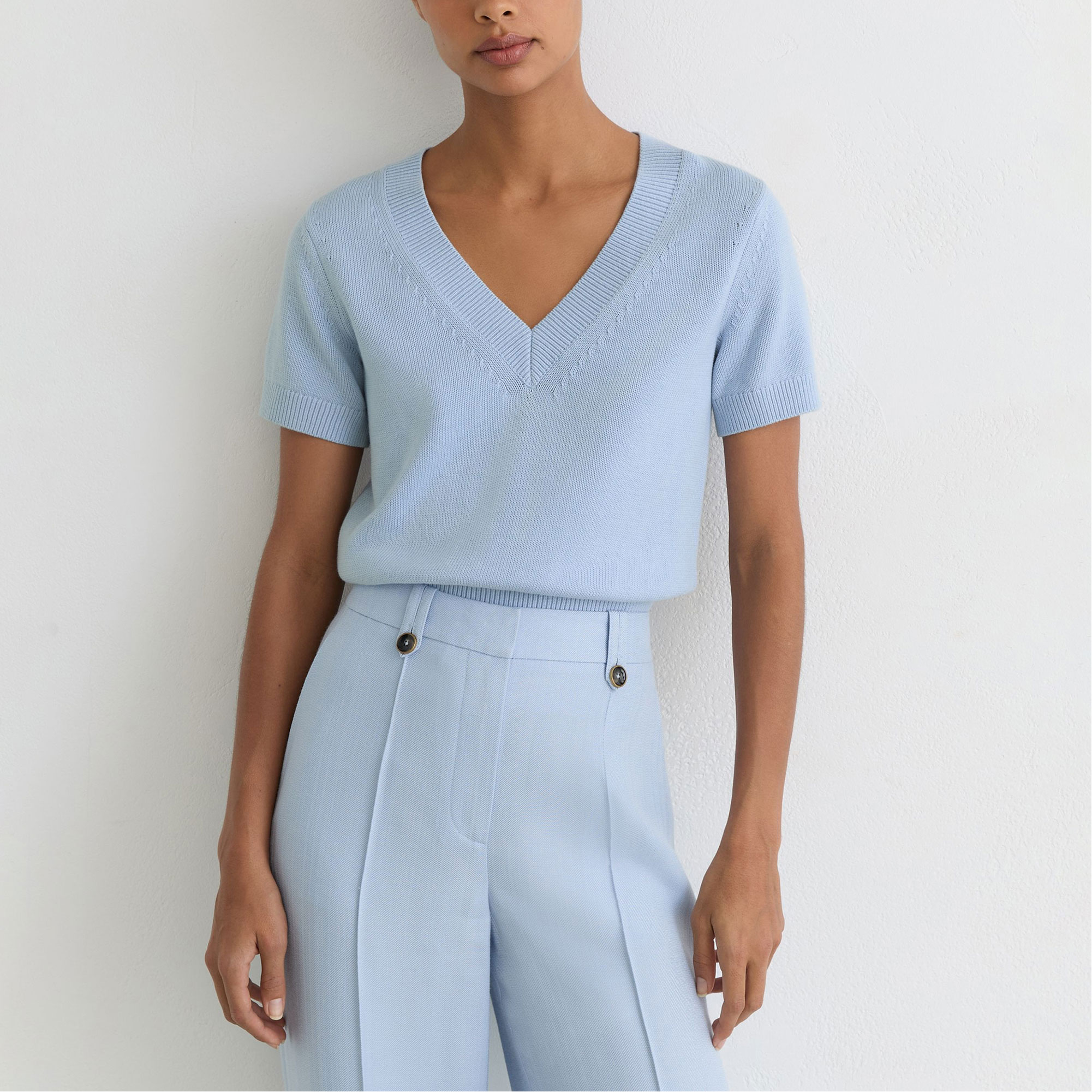 - V-neckline, short sleeves, ribbed trims, fine-knit construction