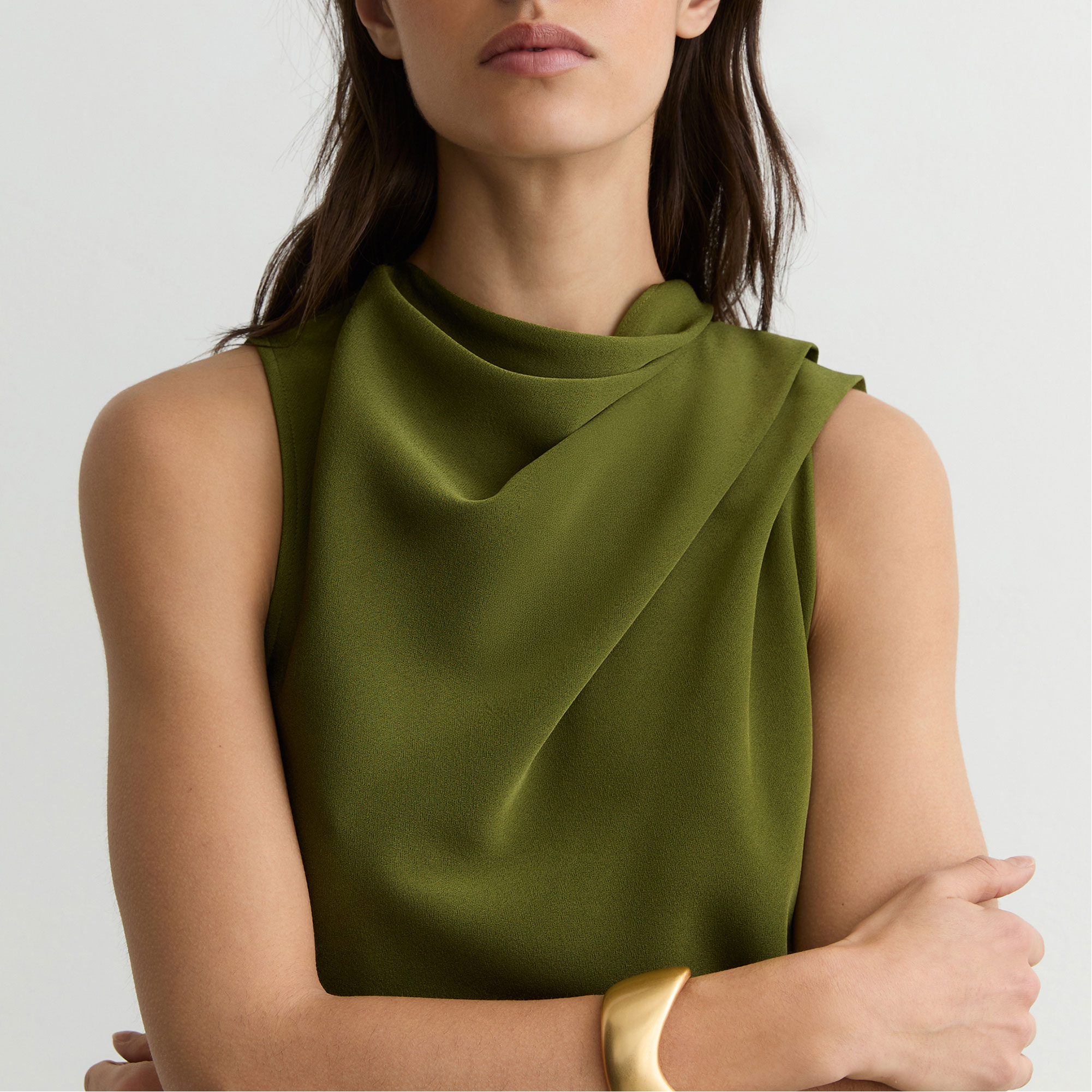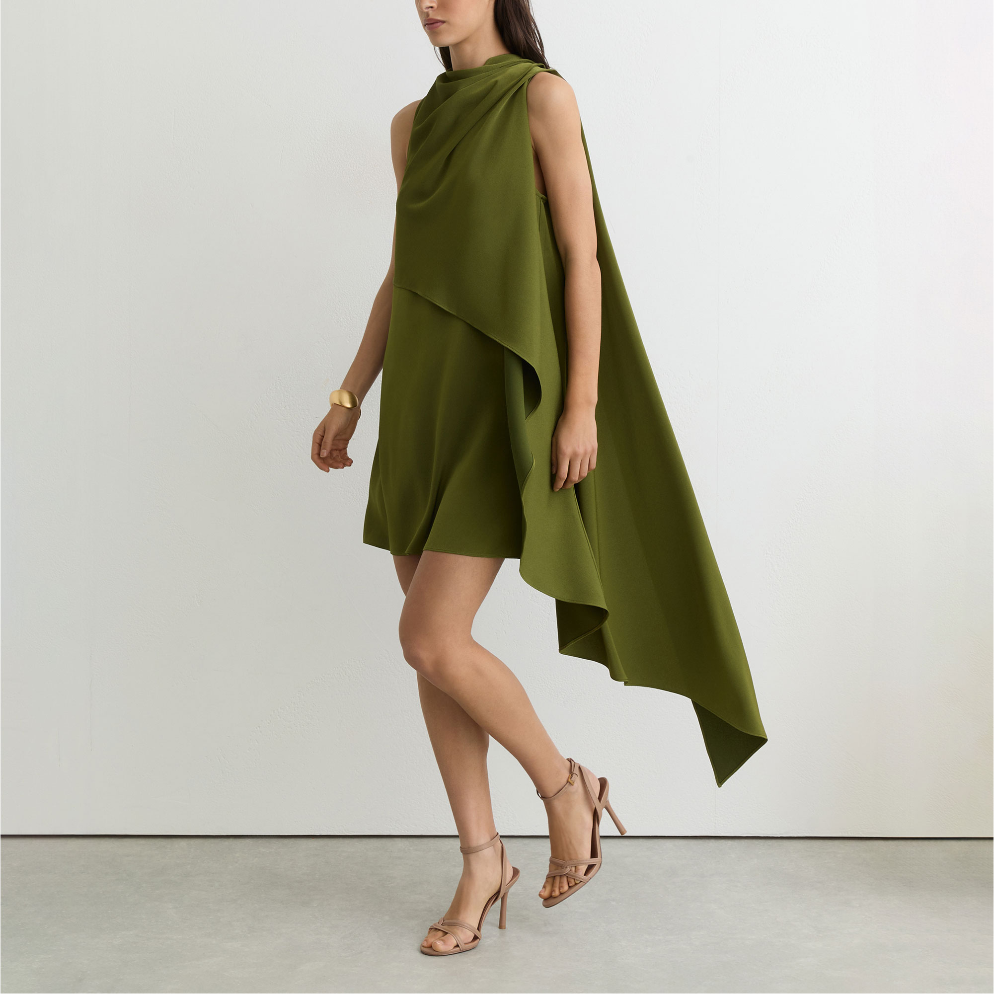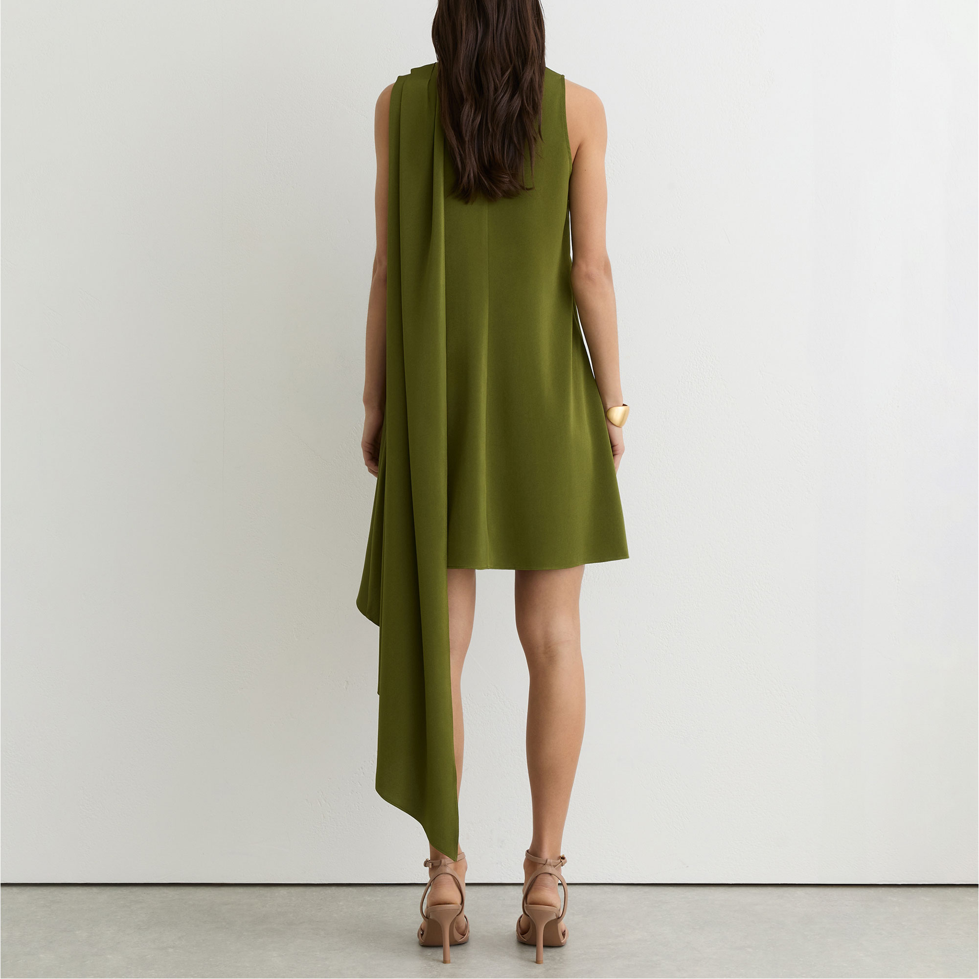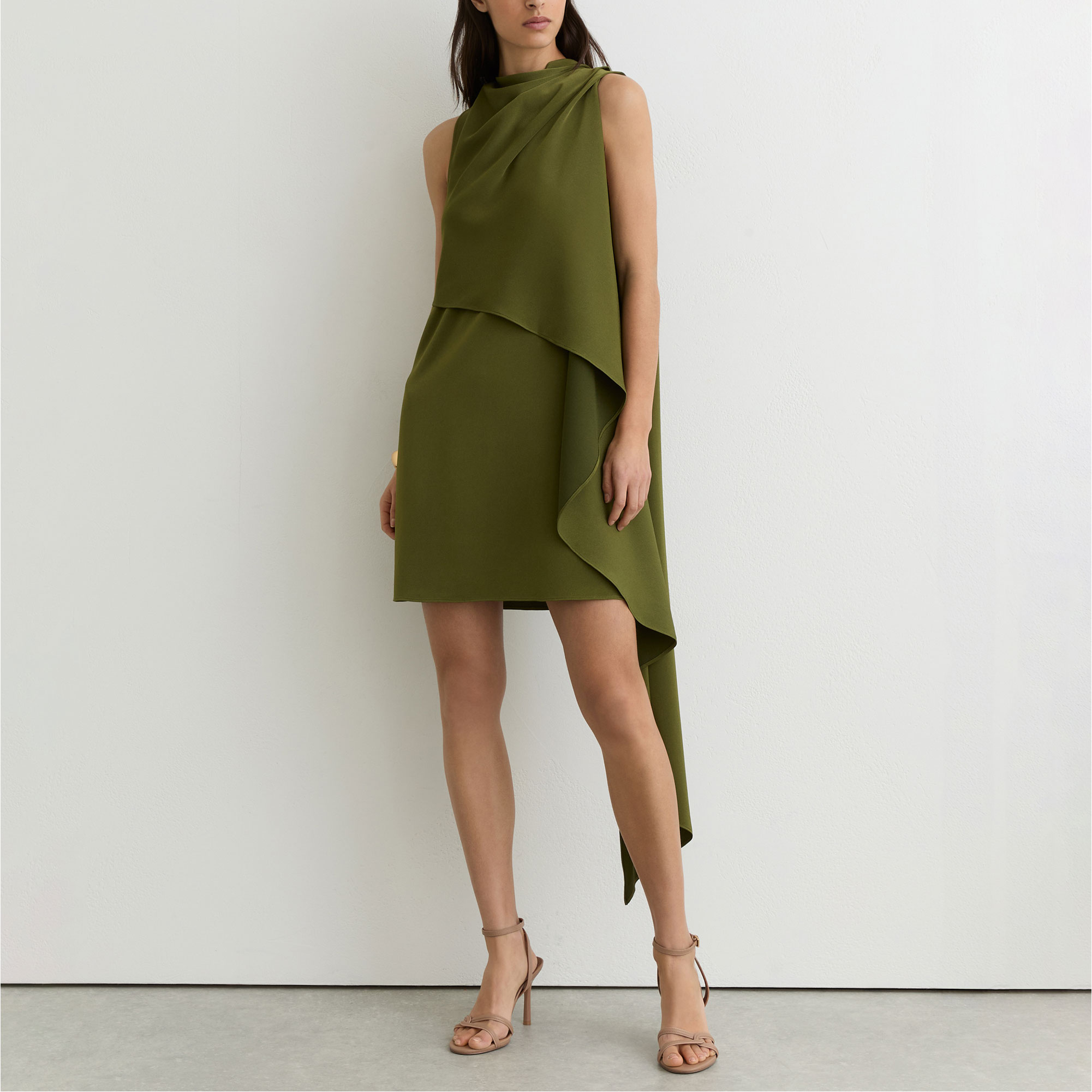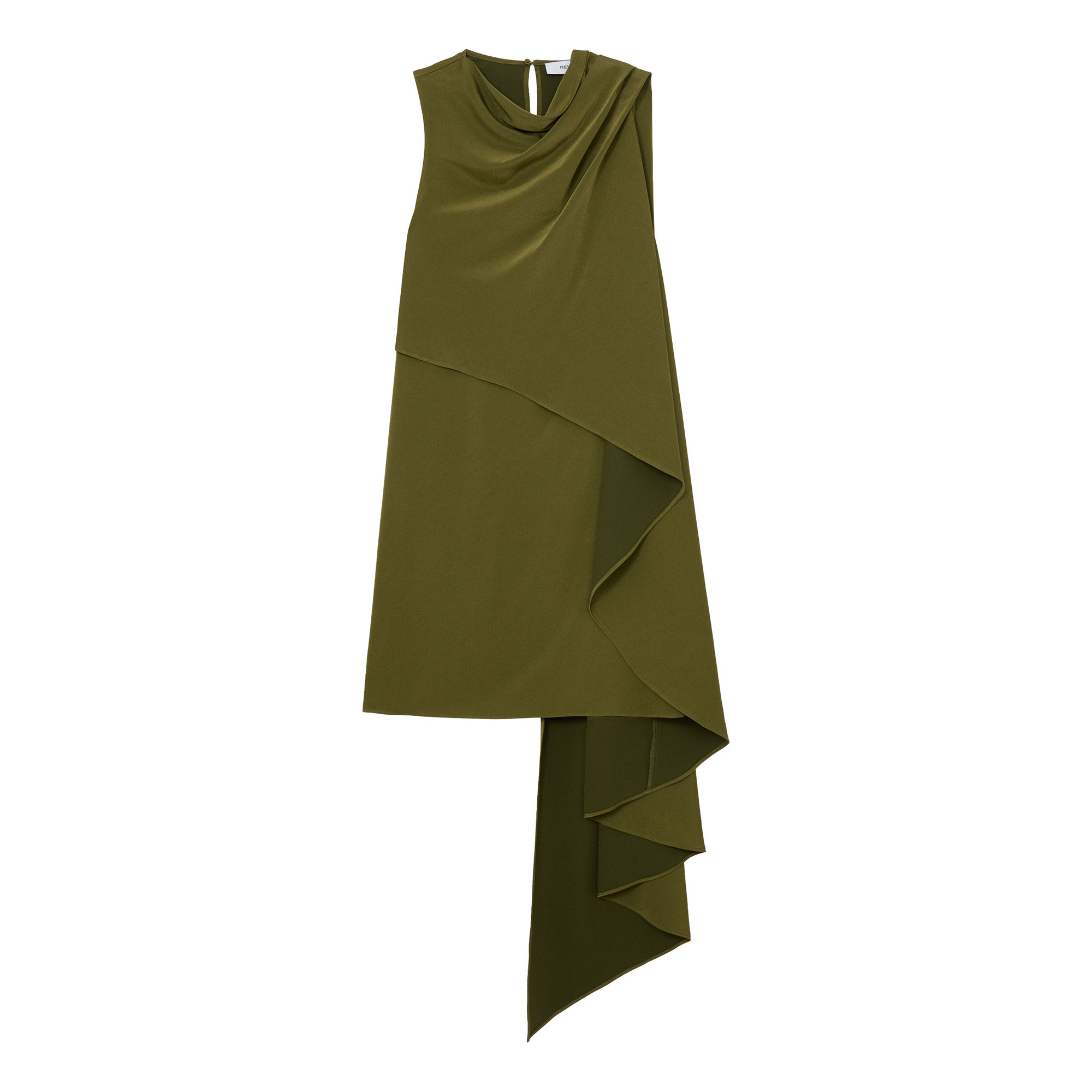 - High draped neckline, sleeveless, layered design, asymmetric draping, button keyhole to reverse