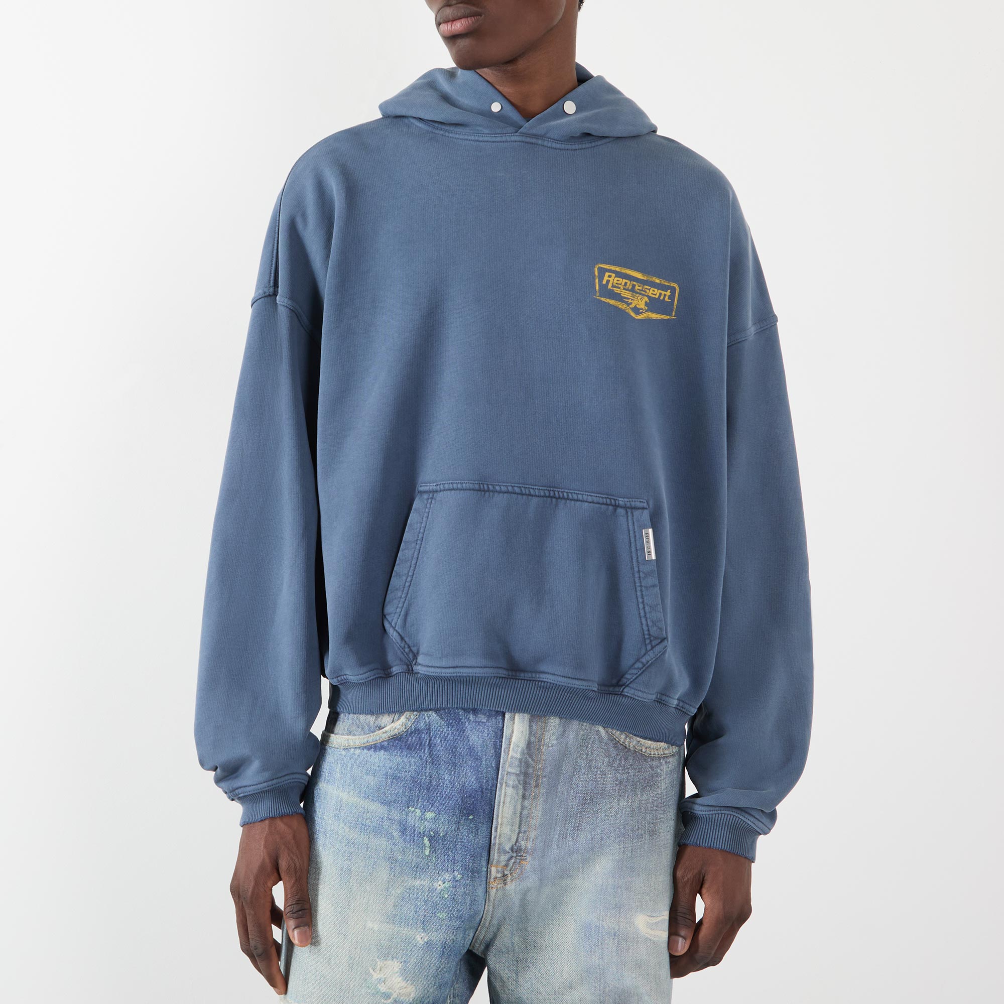 - Hood with snap button, dropped shoulders, long sleeves, kangaroo pocket, straight hem, ribbed trims, logo graphic on the chest, enlarged logo graphic on the back, logo hardware, washed finish