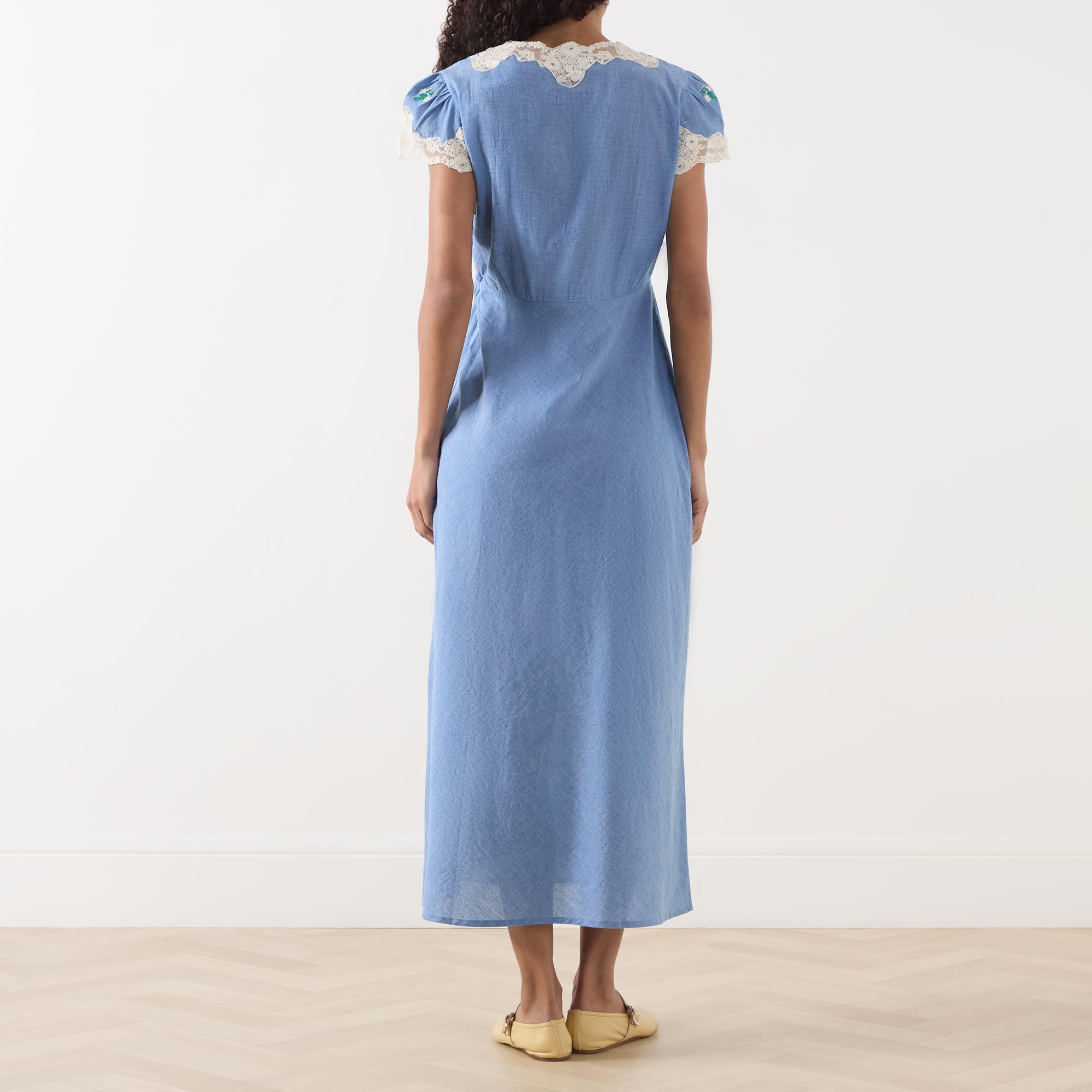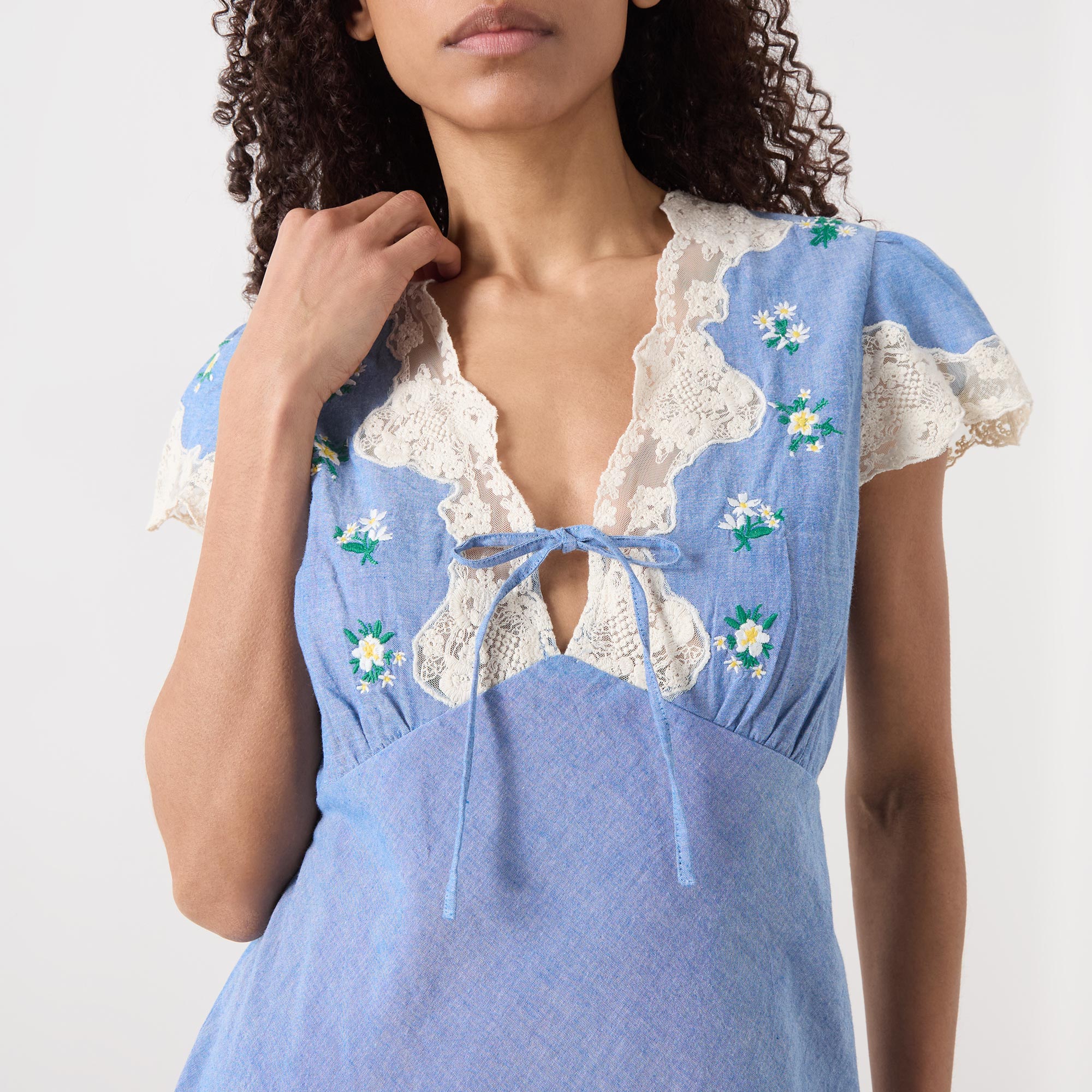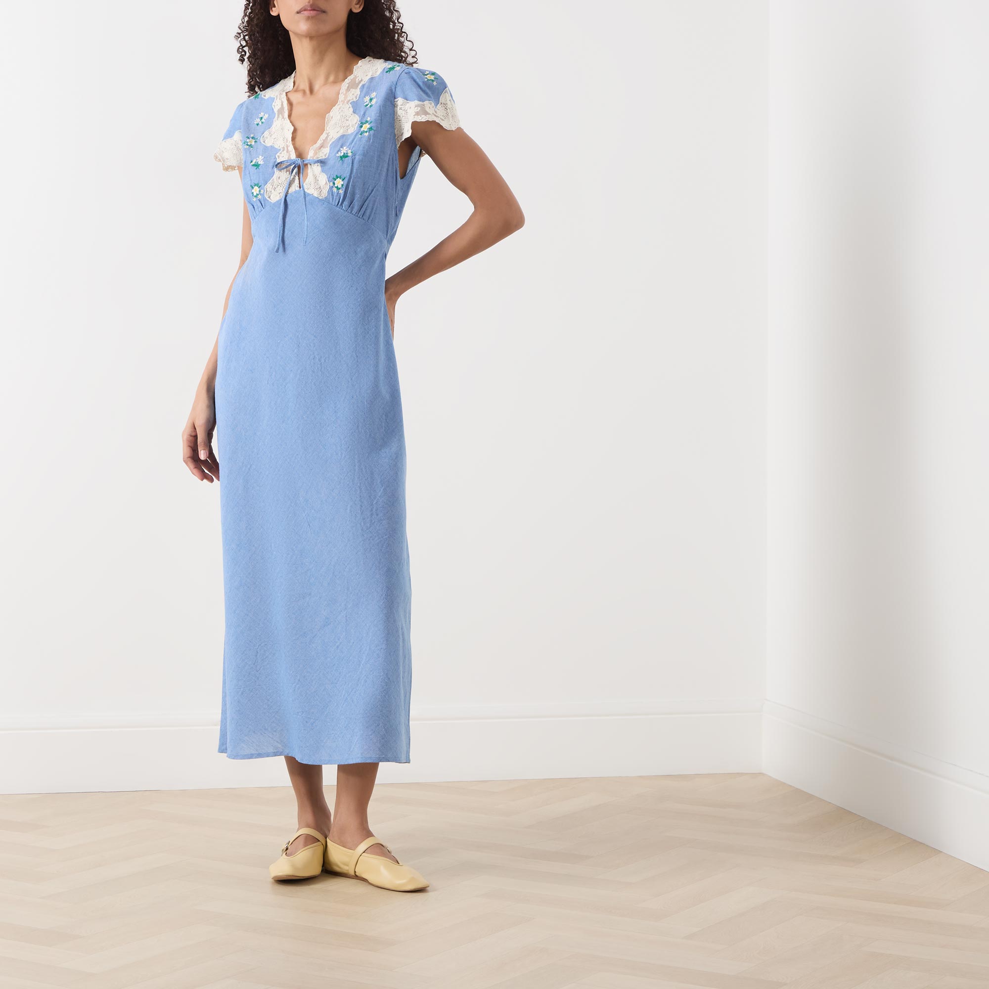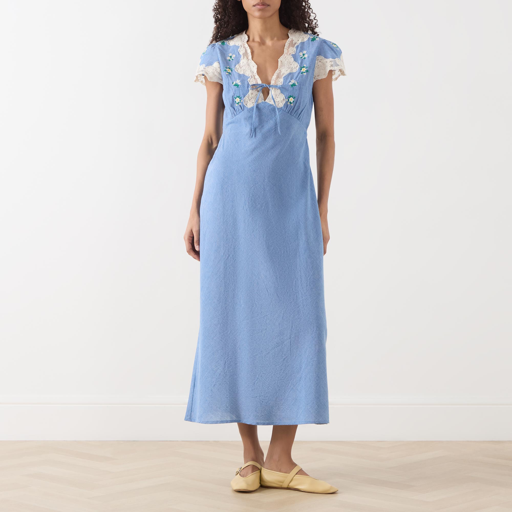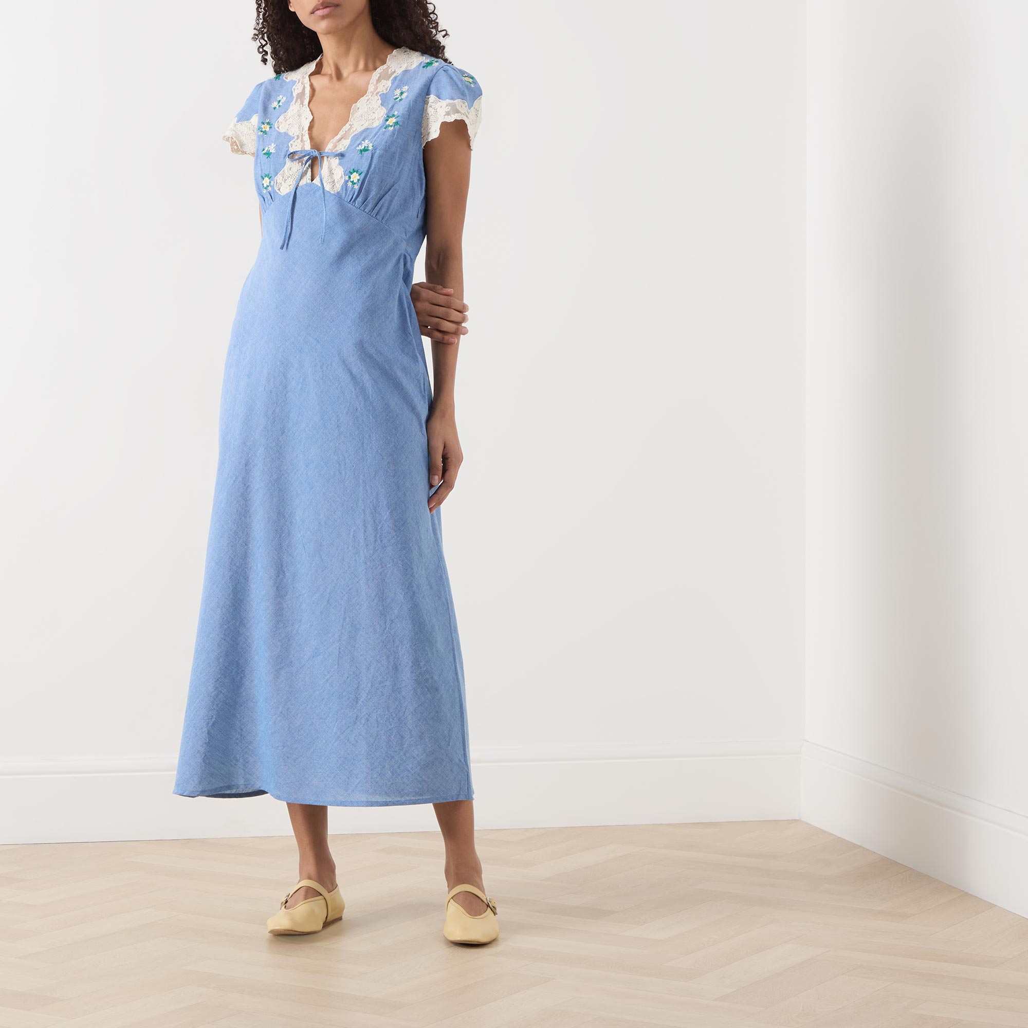 • V-neckline, puff shoulders, short sleeves, front tie fastening, lace trims, darted under bust, flared skirt, embroidered floral detailing, midi length