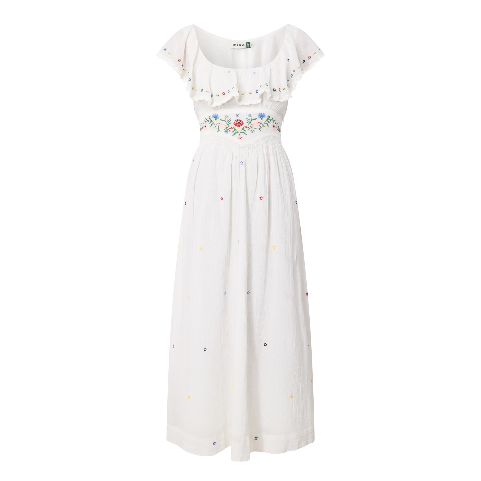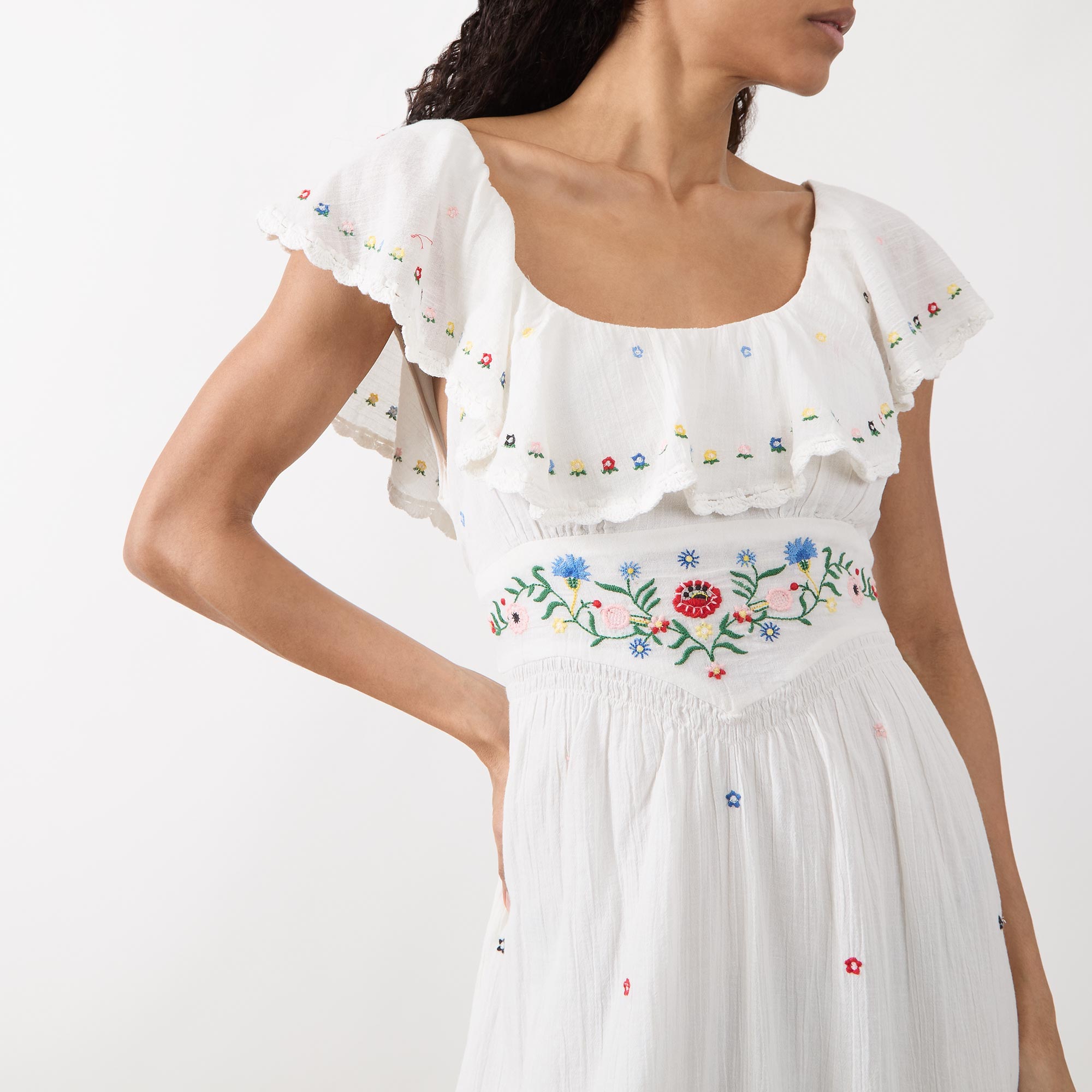 - Short flutter sleeves, scoop neckline, shirred bodice, tie-fastening back detail, floral embroidery, flared silhouette, midi length, smooth fabric