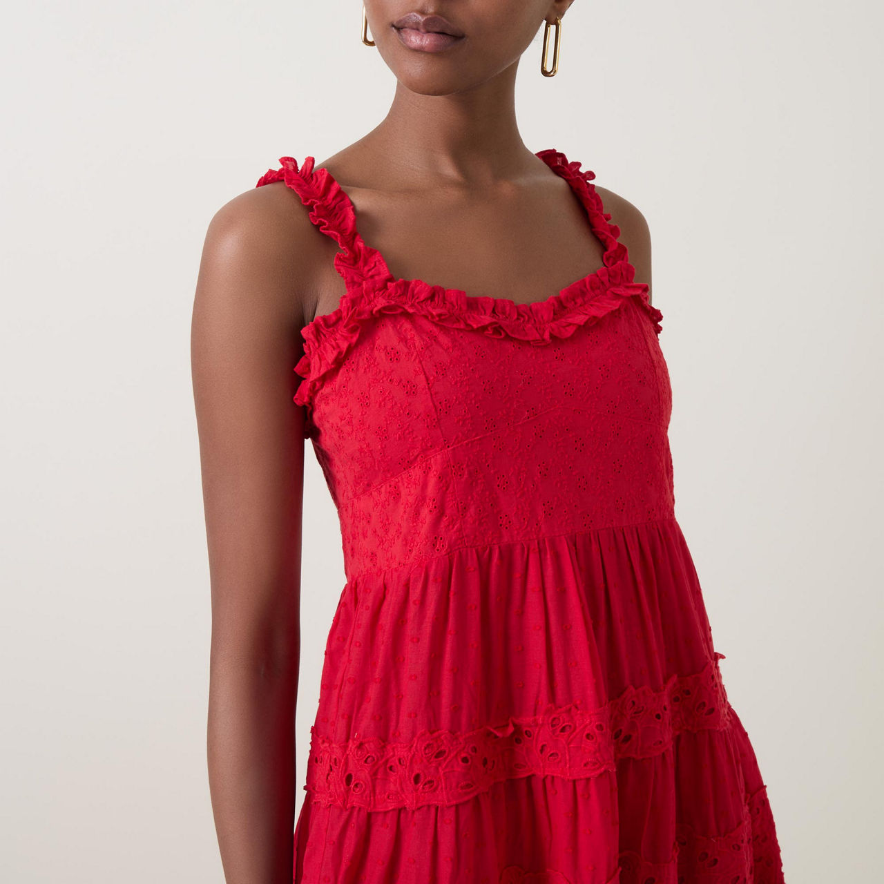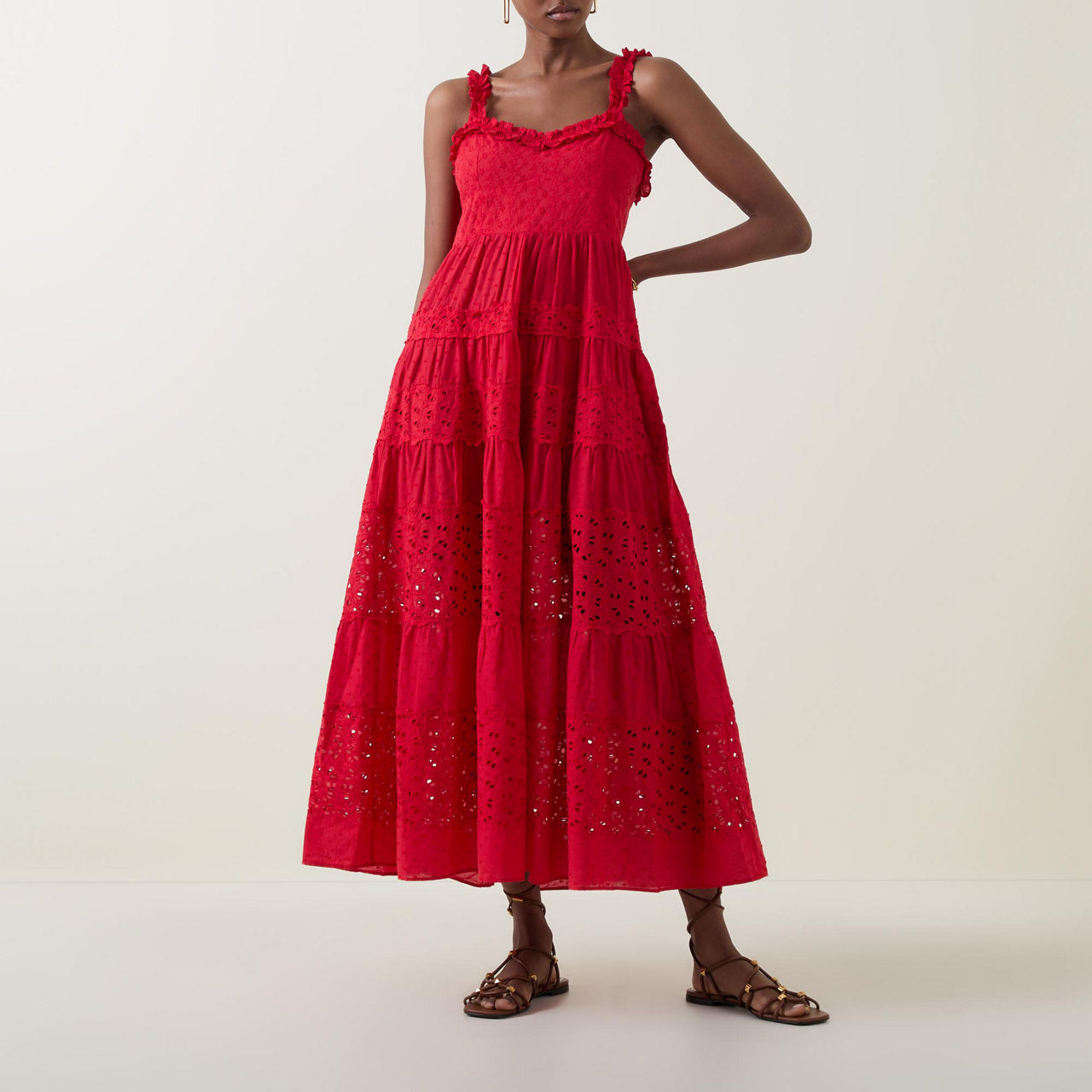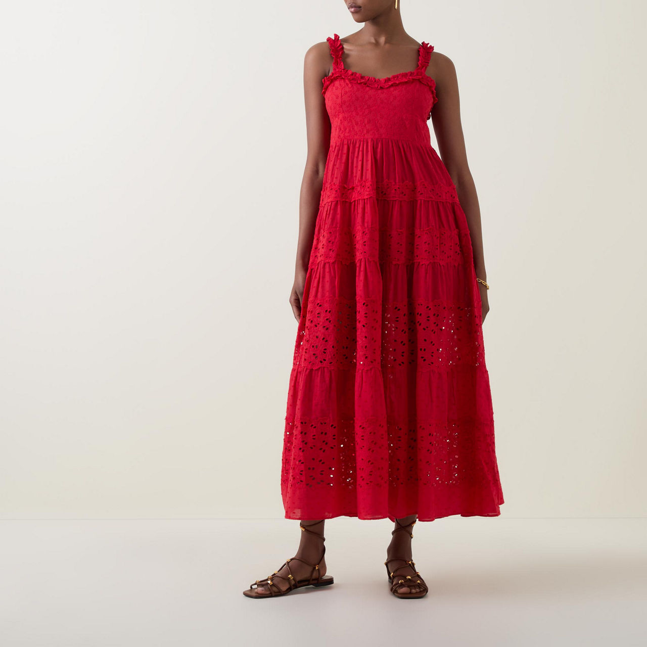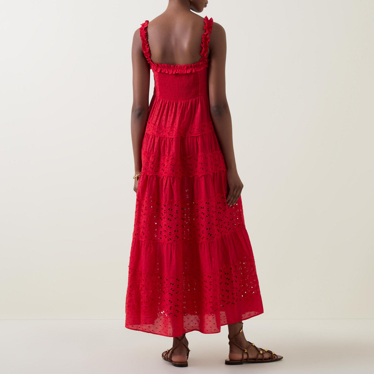 - Sweetheart neckline, ruffle details, thin straps, tiered skirt, open-work embroidered details, shirred panel at back