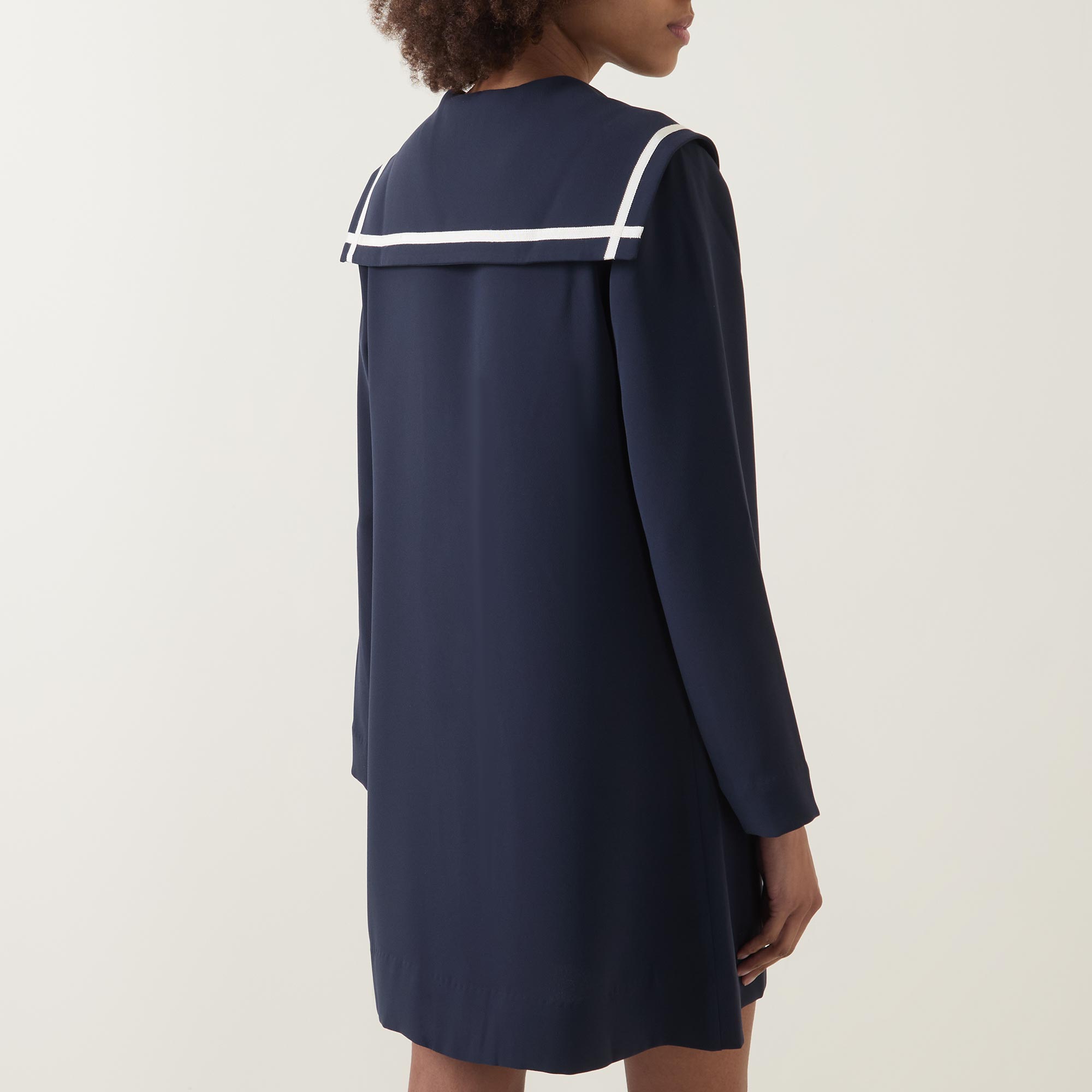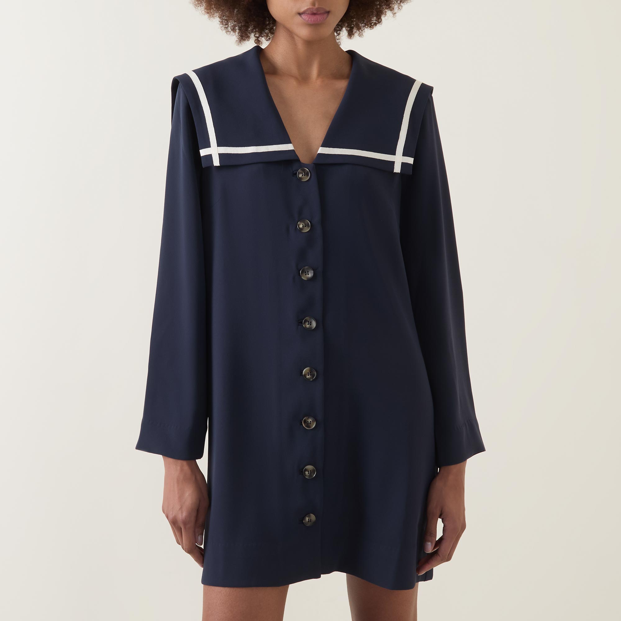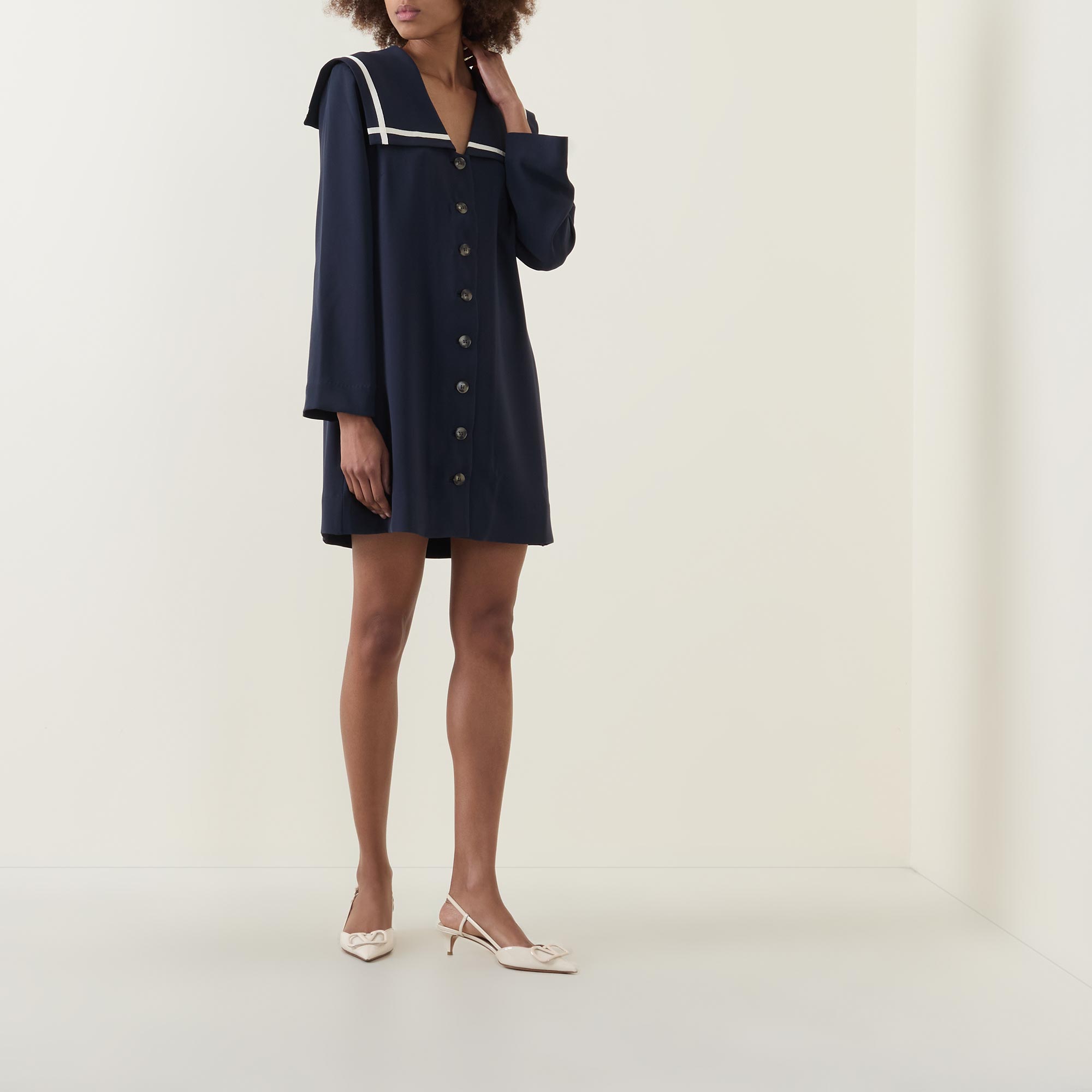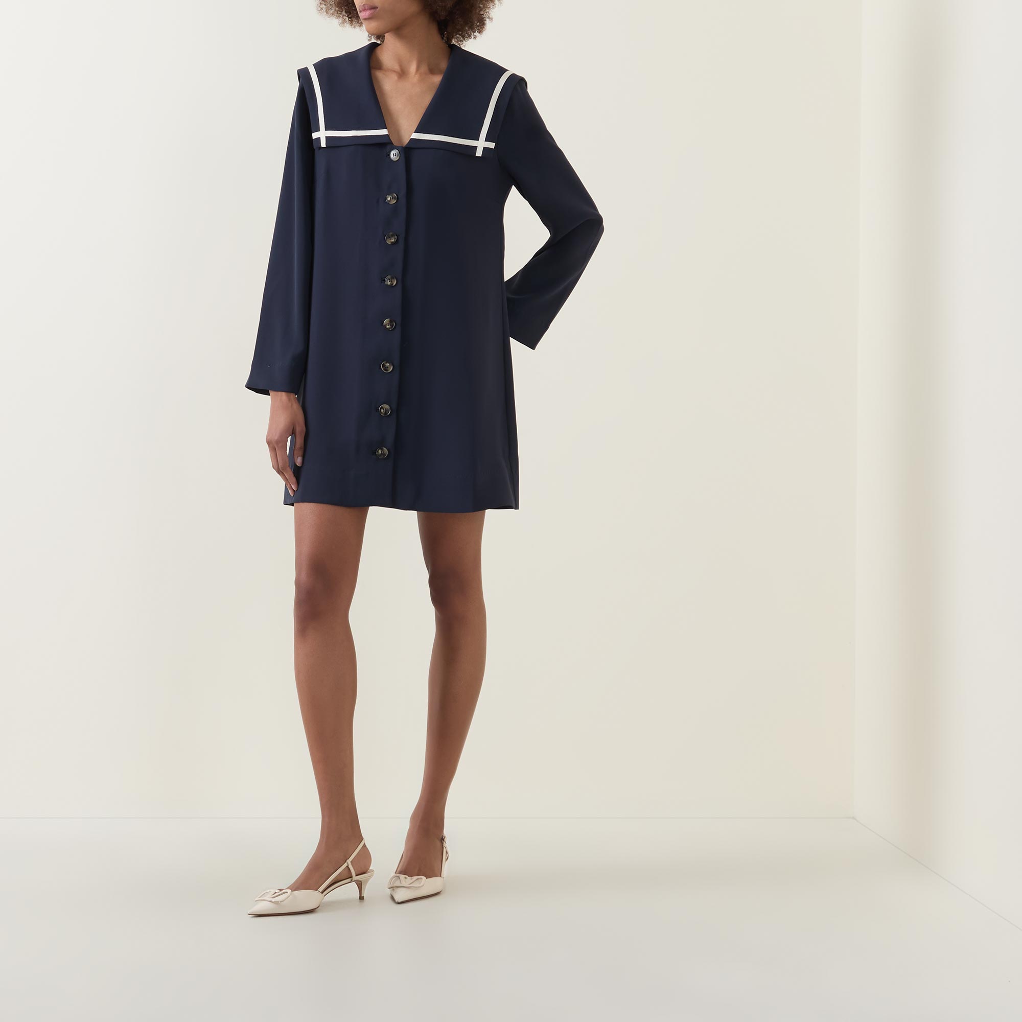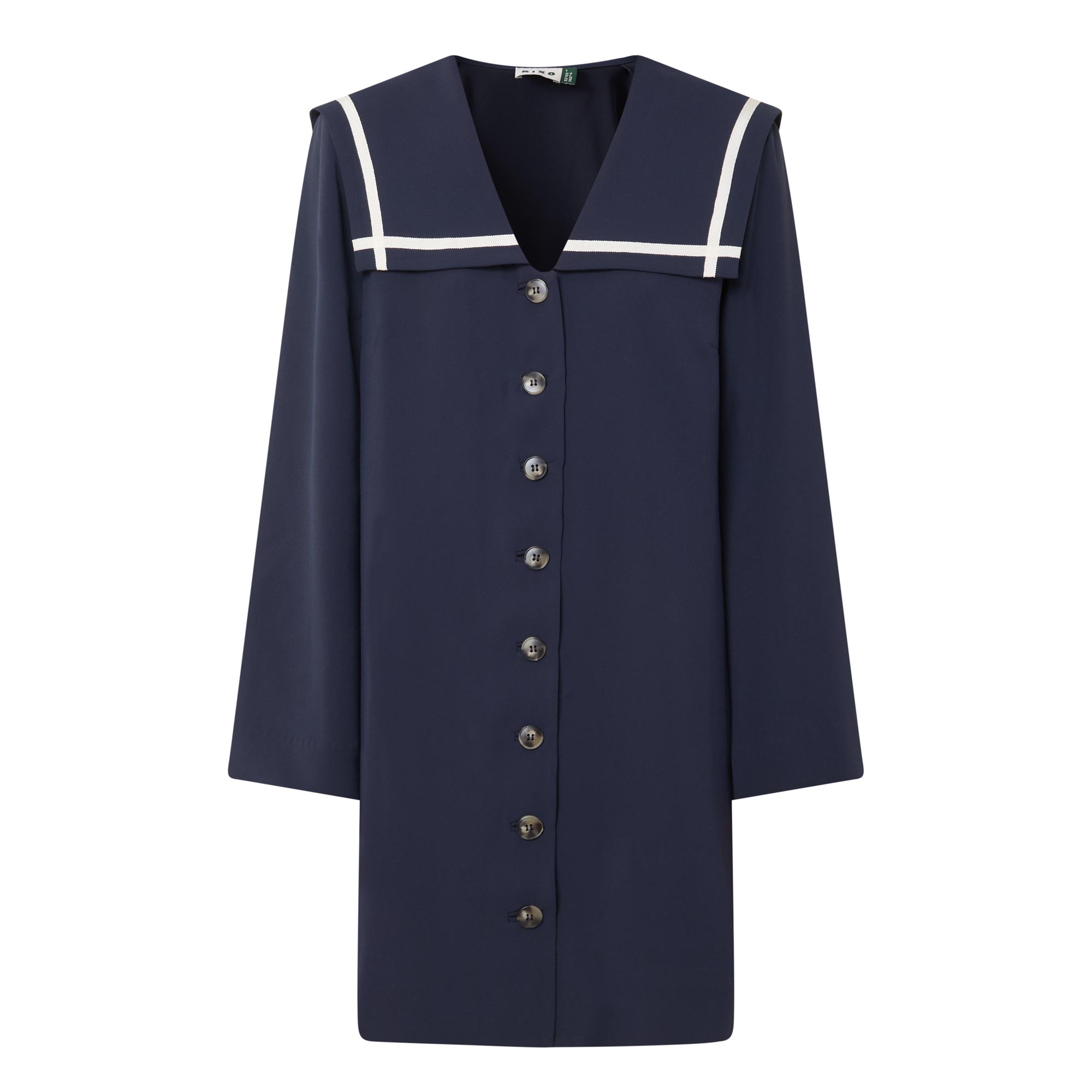 - Exaggerated collar, long sleeves, button fastening, contrast details, mini length
