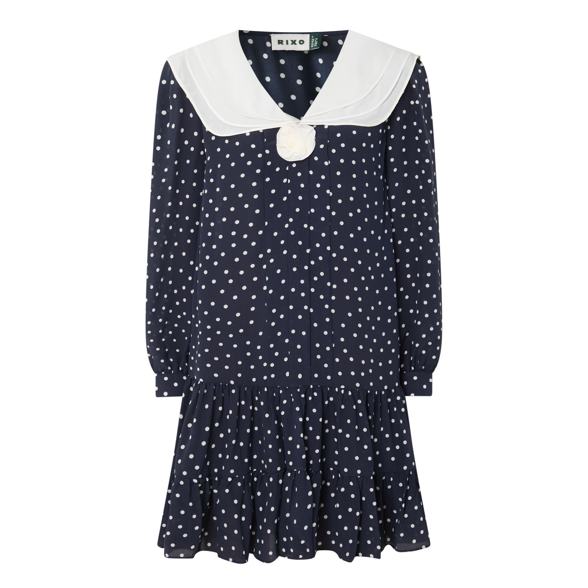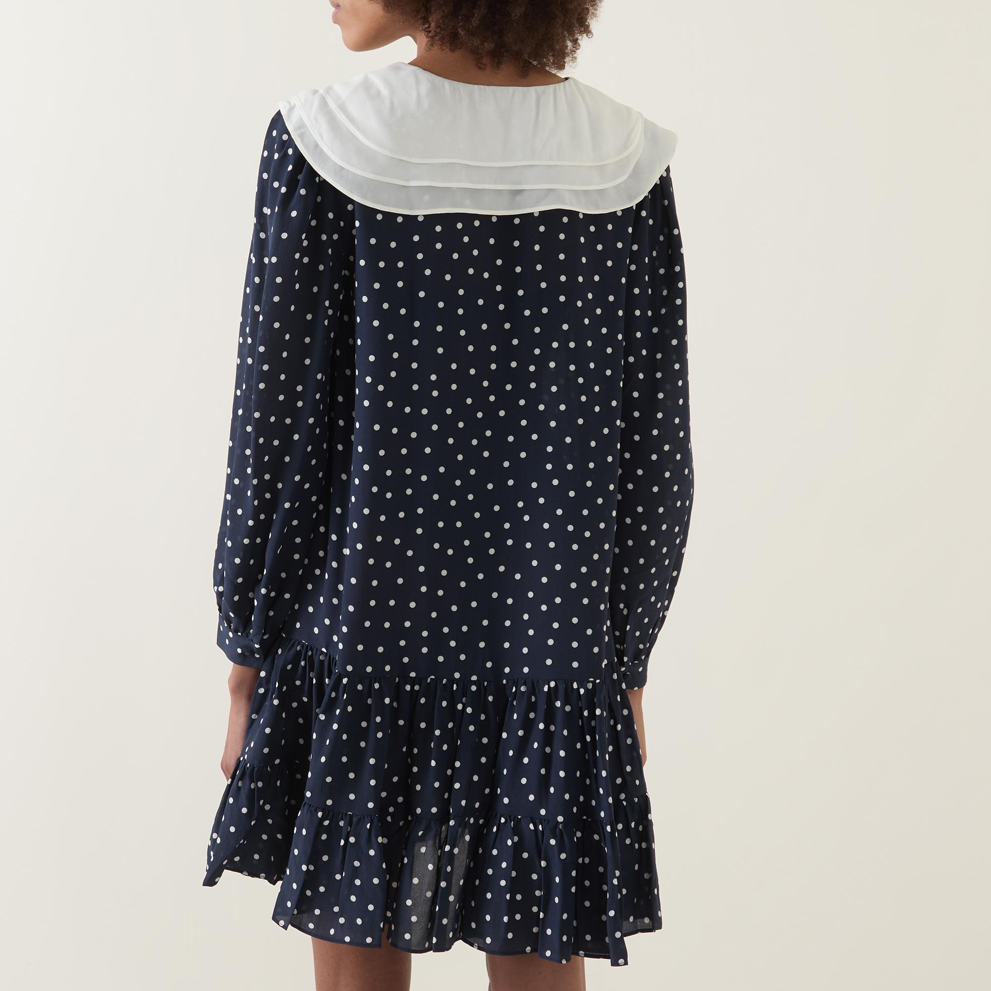 - Dotted print, vintage-inspired collar, long sleeves, mini length, floral detail on chest, ruffled skirt