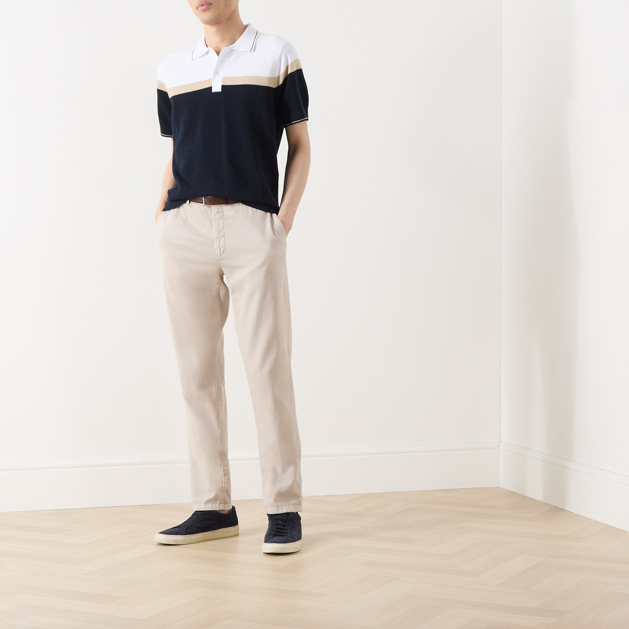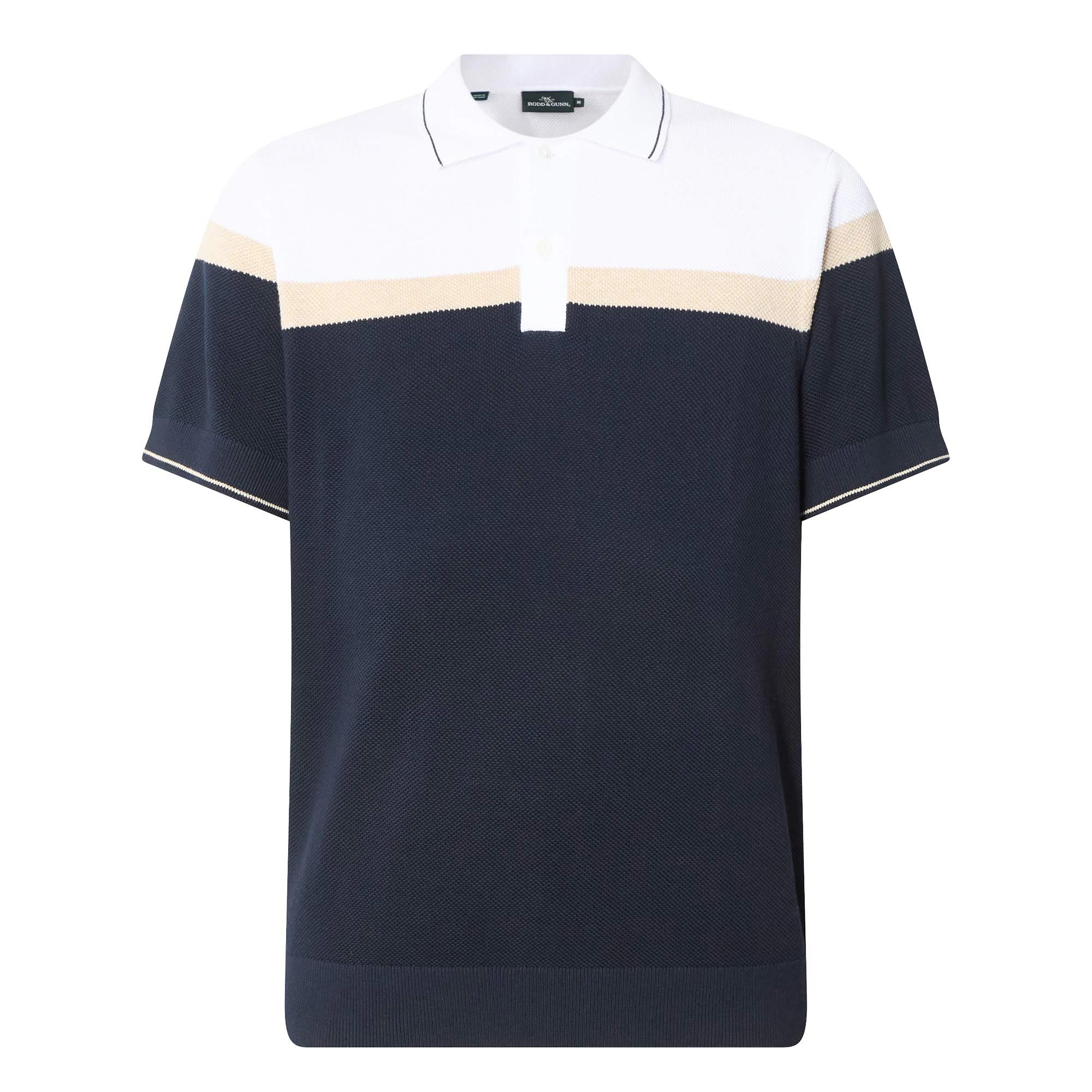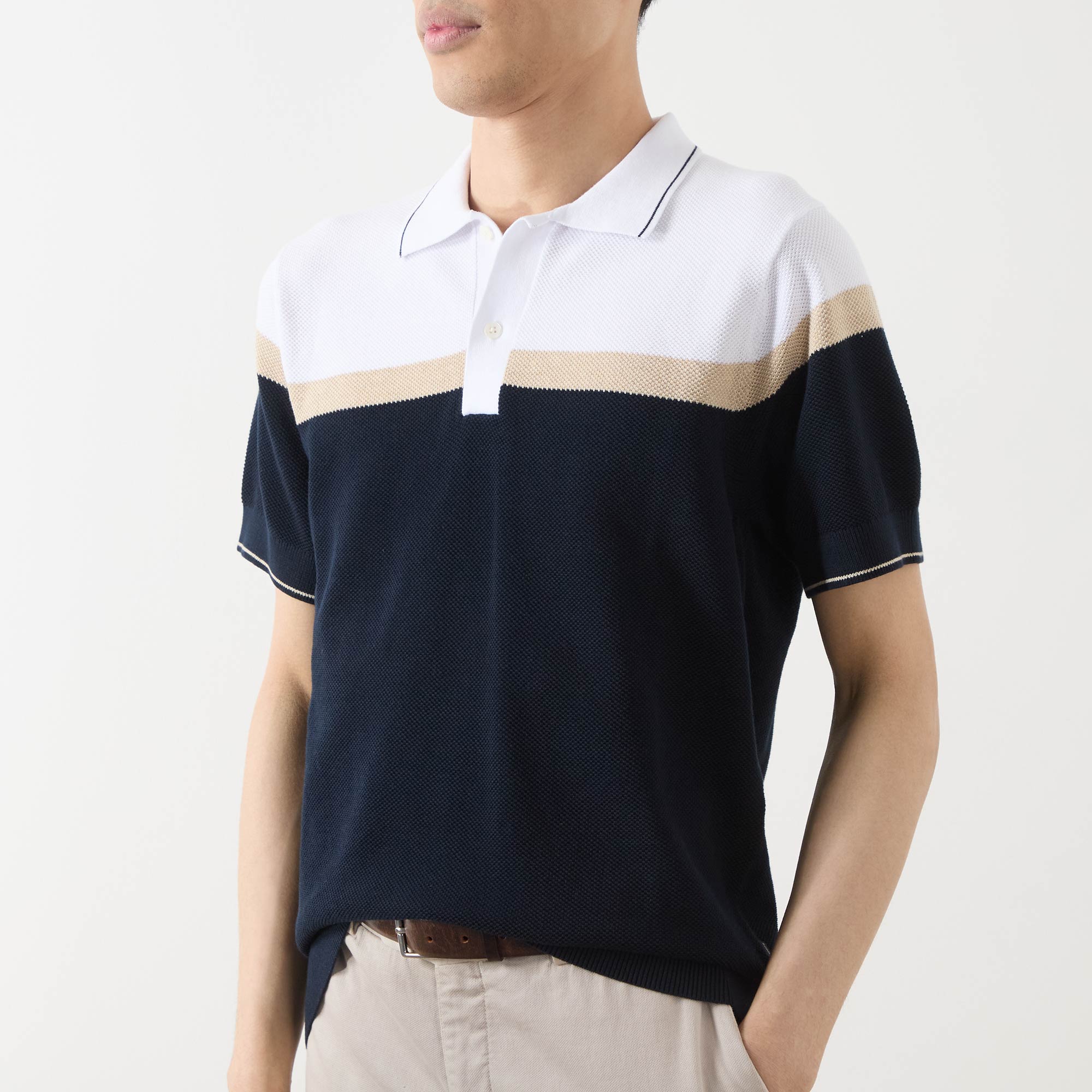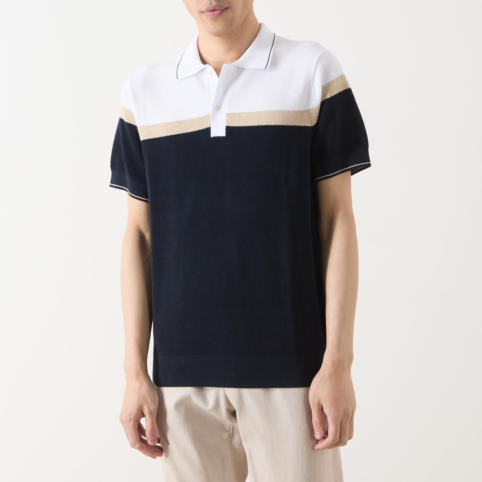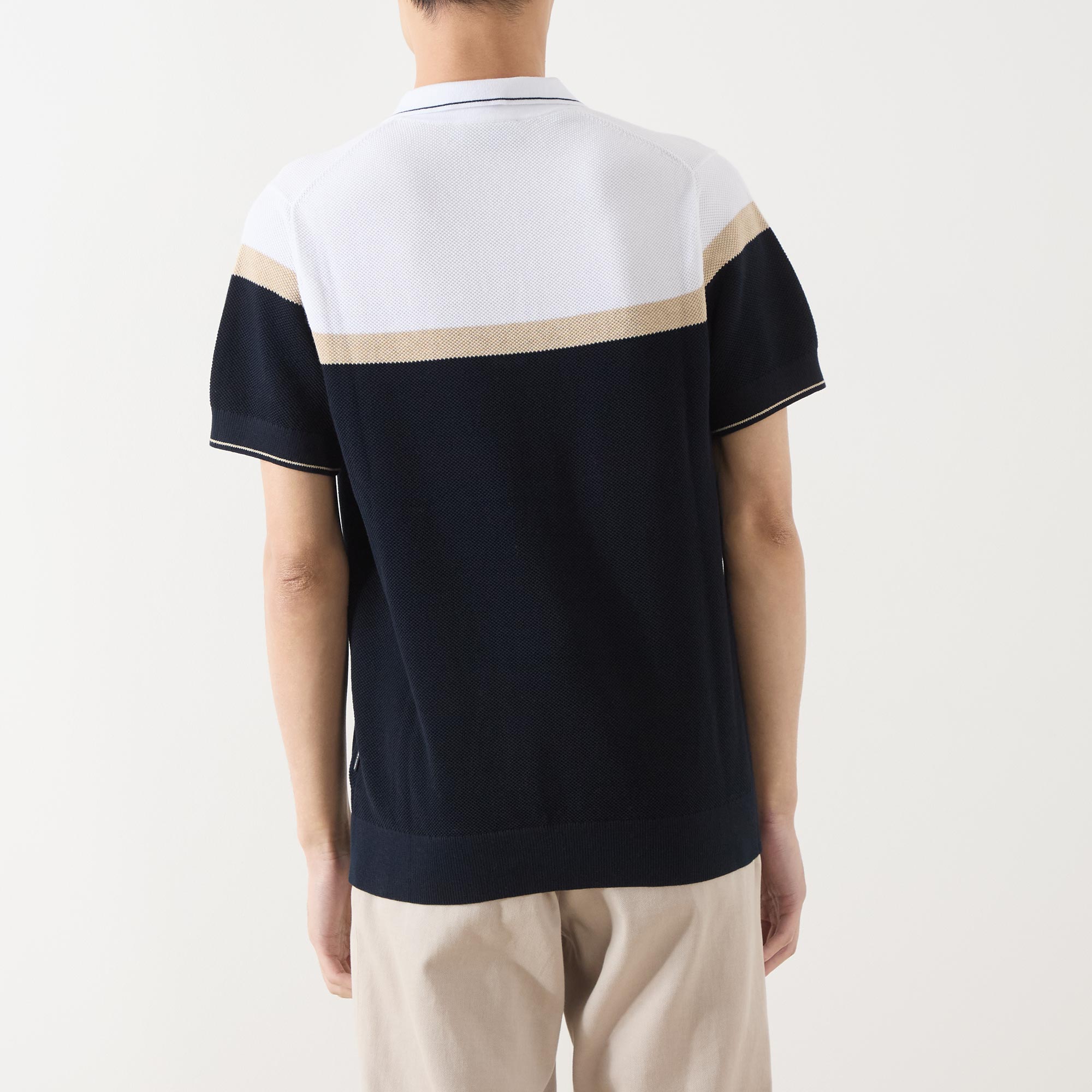 - Flat knit collar and cuffs, button fastening, short sleeves, tipped and ribbed trims, straight hemline, fine knit structure, colour-block style, embroidered logo detail