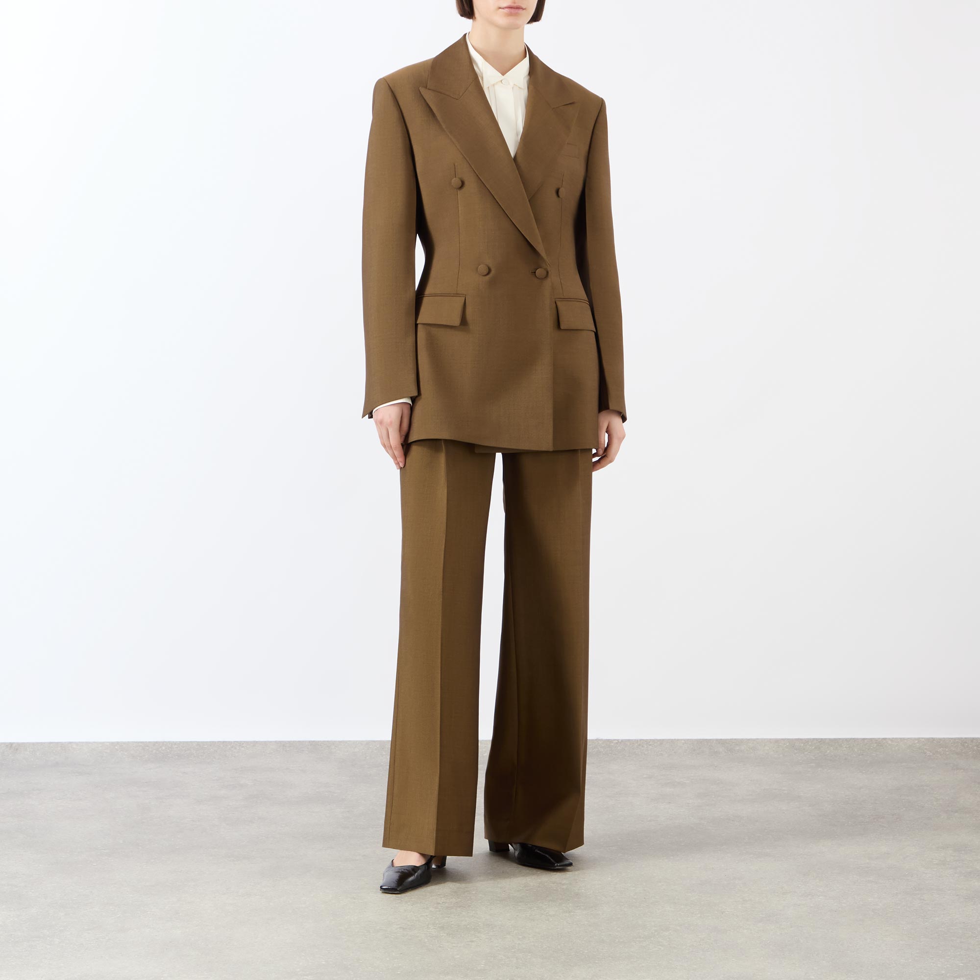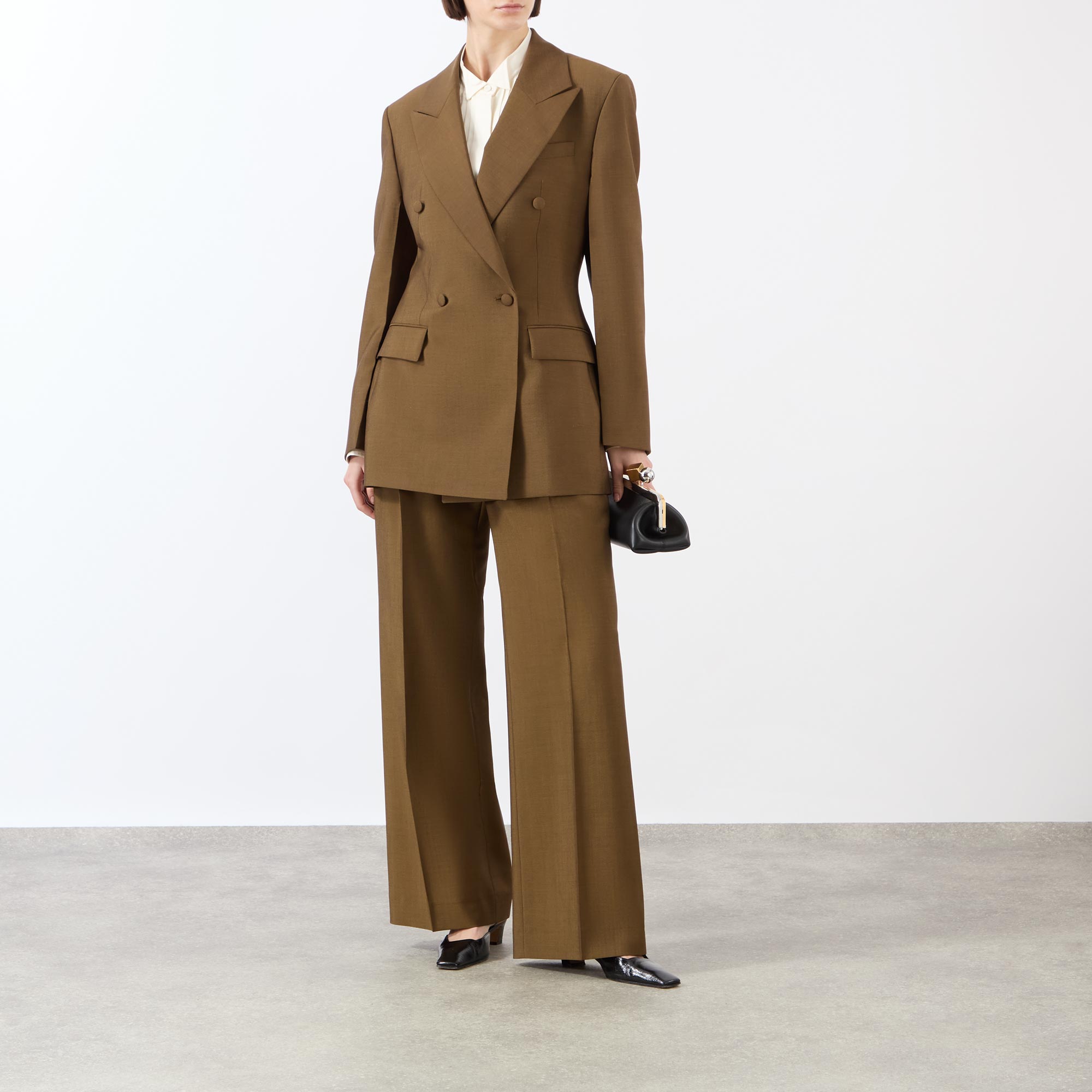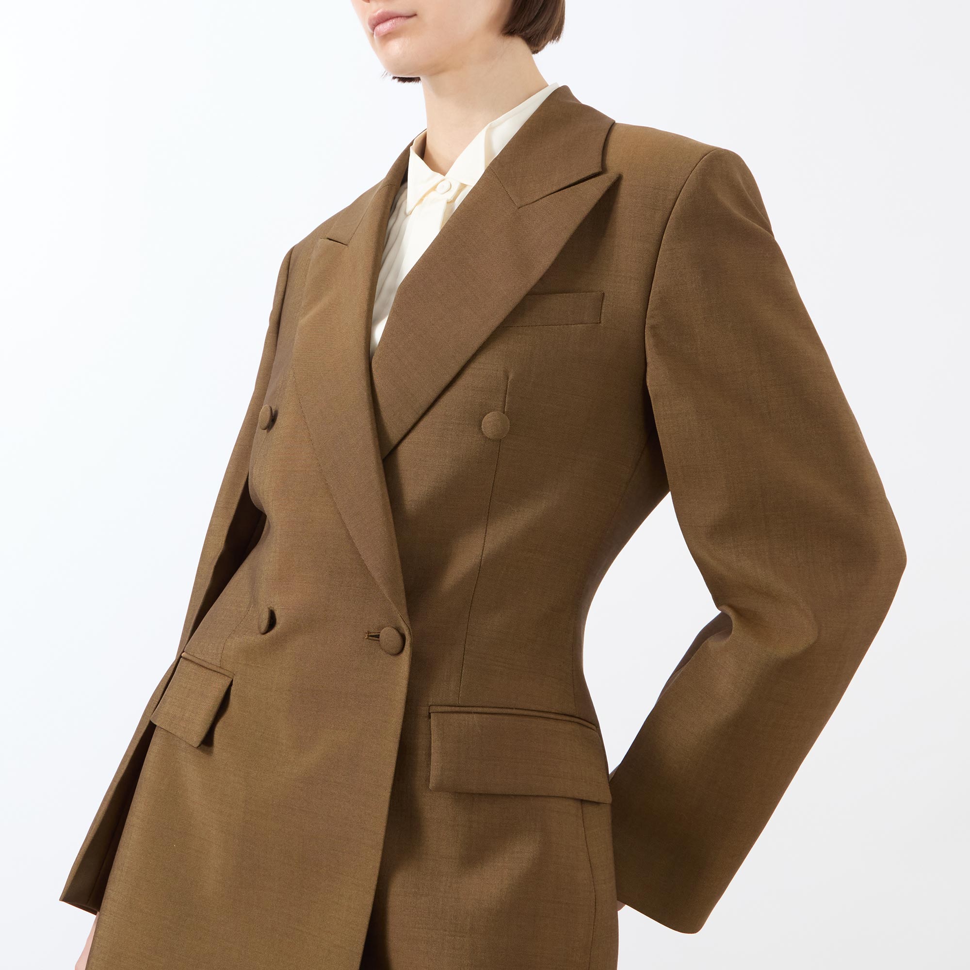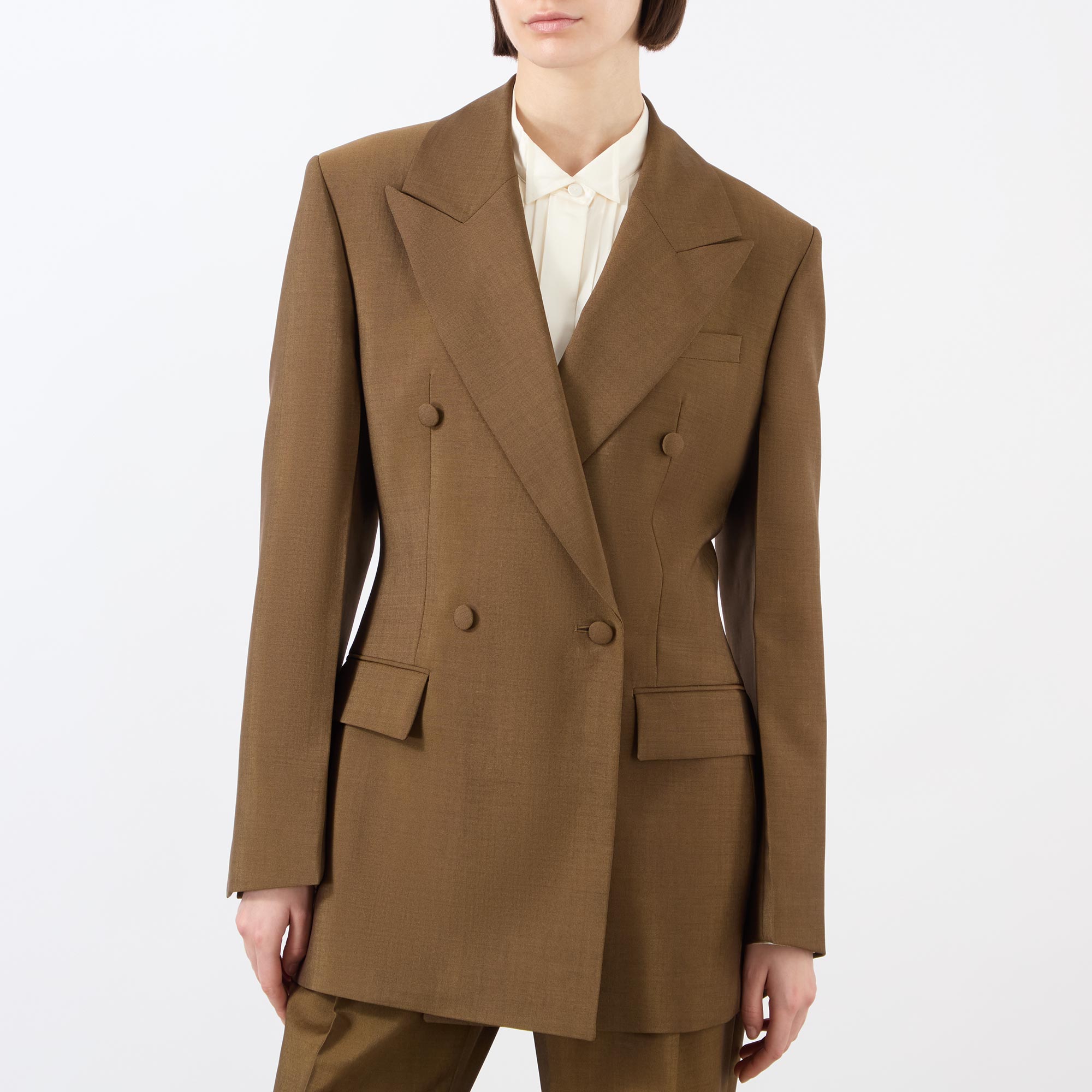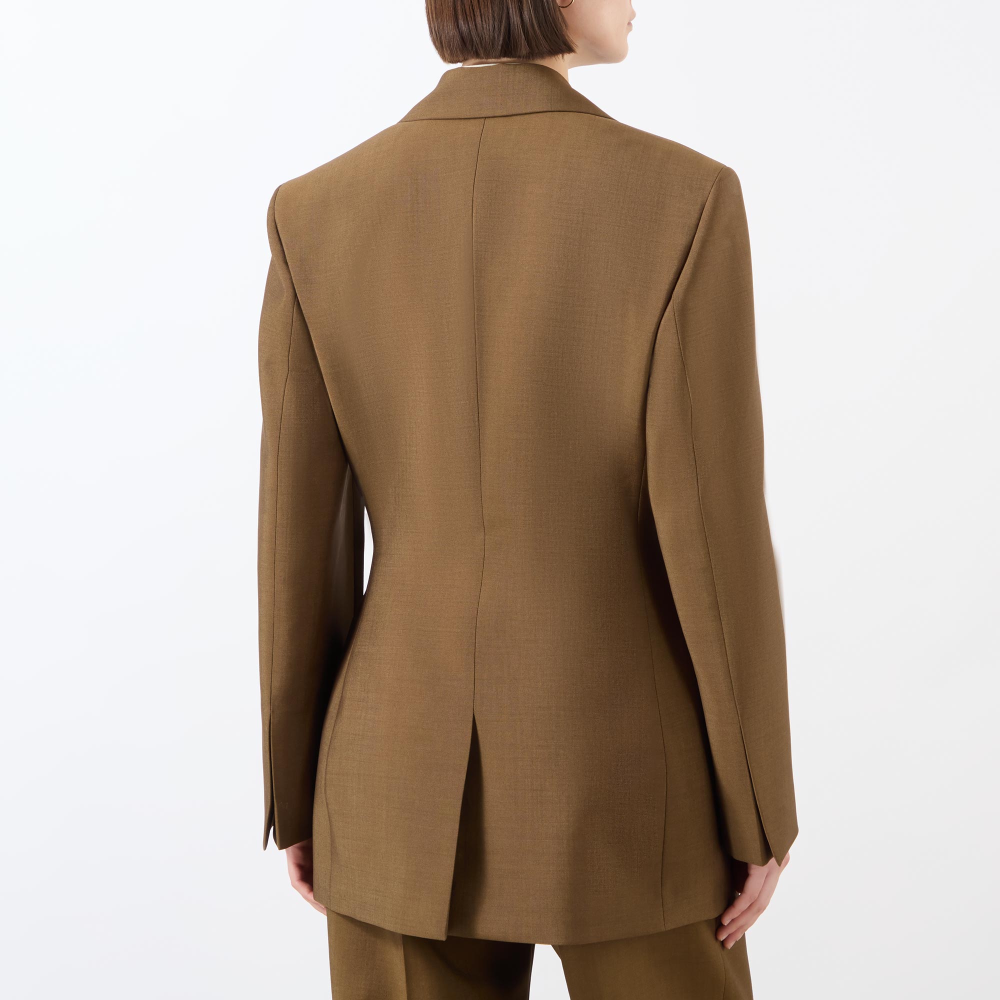 - Double-breasted front, long sleeves, notched lapel collar, padded shoulders, tonal button fastenings, chest welt pocket, two side flap pockets, open slit cuffs, rear slit, smooth fabric