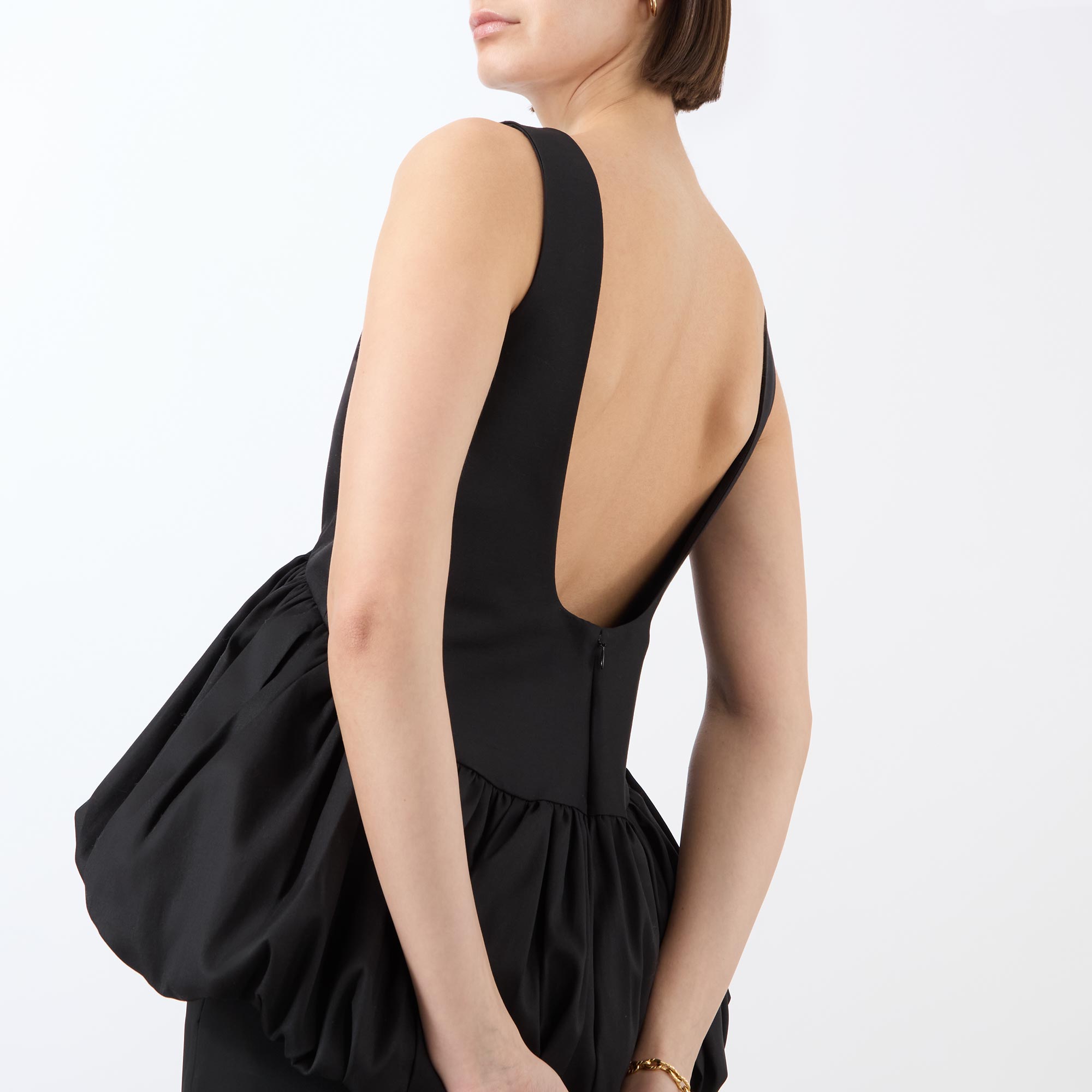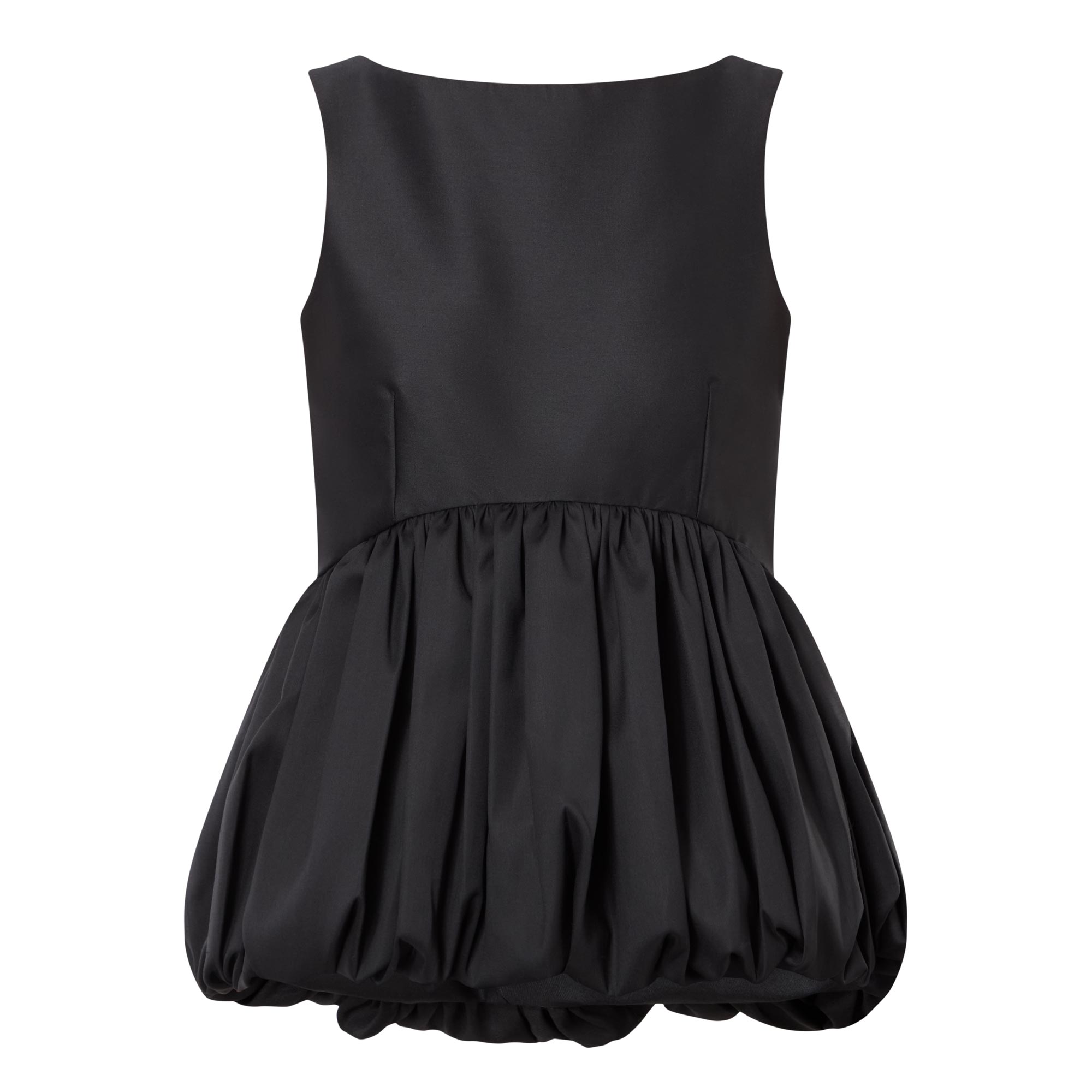 - Boat neckline, sleeveless design, low scoop back, sculptural peplum hem, smooth satin finish