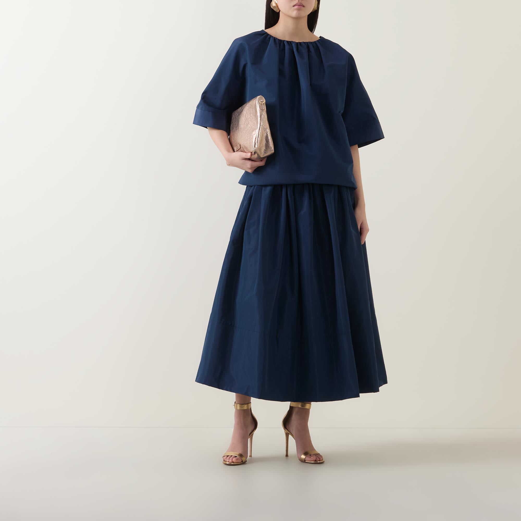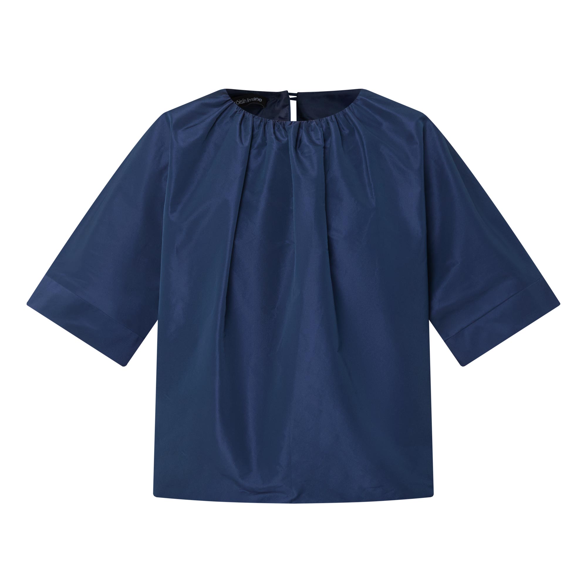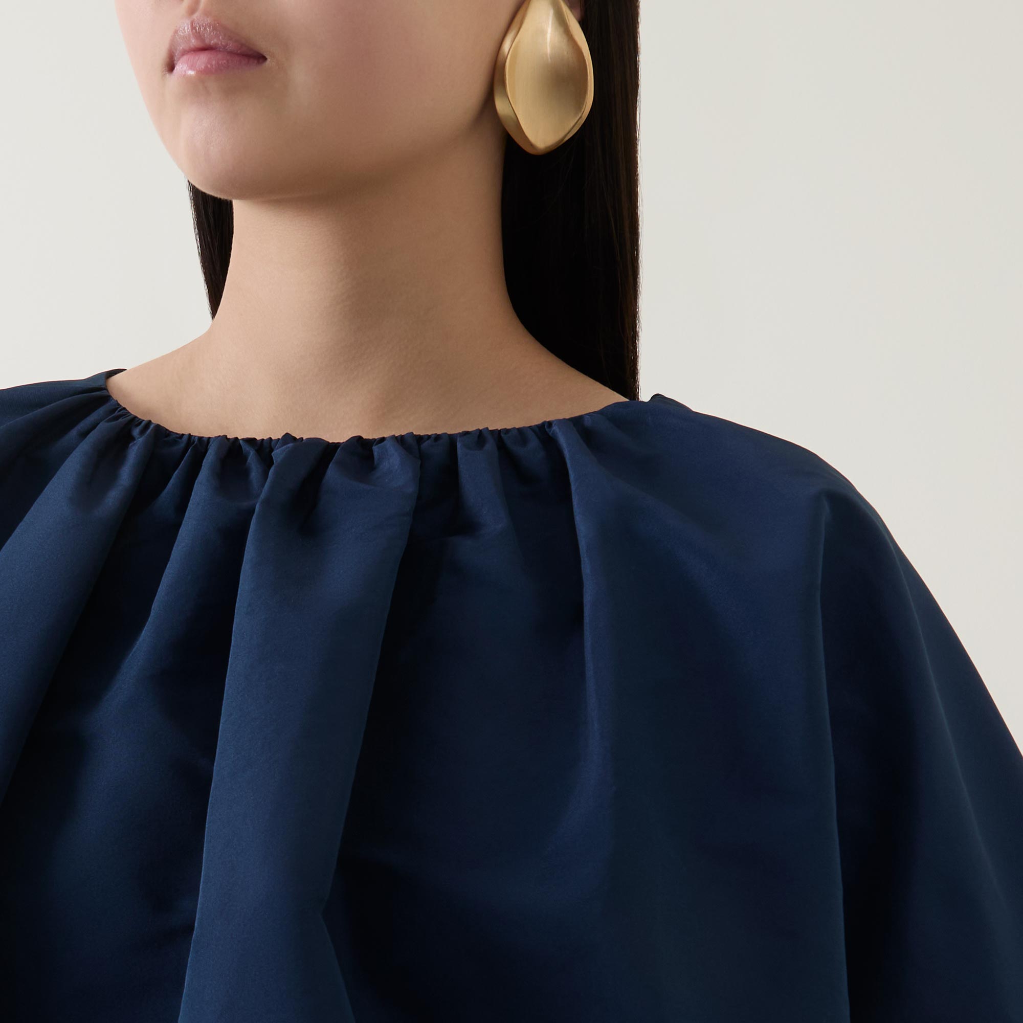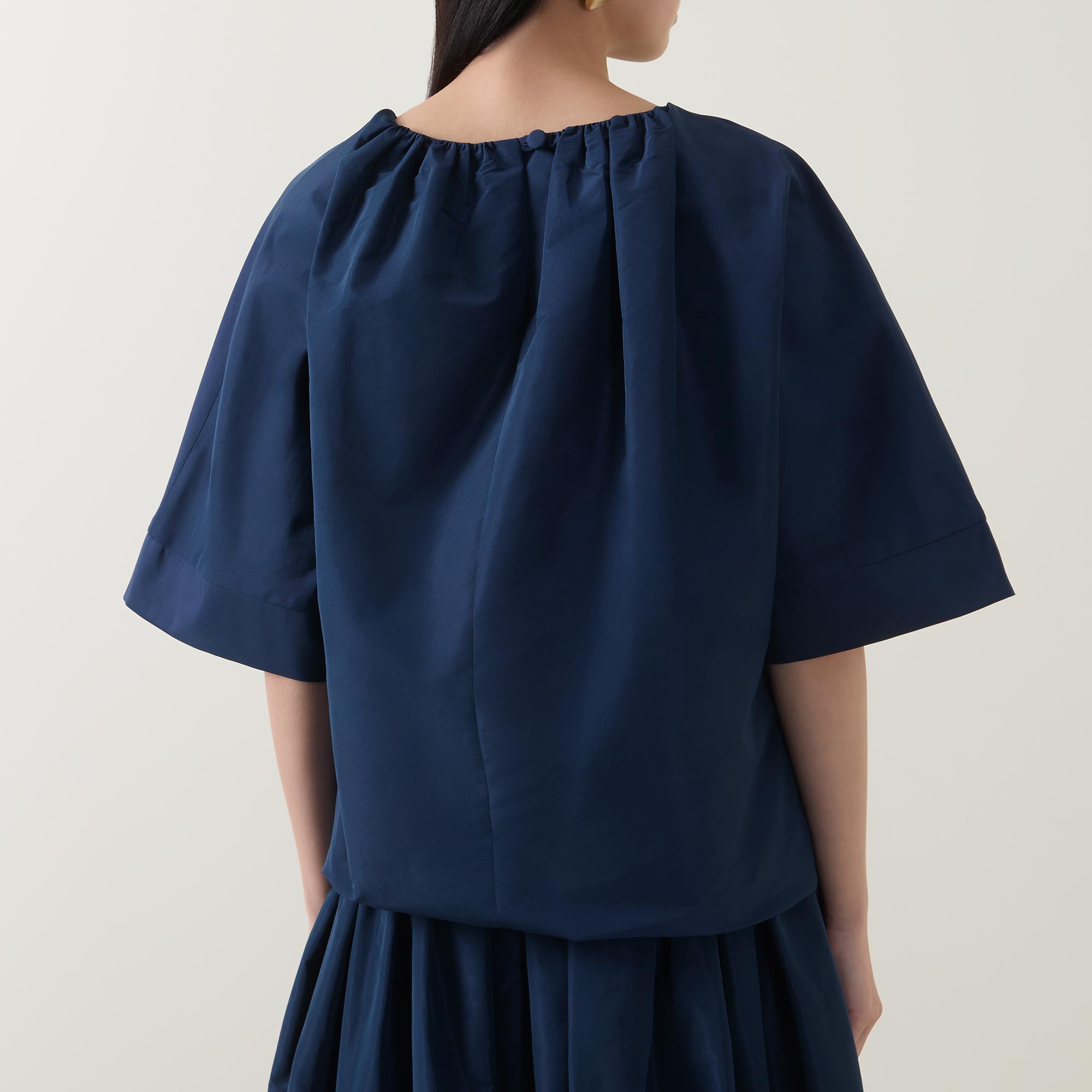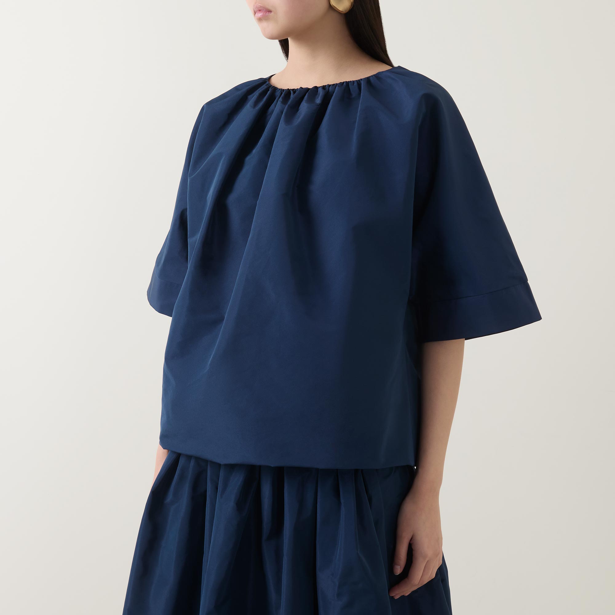 - Round pleated and gathered neckline, rear button fastening, half length sleeves, straight hem, sateen finish