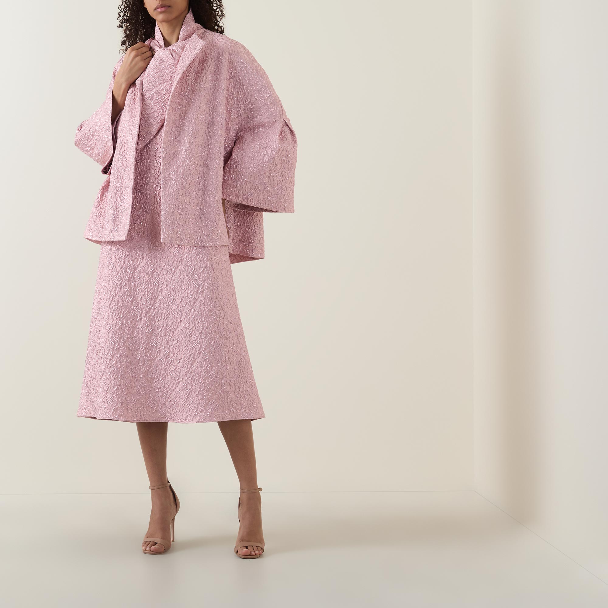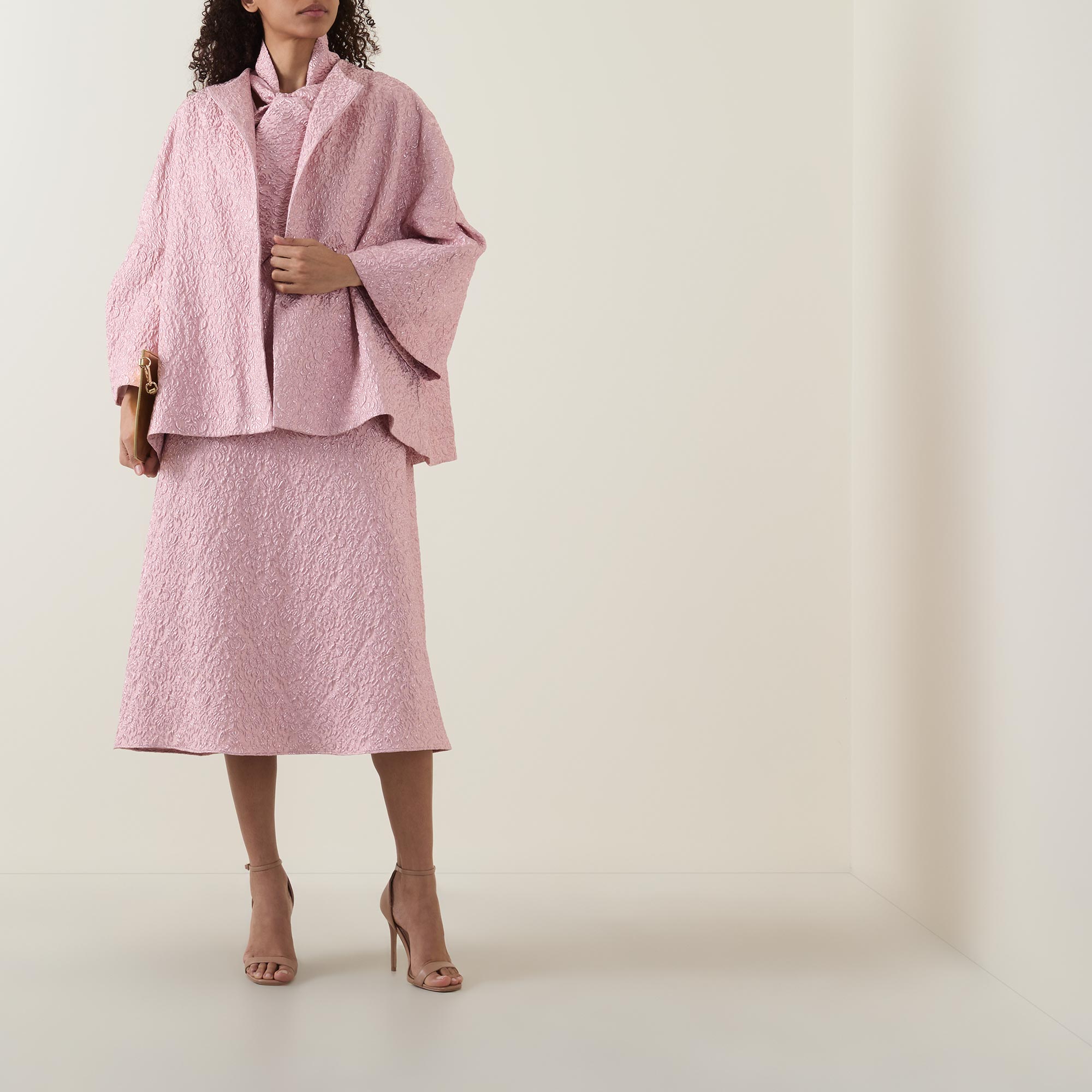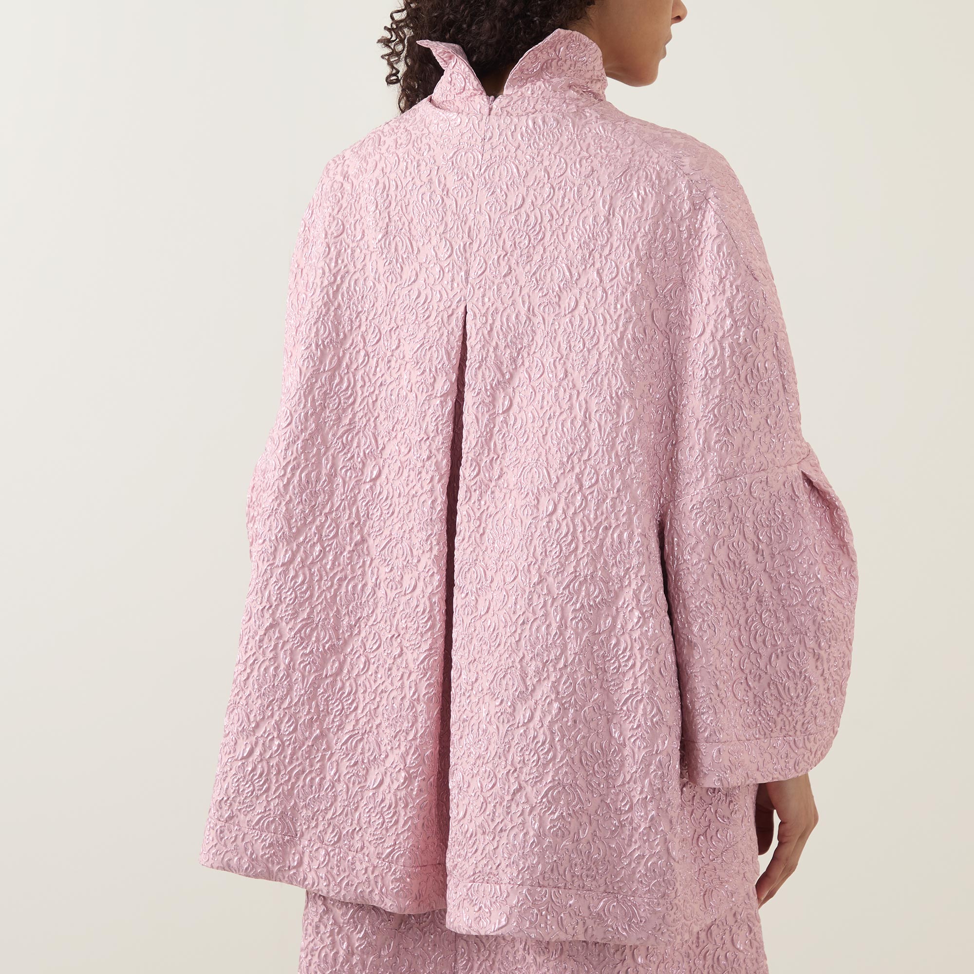- Round neckline, dropped shoulders, three quarter length balloon sleeves with pleated detailing, open-front design, curved hem, rear knife pleat, textured finish, lined
