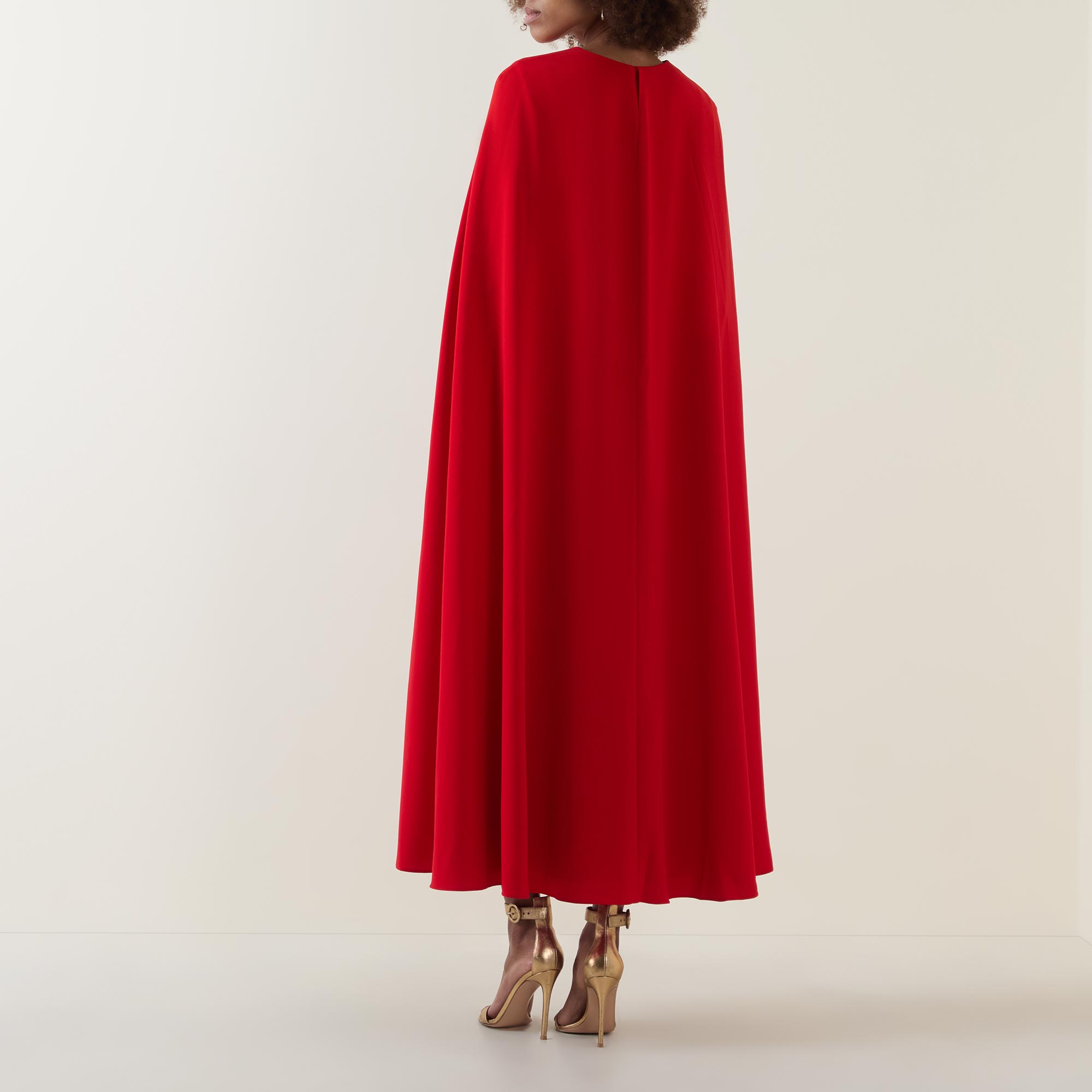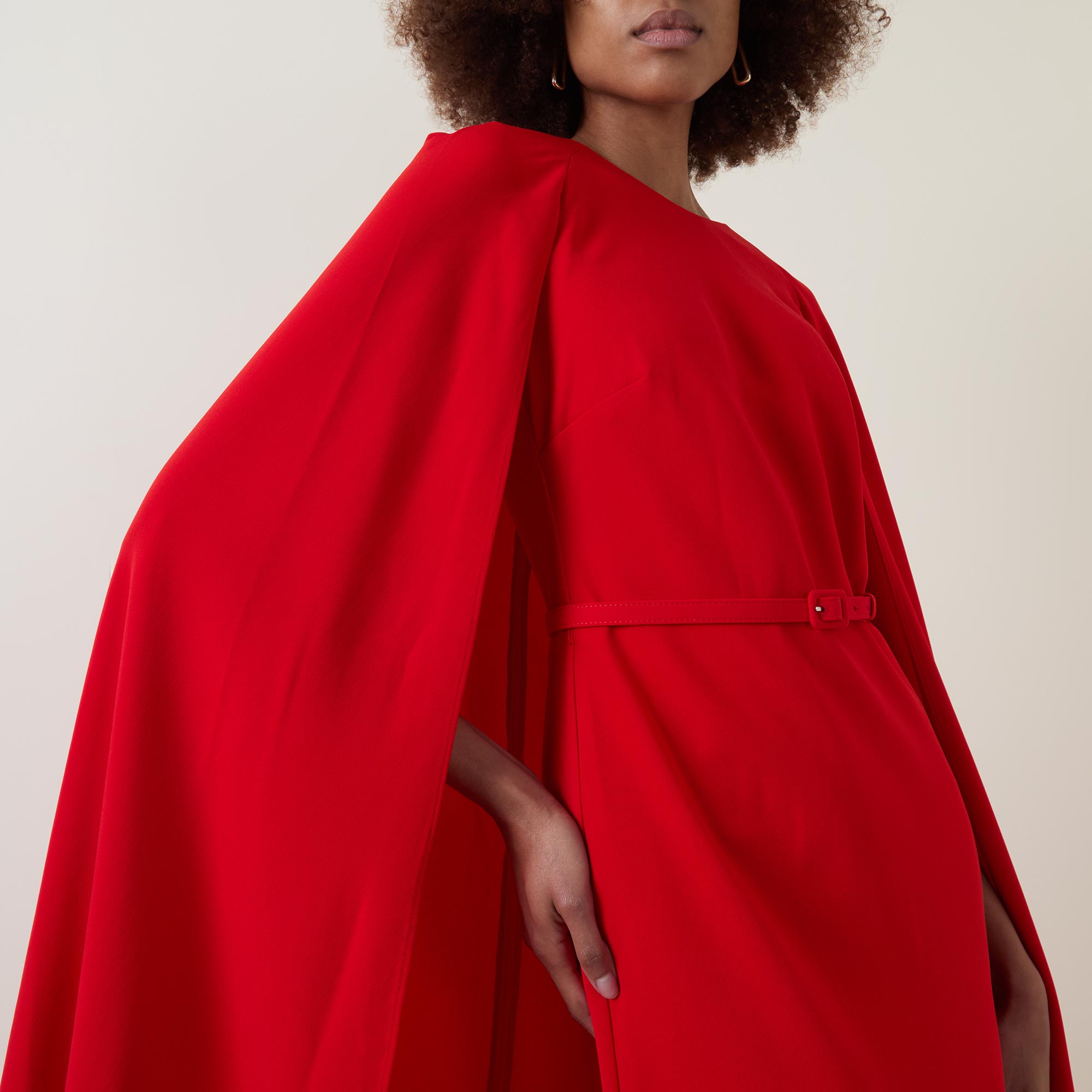 - Round neckline, cape details, flared hemline, belt at waist, zip fastening, fully lined, lightweight cady fabric