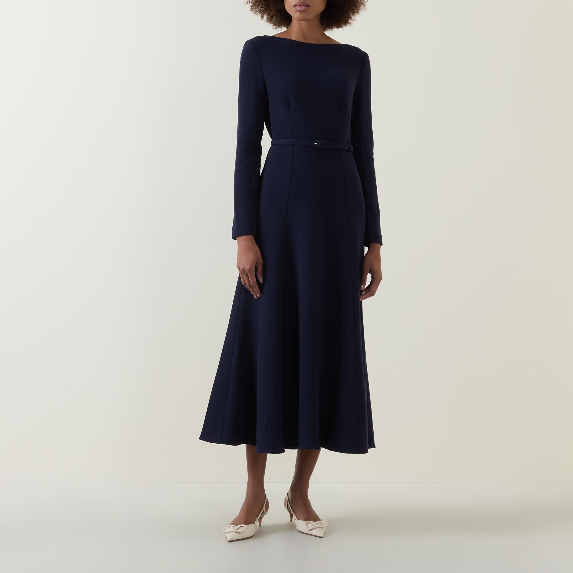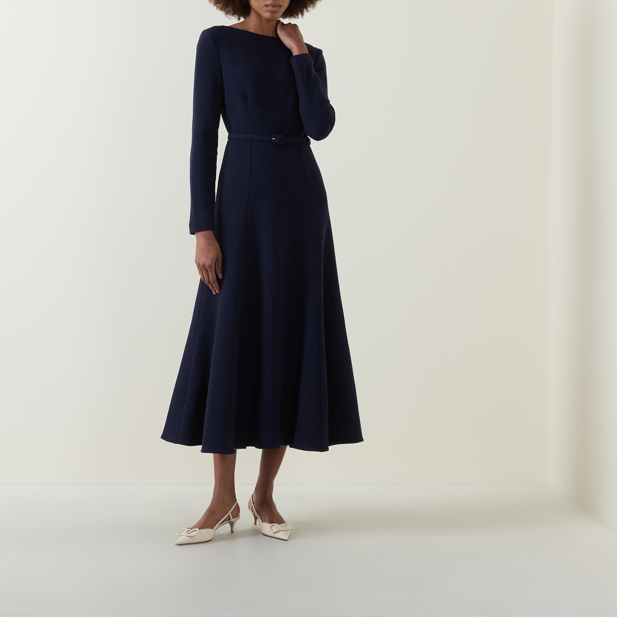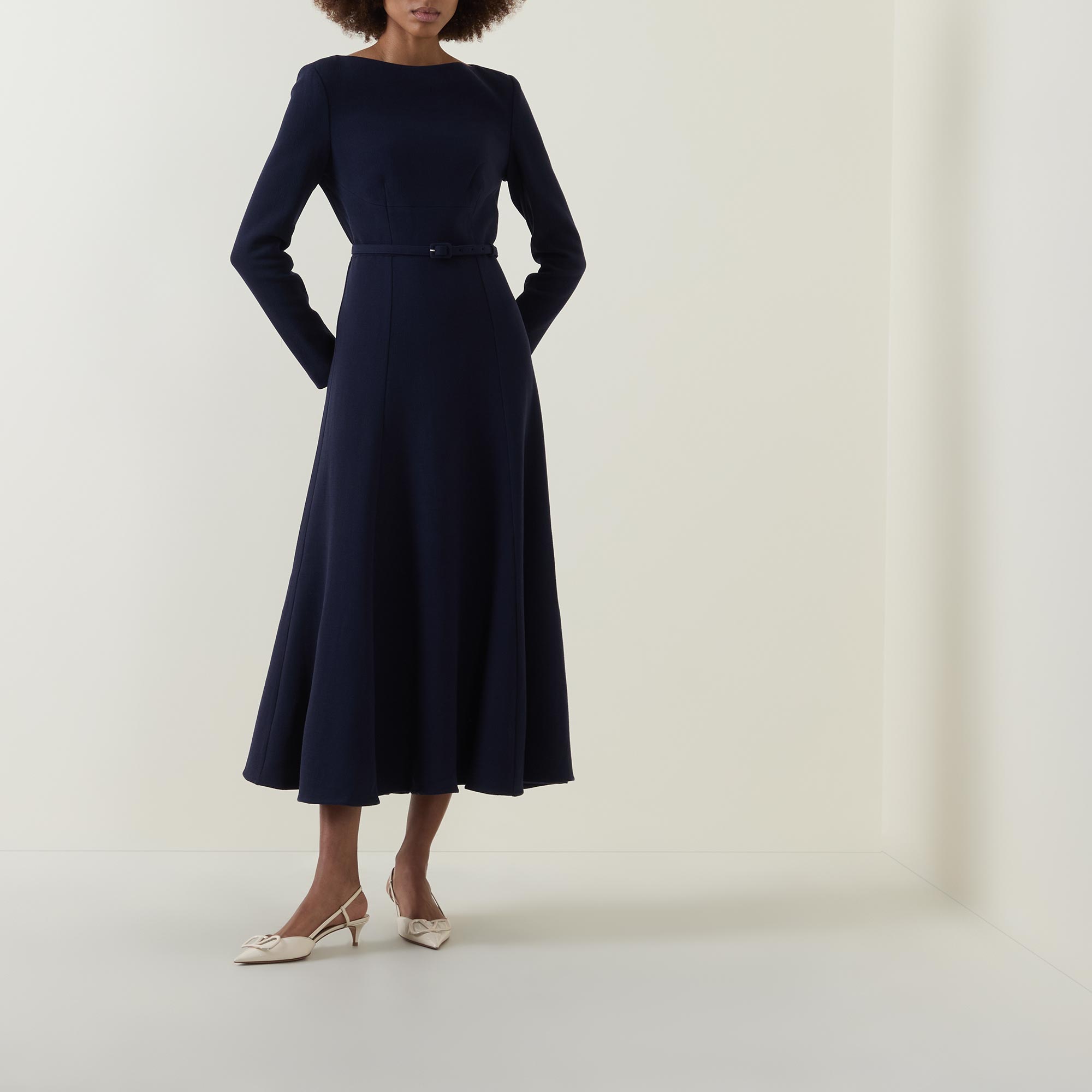 - Boat neckline, long sleeves, flared hemline, midi length, belt at waist, zip fastening, fully lined