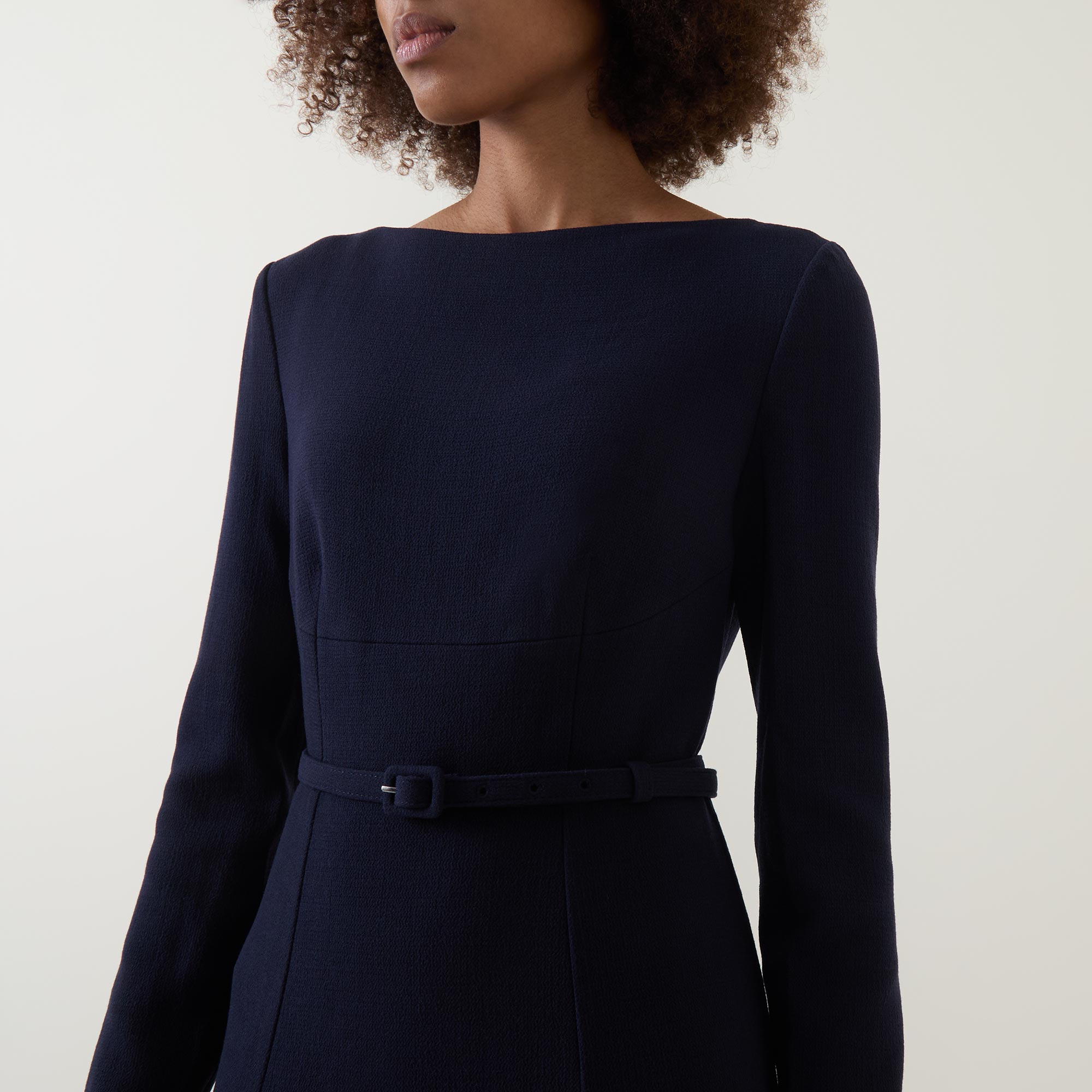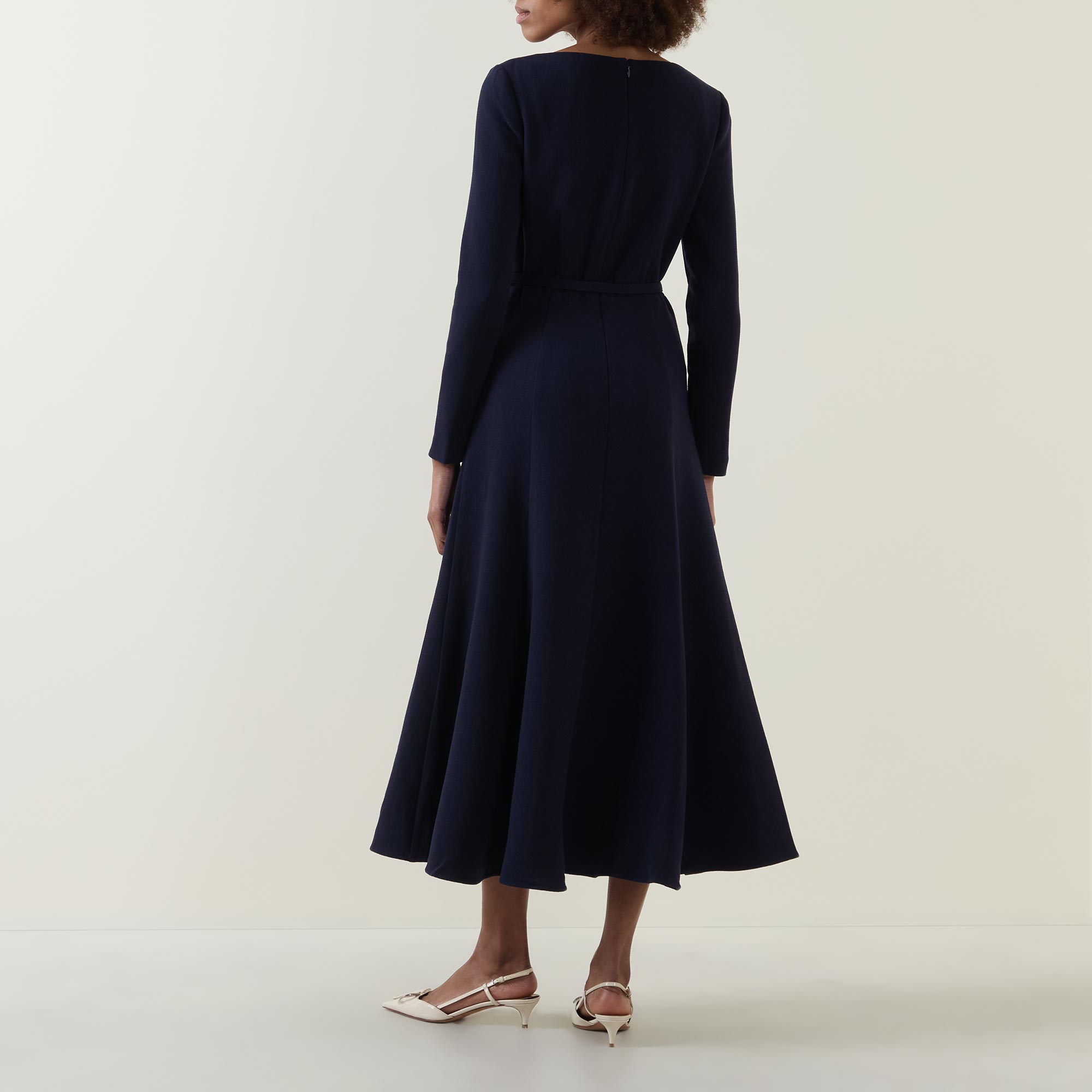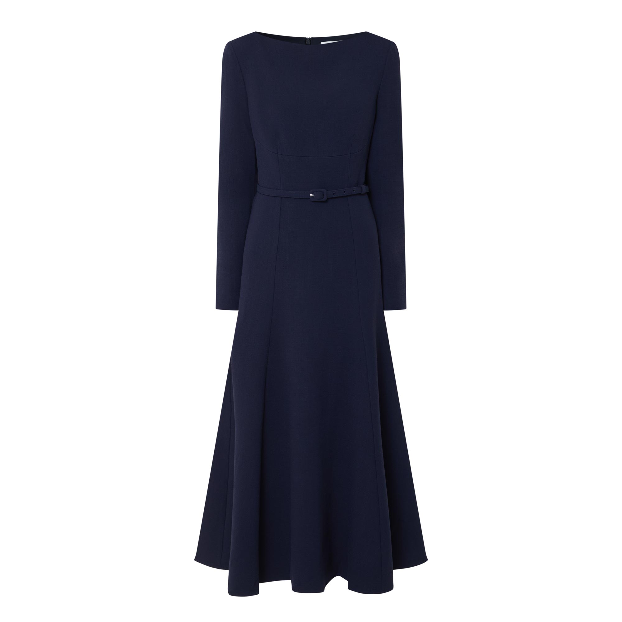 - Boat neckline, long sleeves, flared hemline, midi length, belt at waist, zip fastening, fully lined
