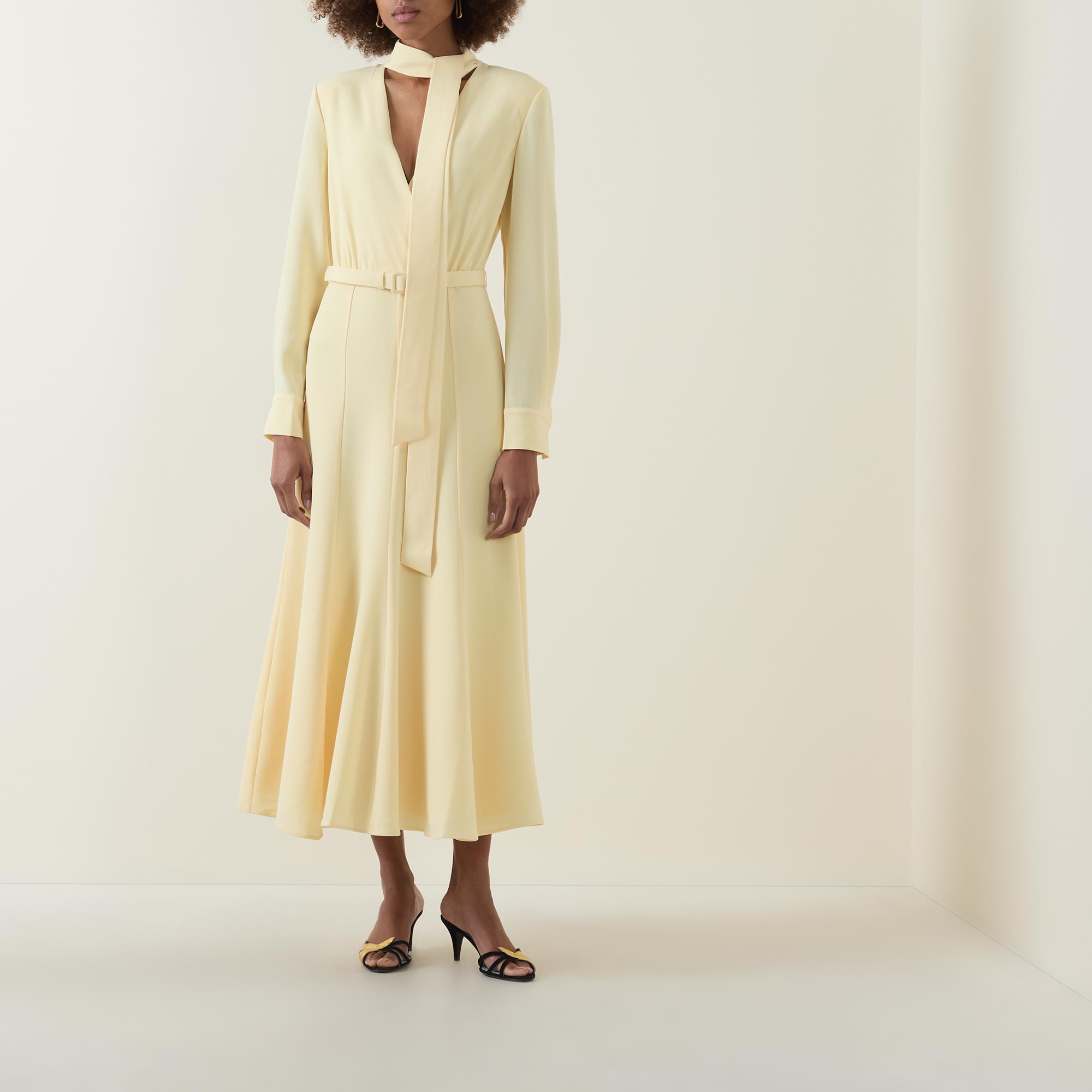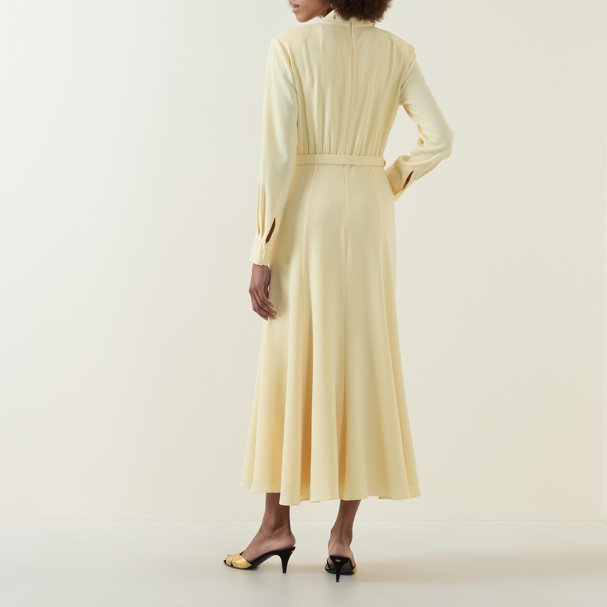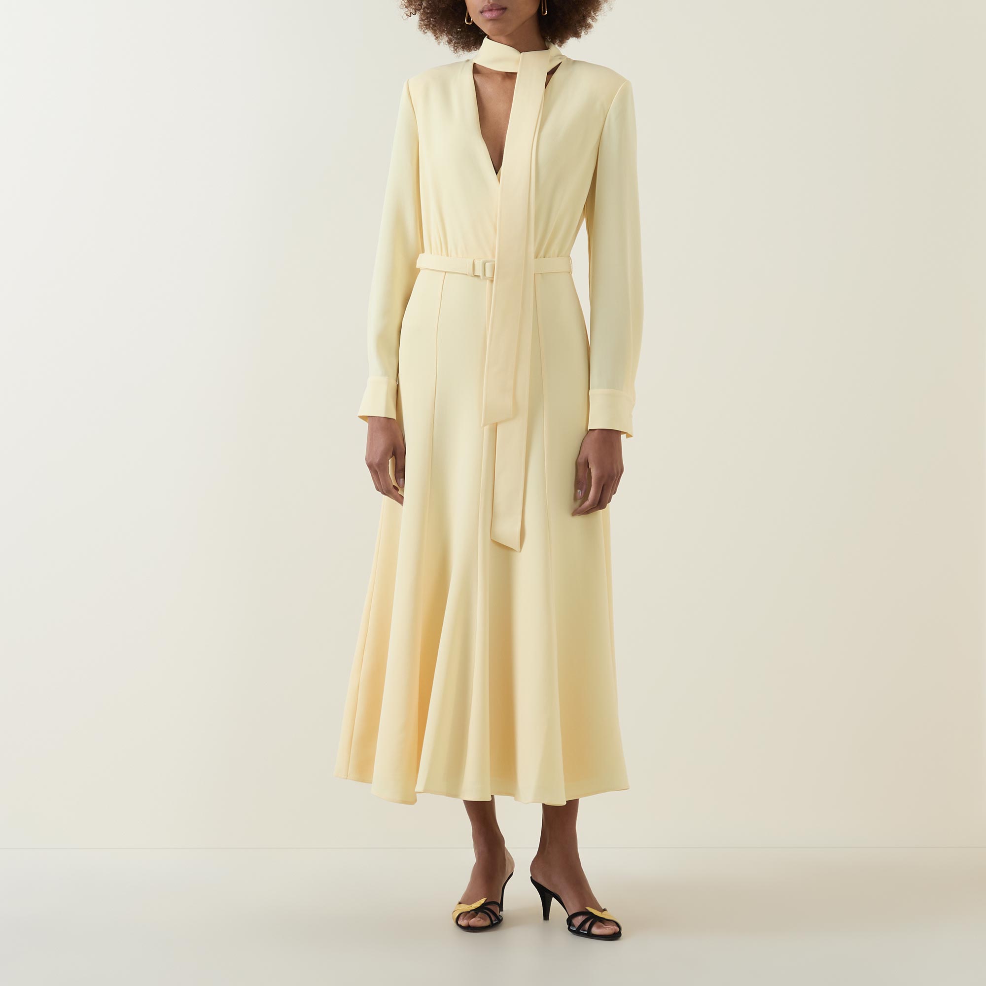 - Scarf detail at neckline, cut-out detail, long sleeves, midi length, flared hemline, adjustable belt at waist, fully lined, removable shoulder pads, lightweight cady fabric