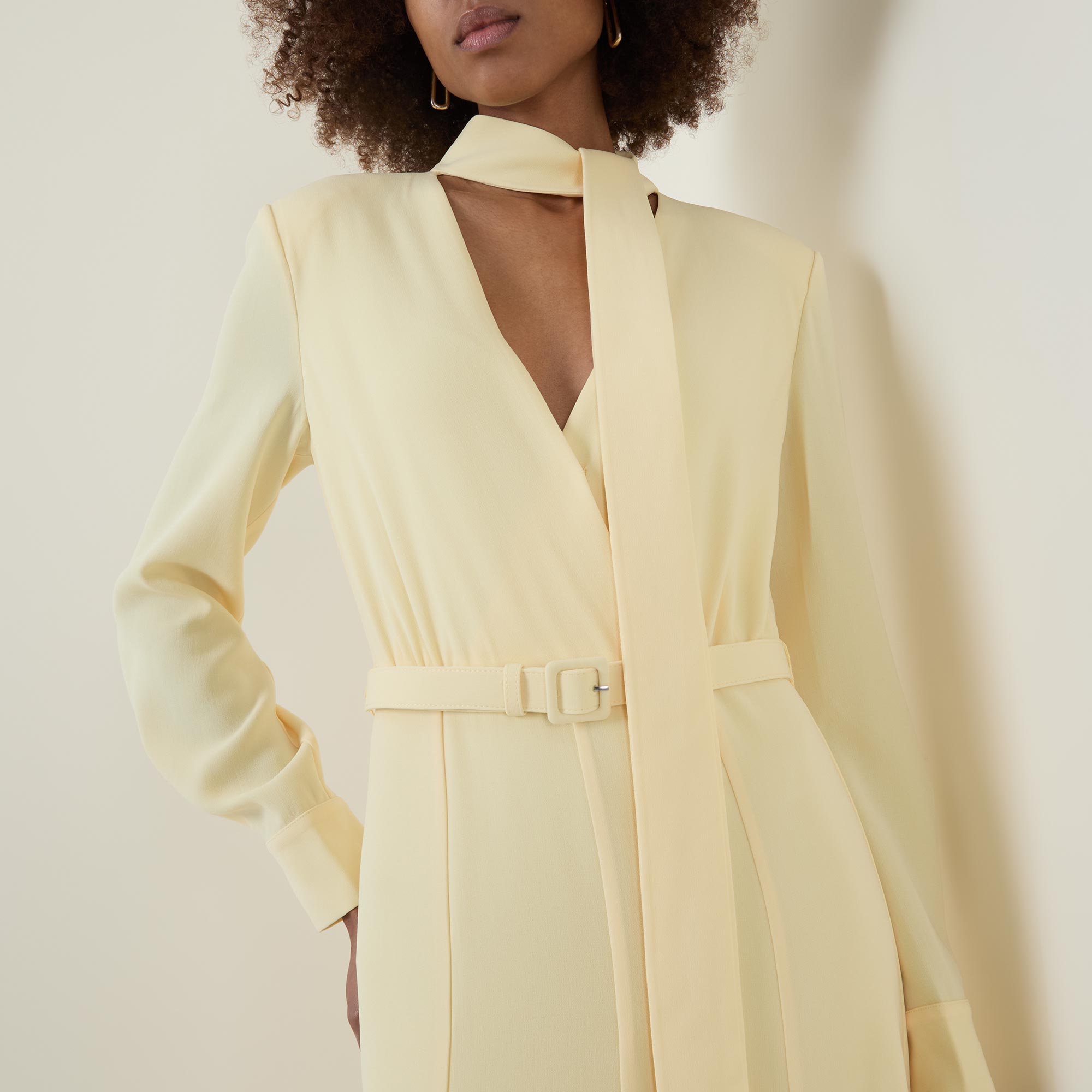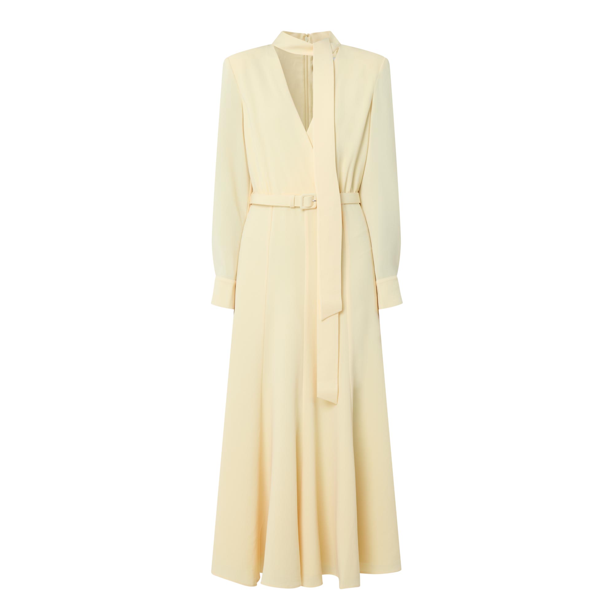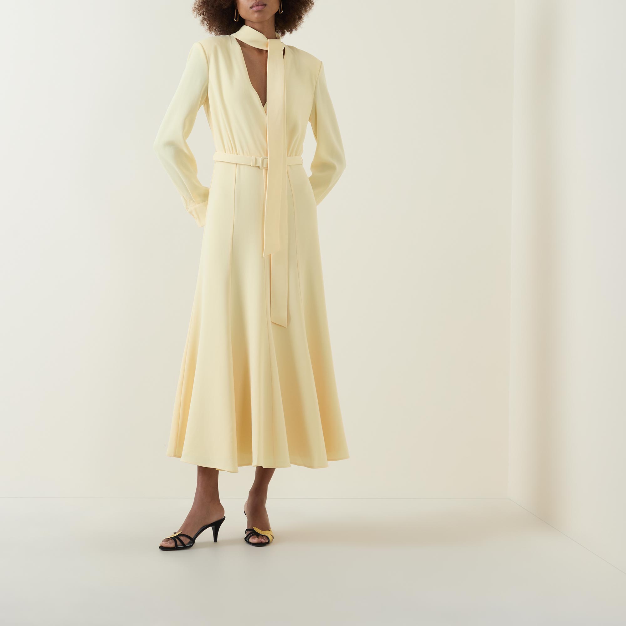- Scarf detail at neckline, cut-out detail, long sleeves, midi length, flared hemline, adjustable belt at waist, fully lined, removable shoulder pads, lightweight cady fabric
