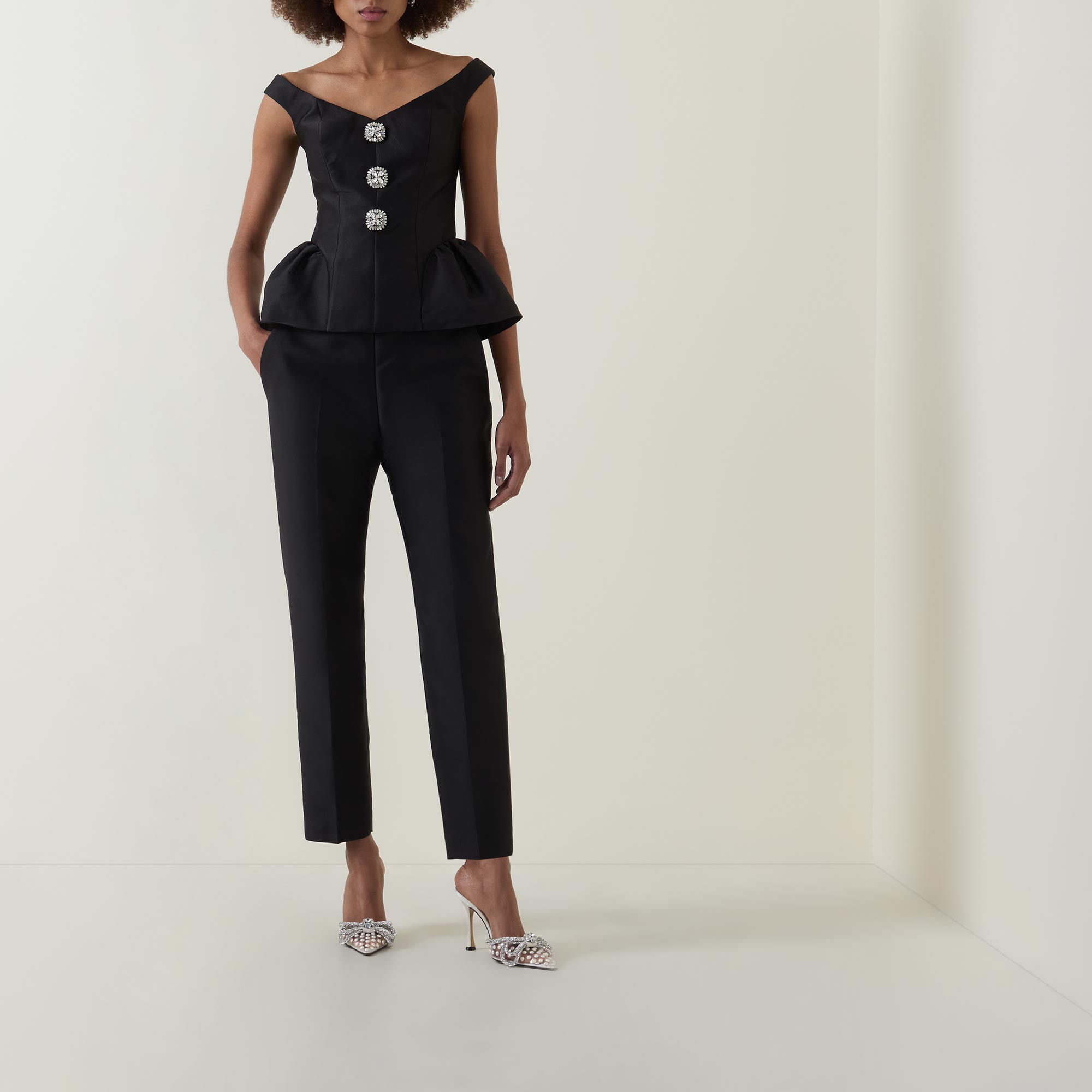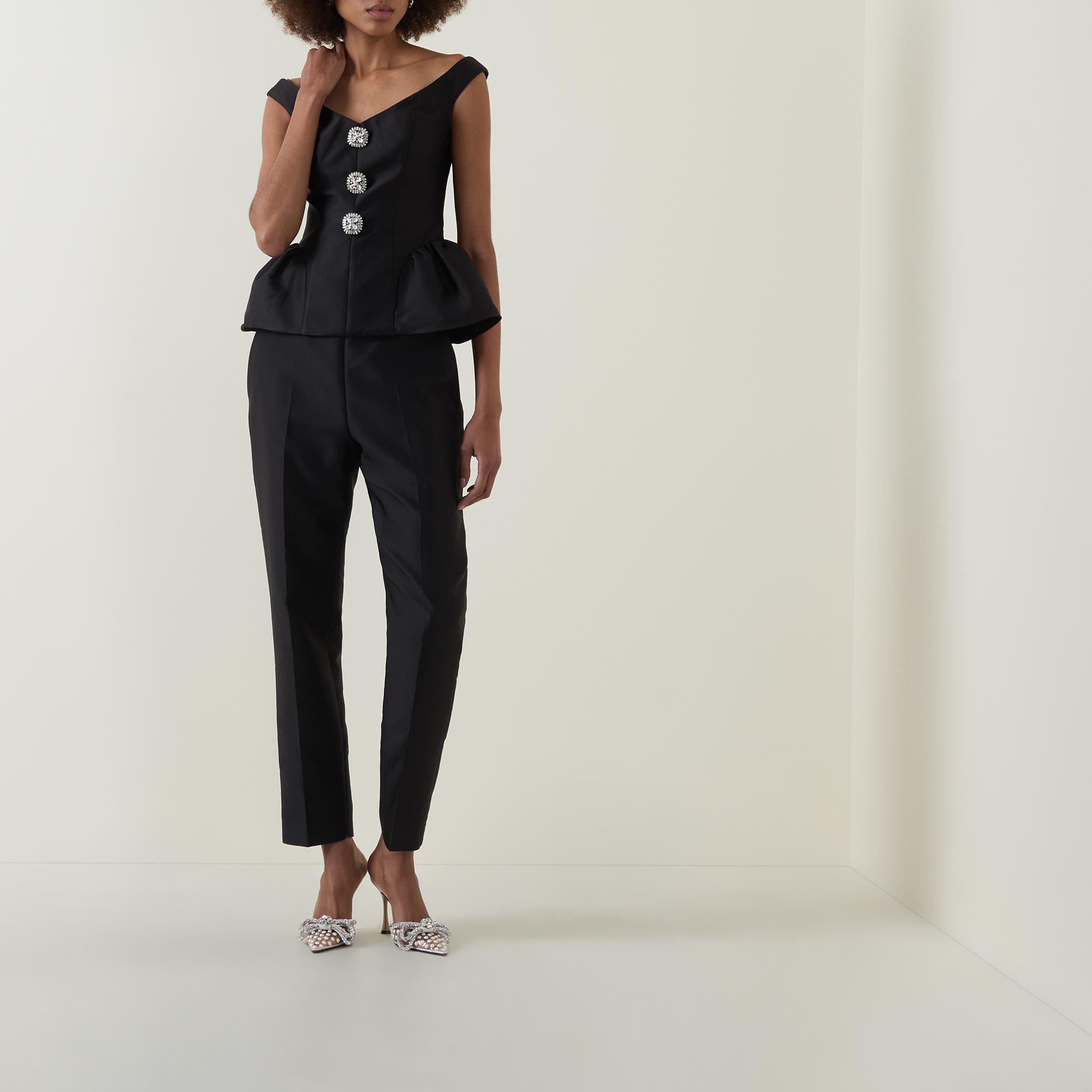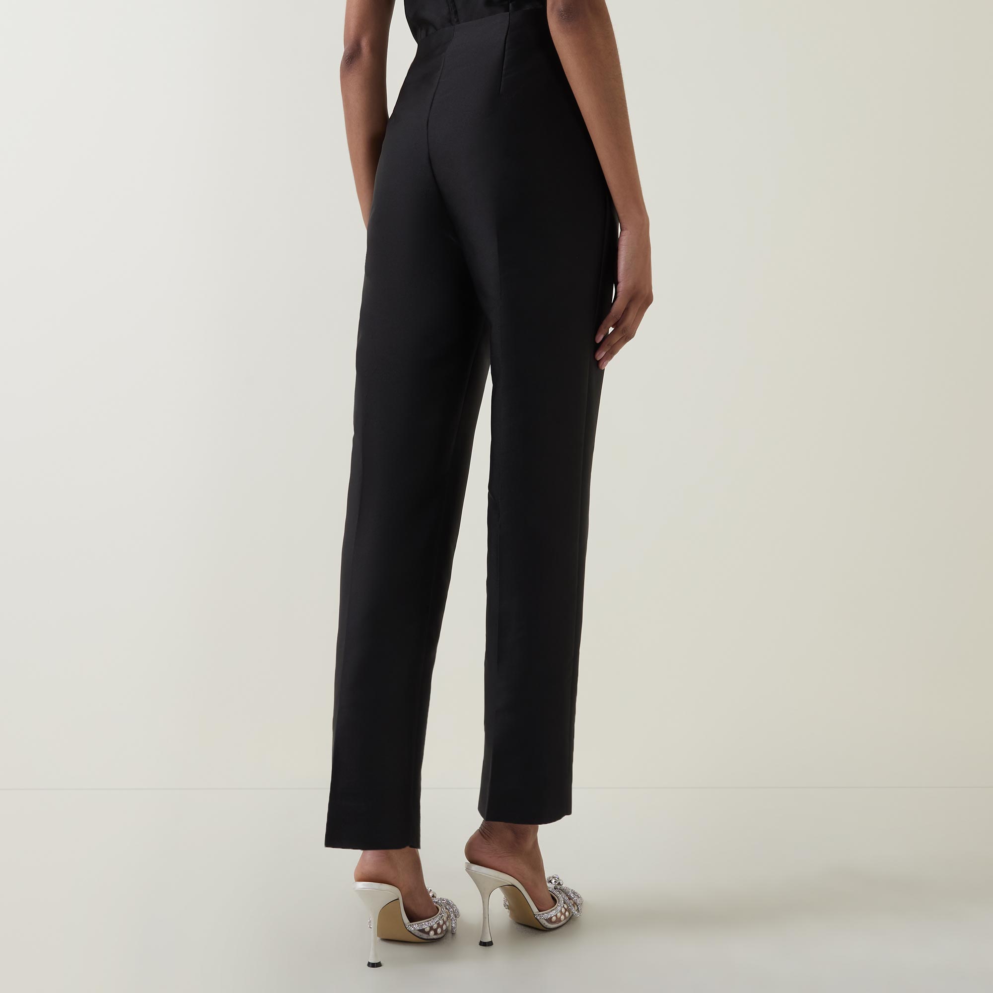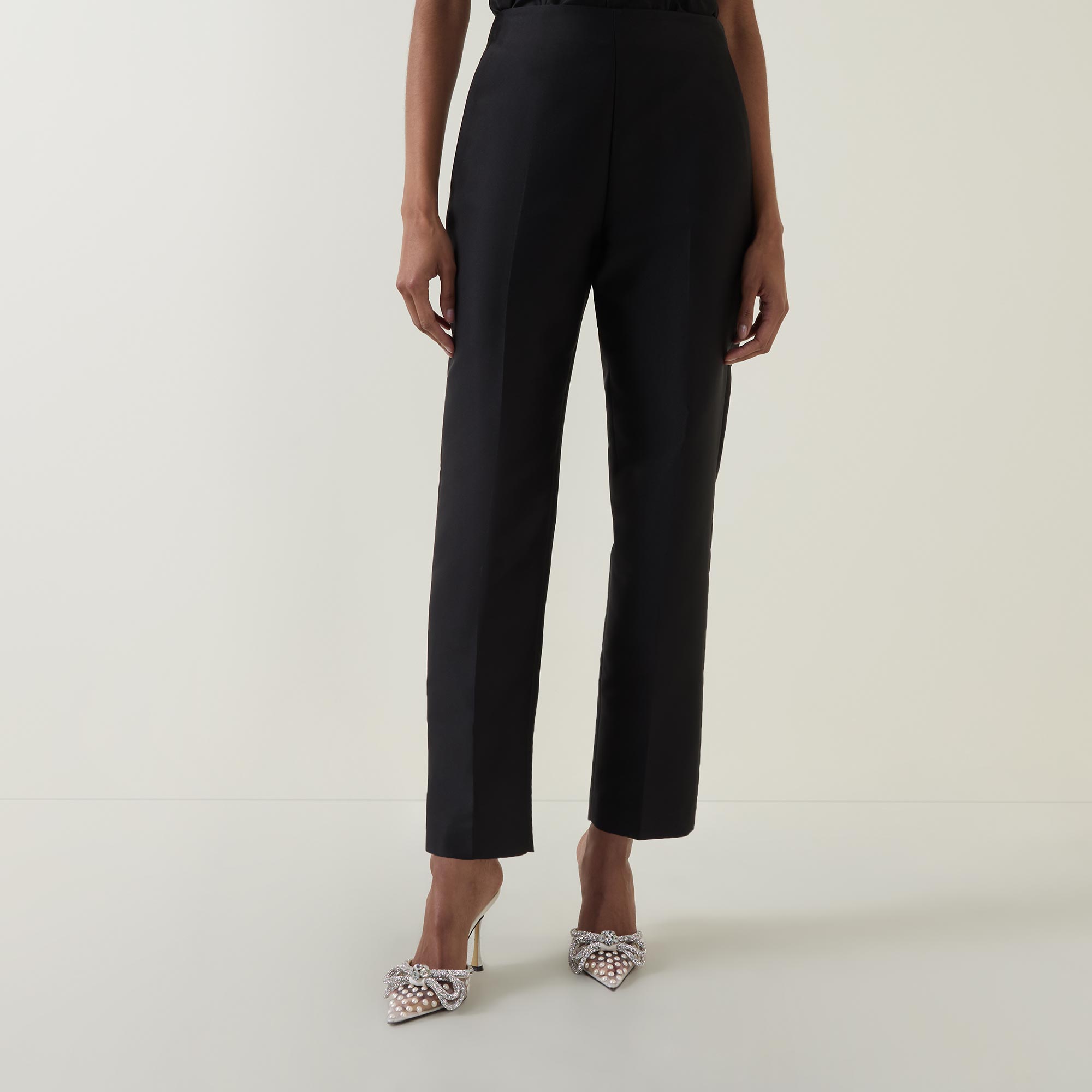 - Straight-cut legs, taffeta fabric, pockets, pressed crease, fully lined