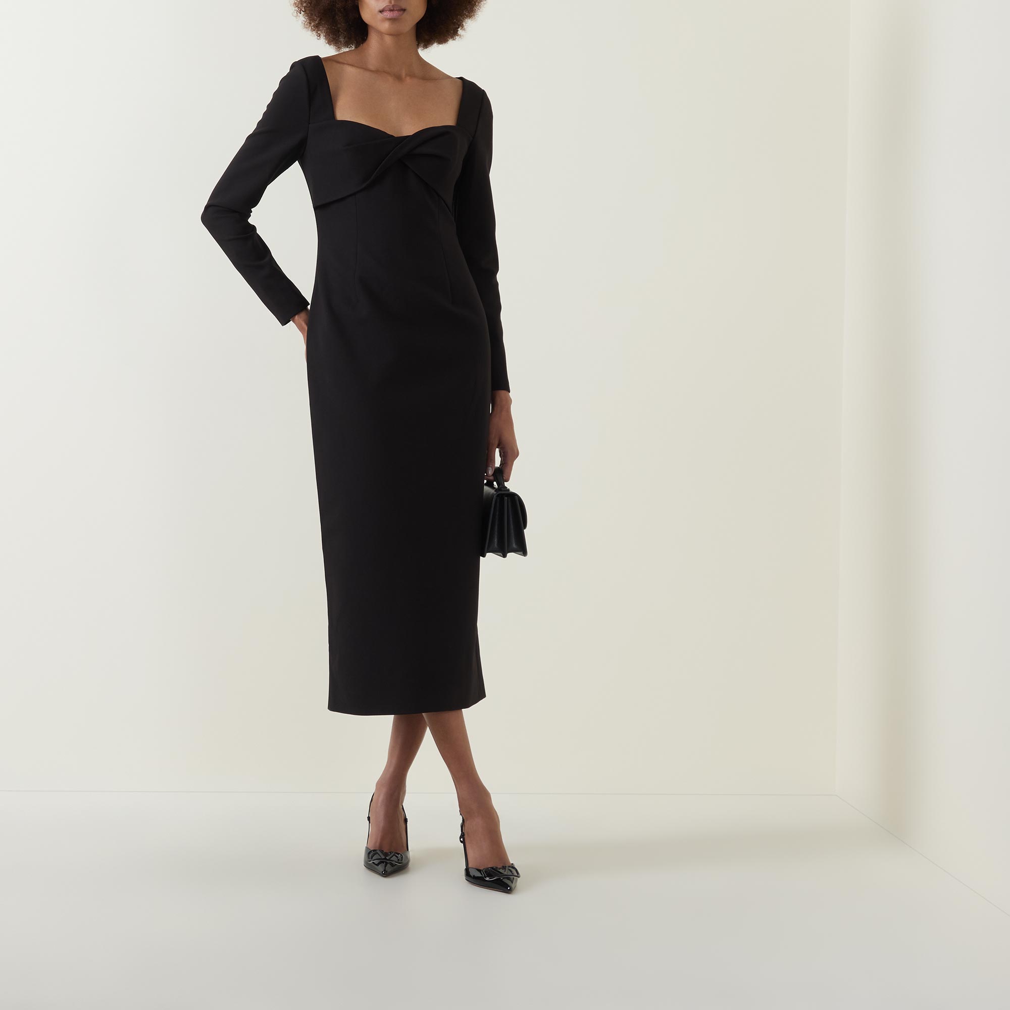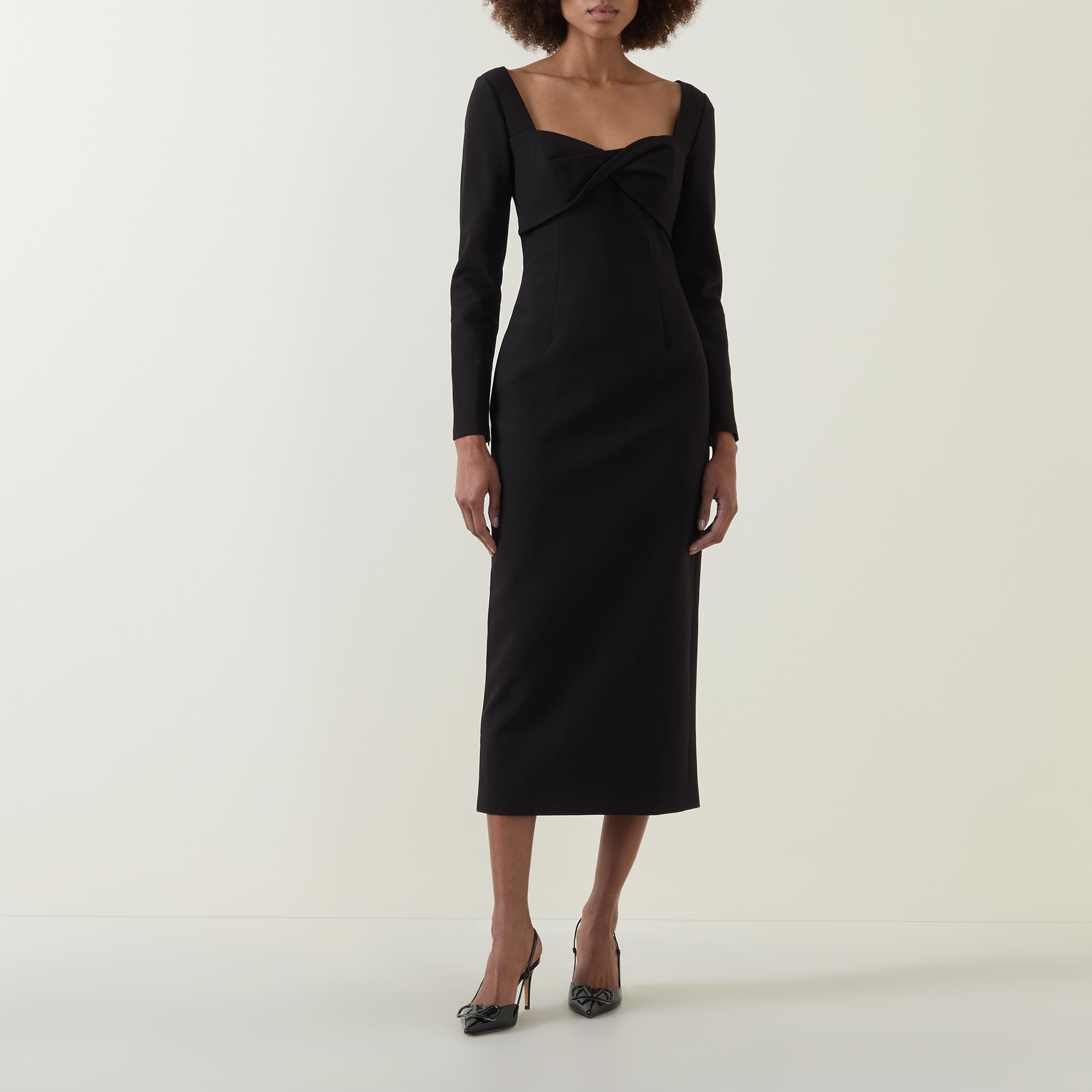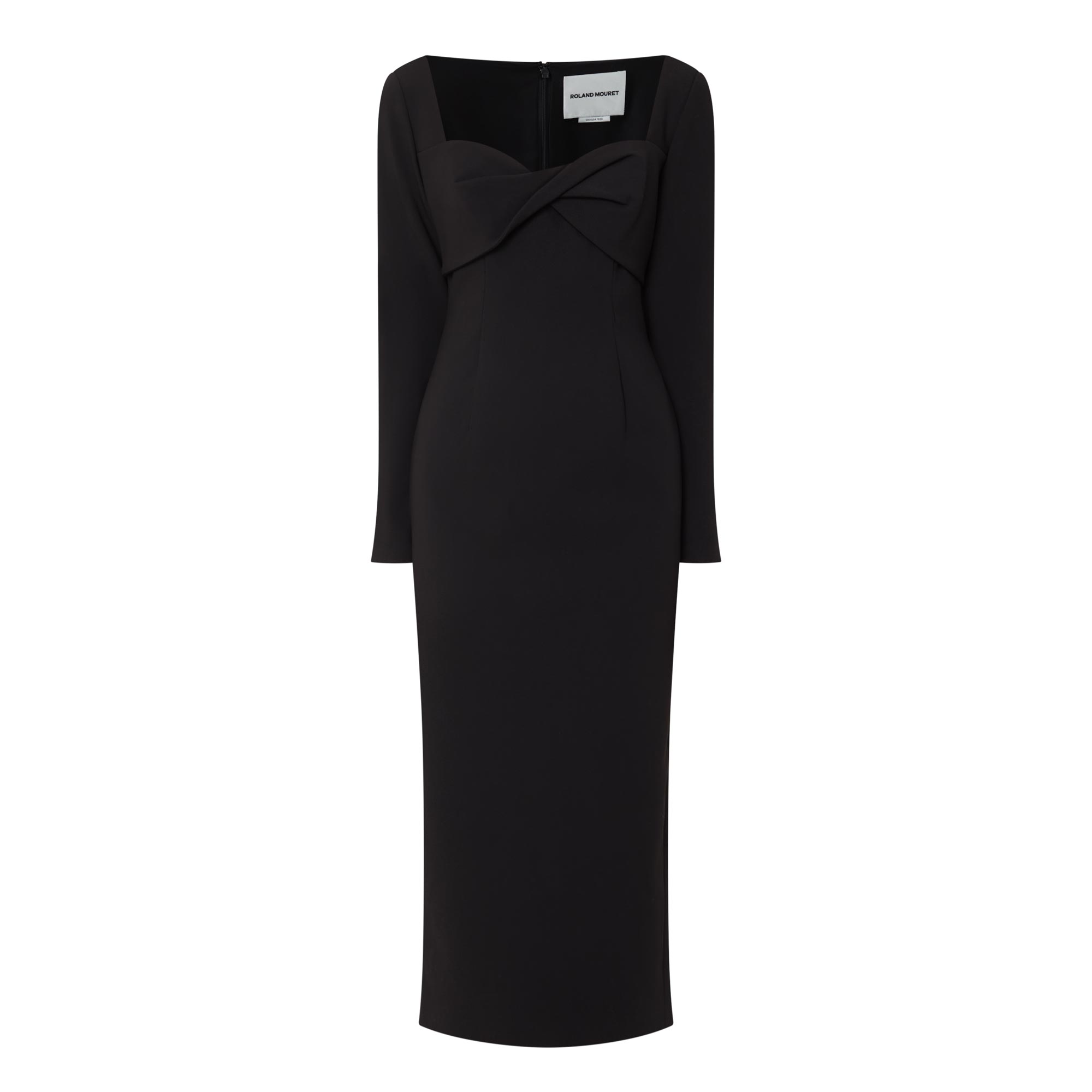 - Twisted detail, sweetheart neckline, long sleeves, midi length, zip fastening, vented, encased boning, removable shoulders pads, full lining, stretch crepe fabric