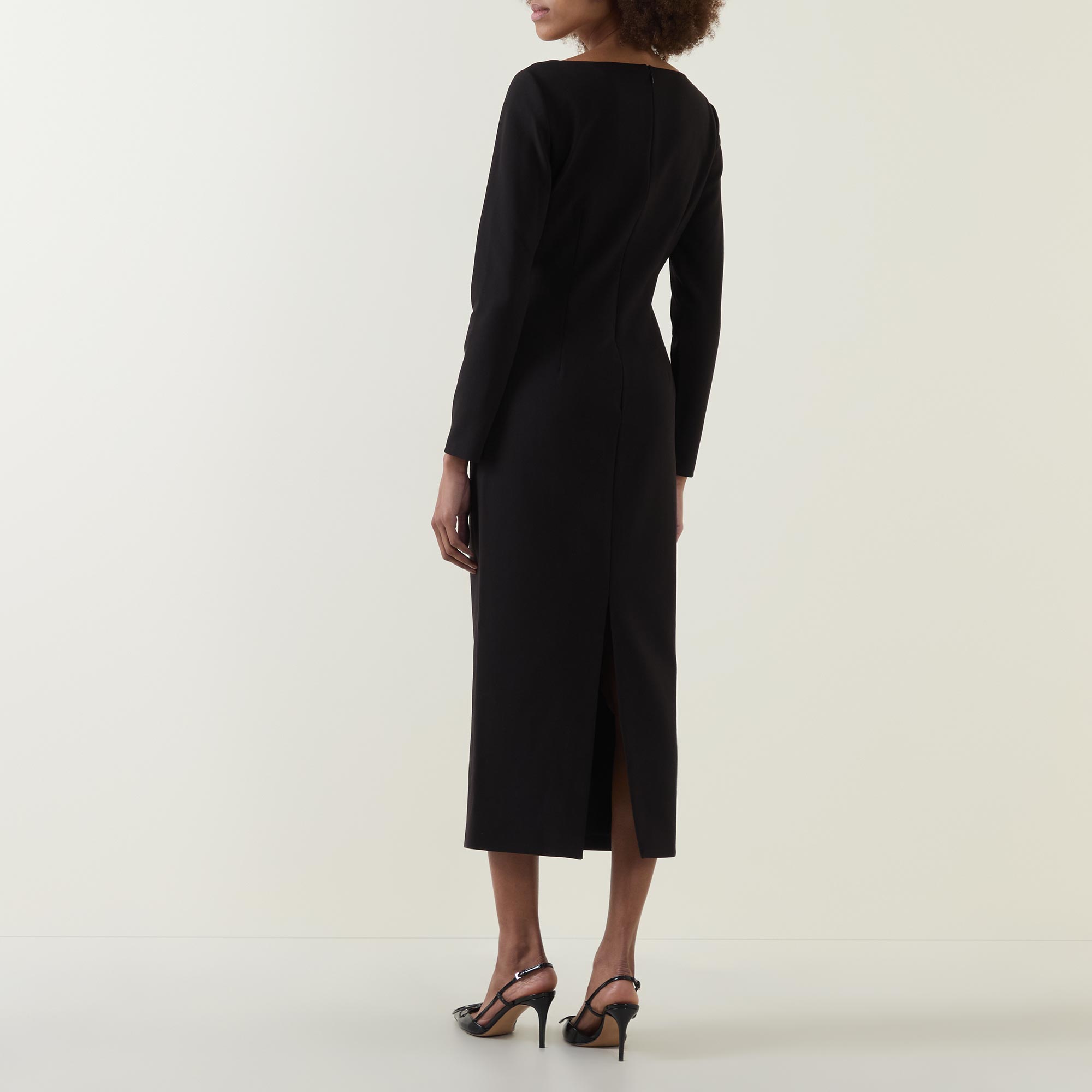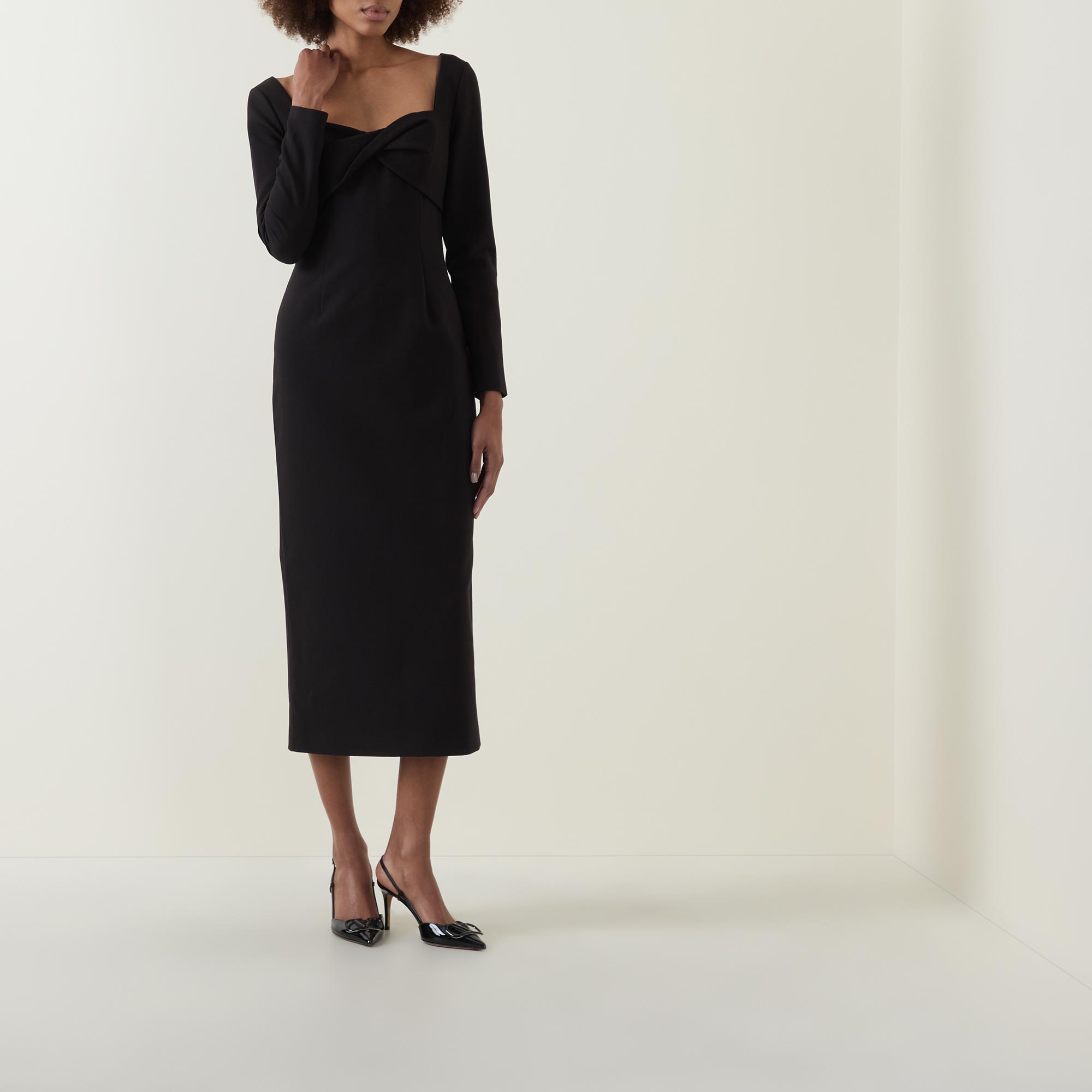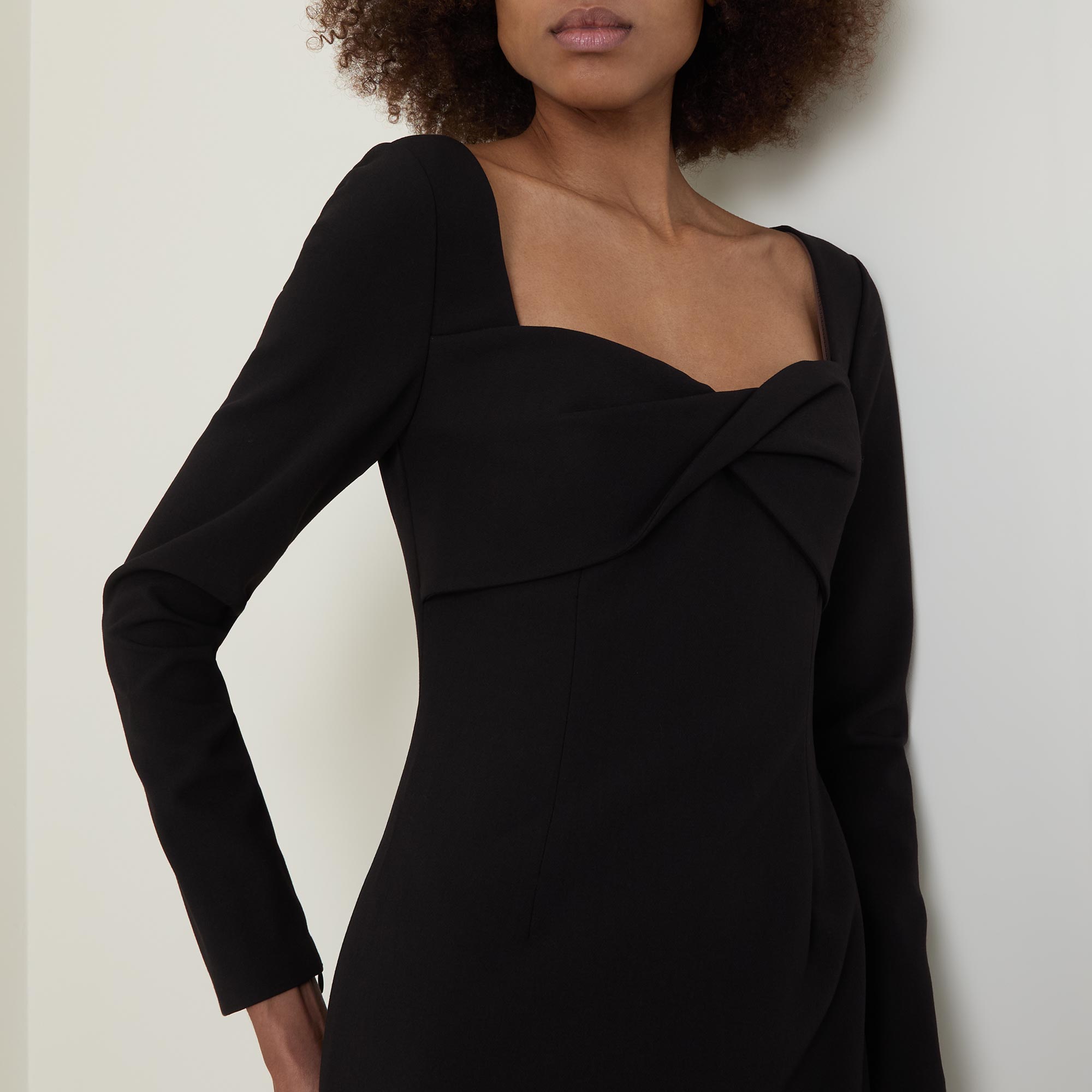 - Twisted detail, sweetheart neckline, long sleeves, midi length, zip fastening, vented, encased boning, removable shoulders pads, full lining, stretch crepe fabric