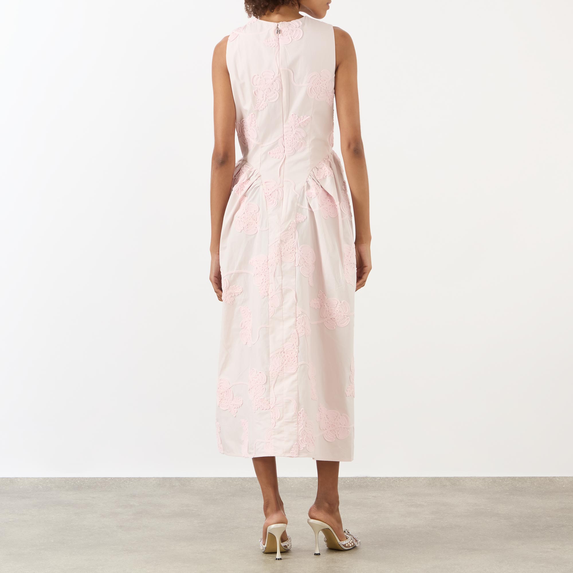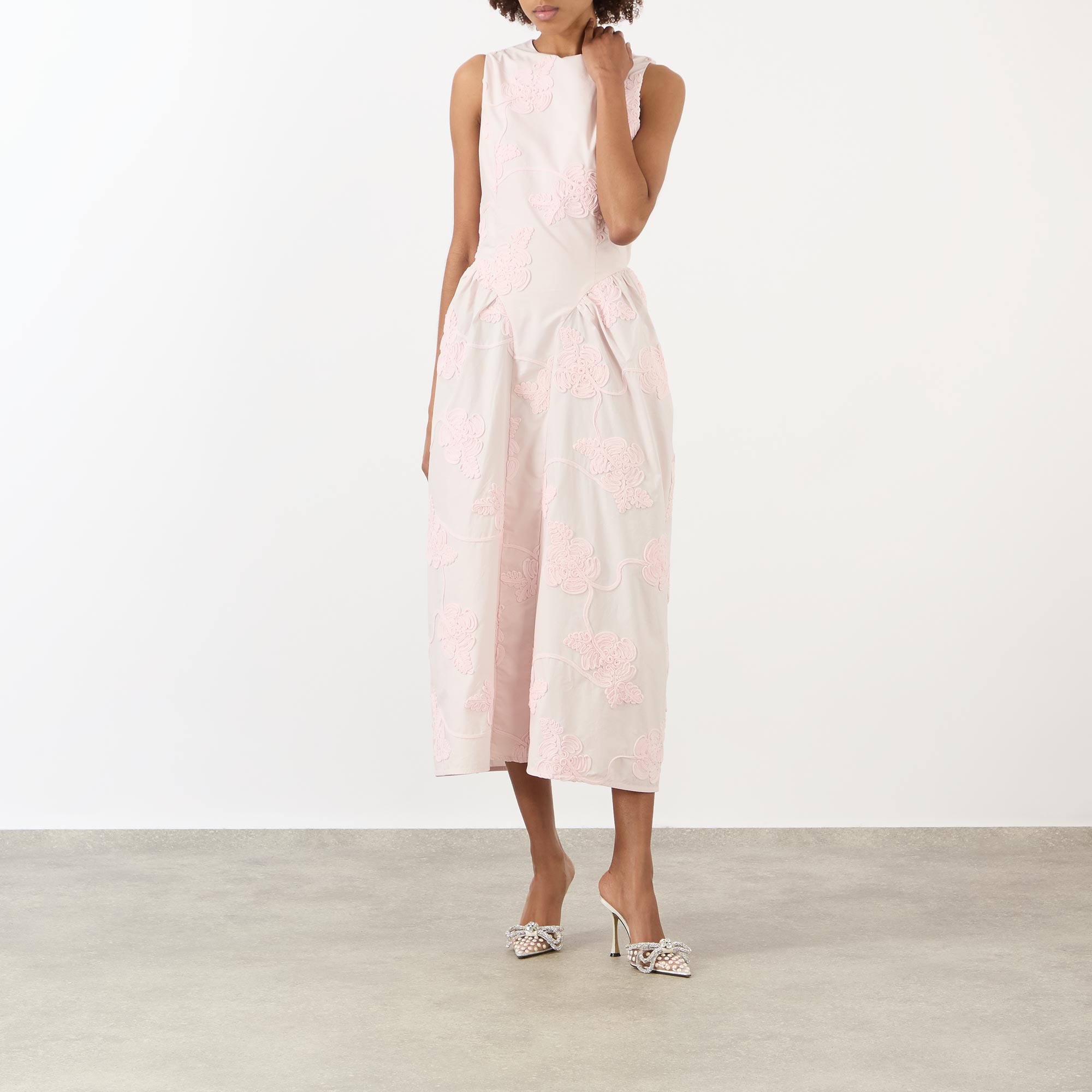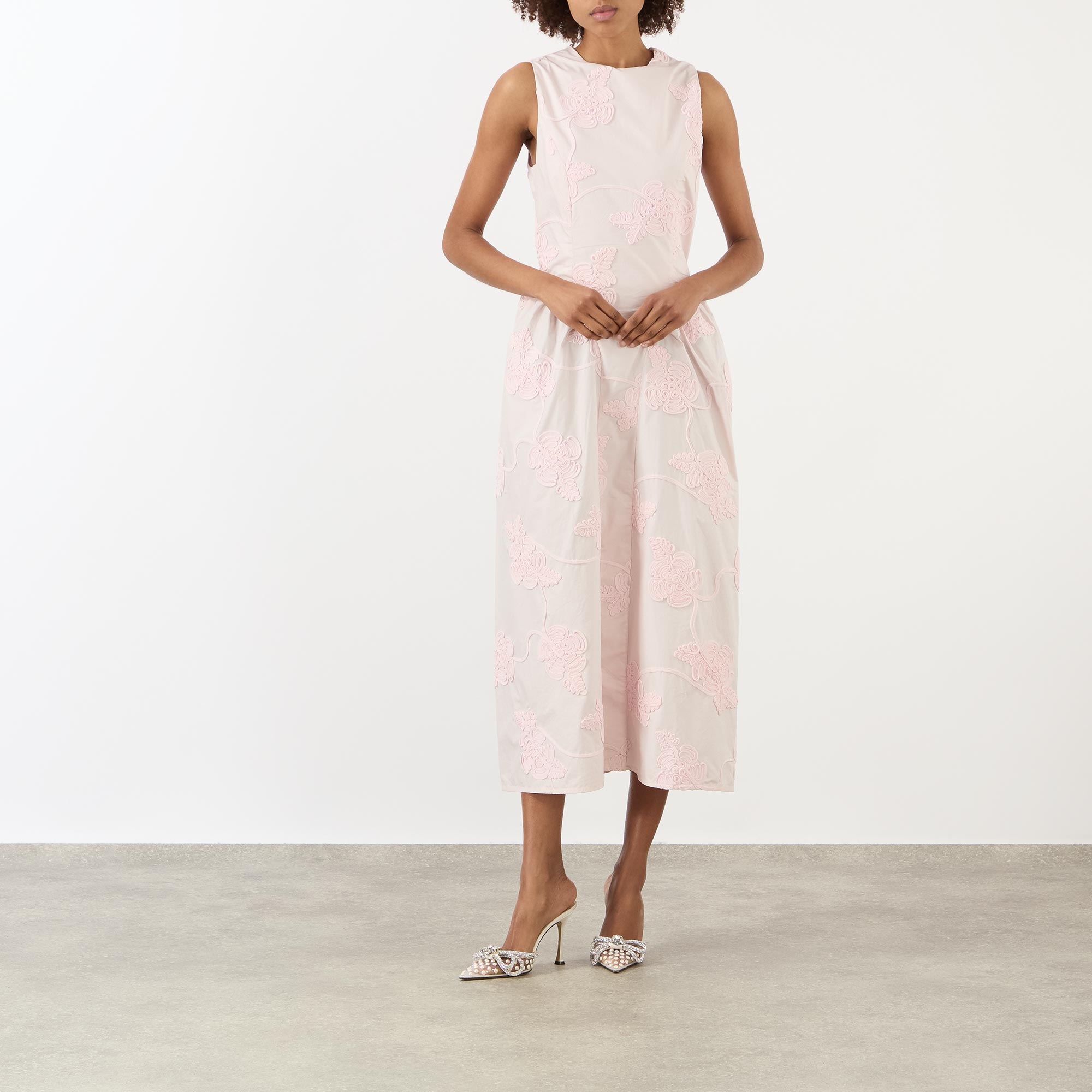 - Round neckline, sleeveless, midi length, fitted bodice, voluminous skirt and hips, zip fastening, embroidered floral details, lined