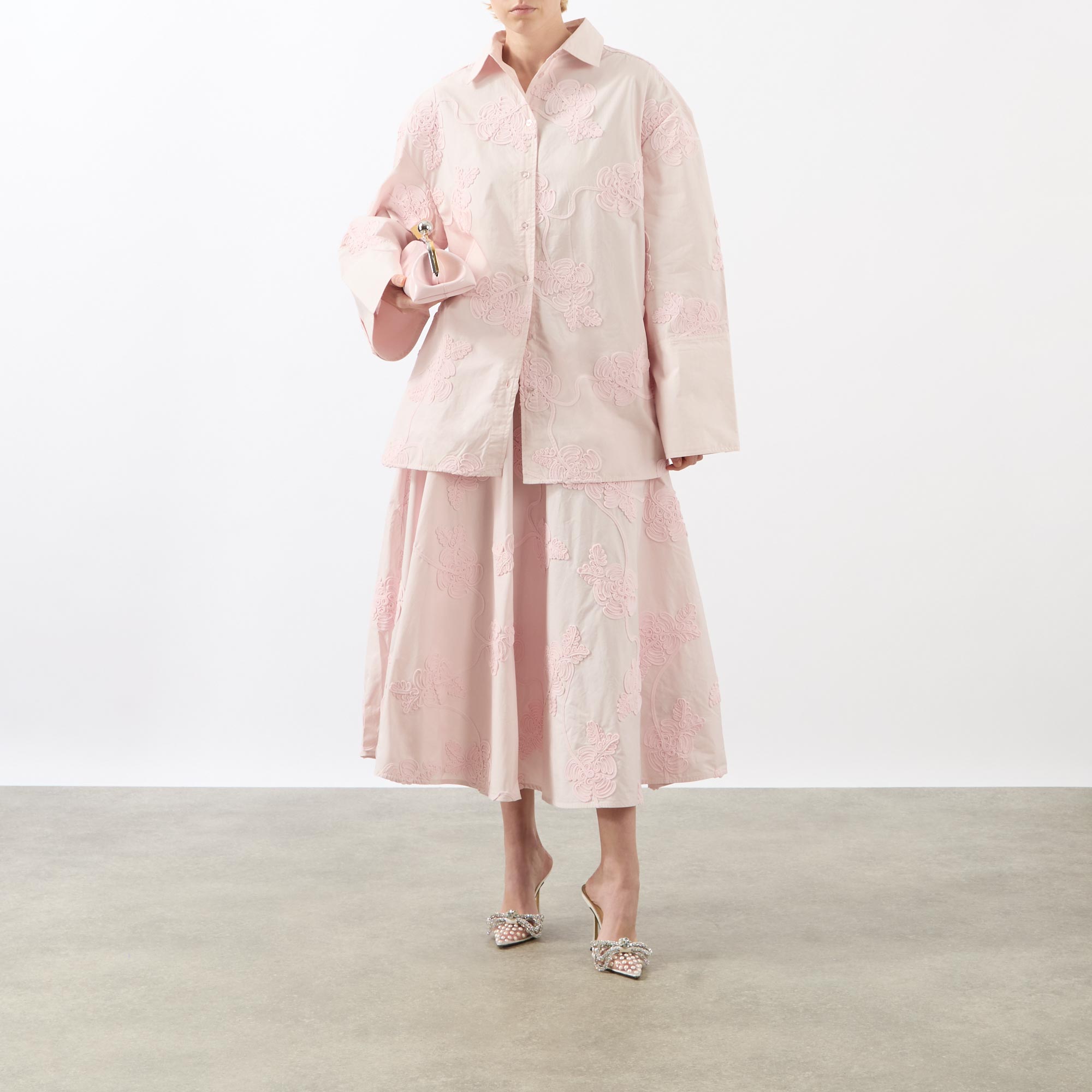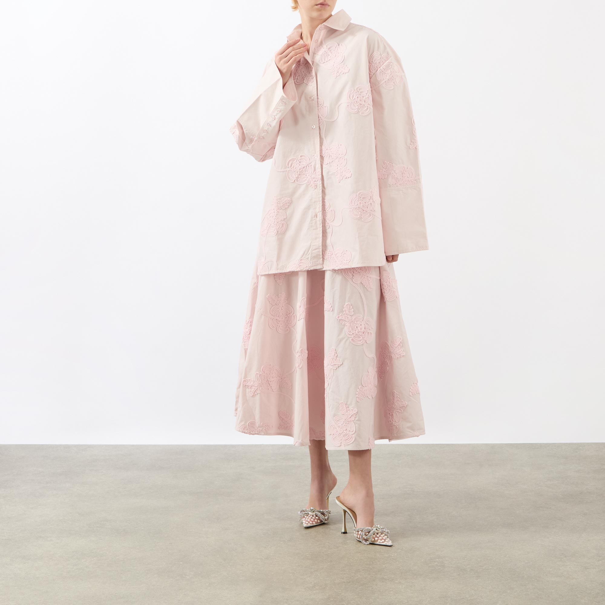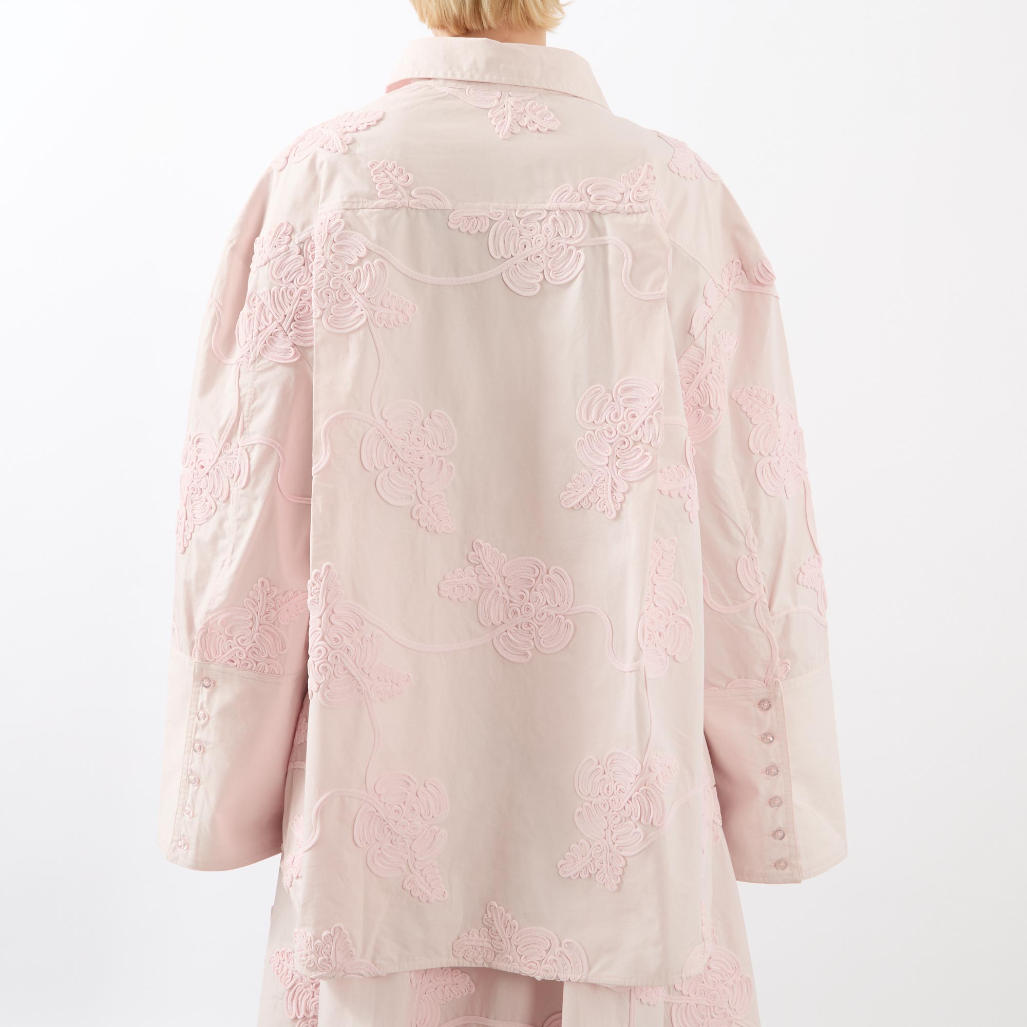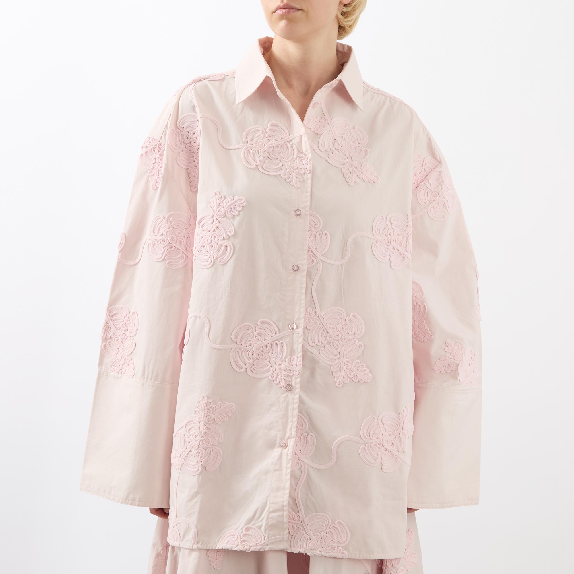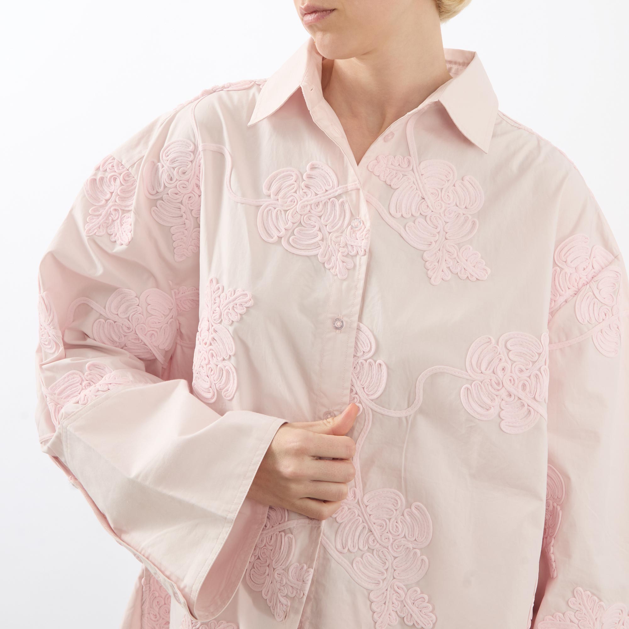 - Classic collar, button fastening, wide-cut long sleeves, dropped shoulders, straight hemline, extended cuffs with button fastening, embroidered floral details
