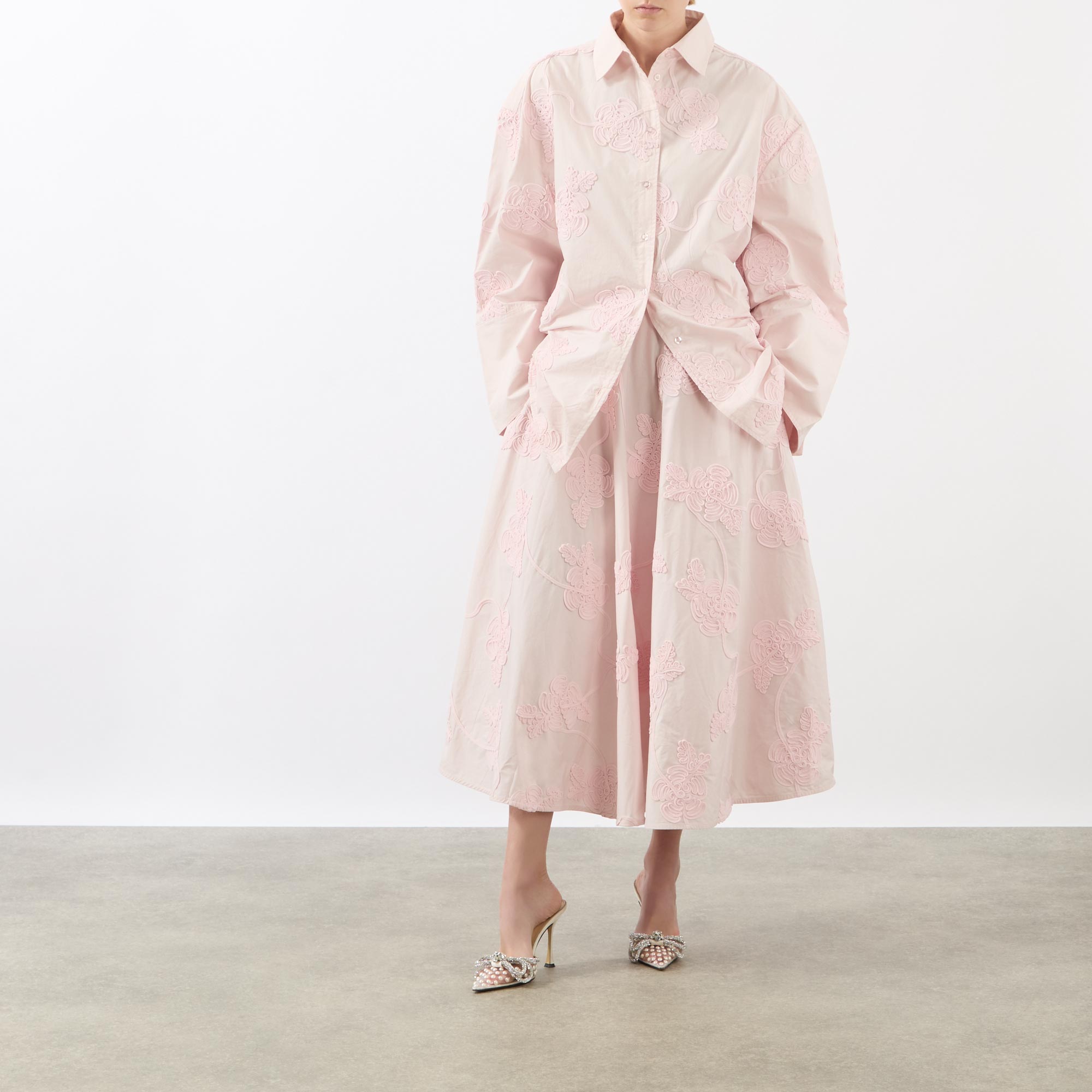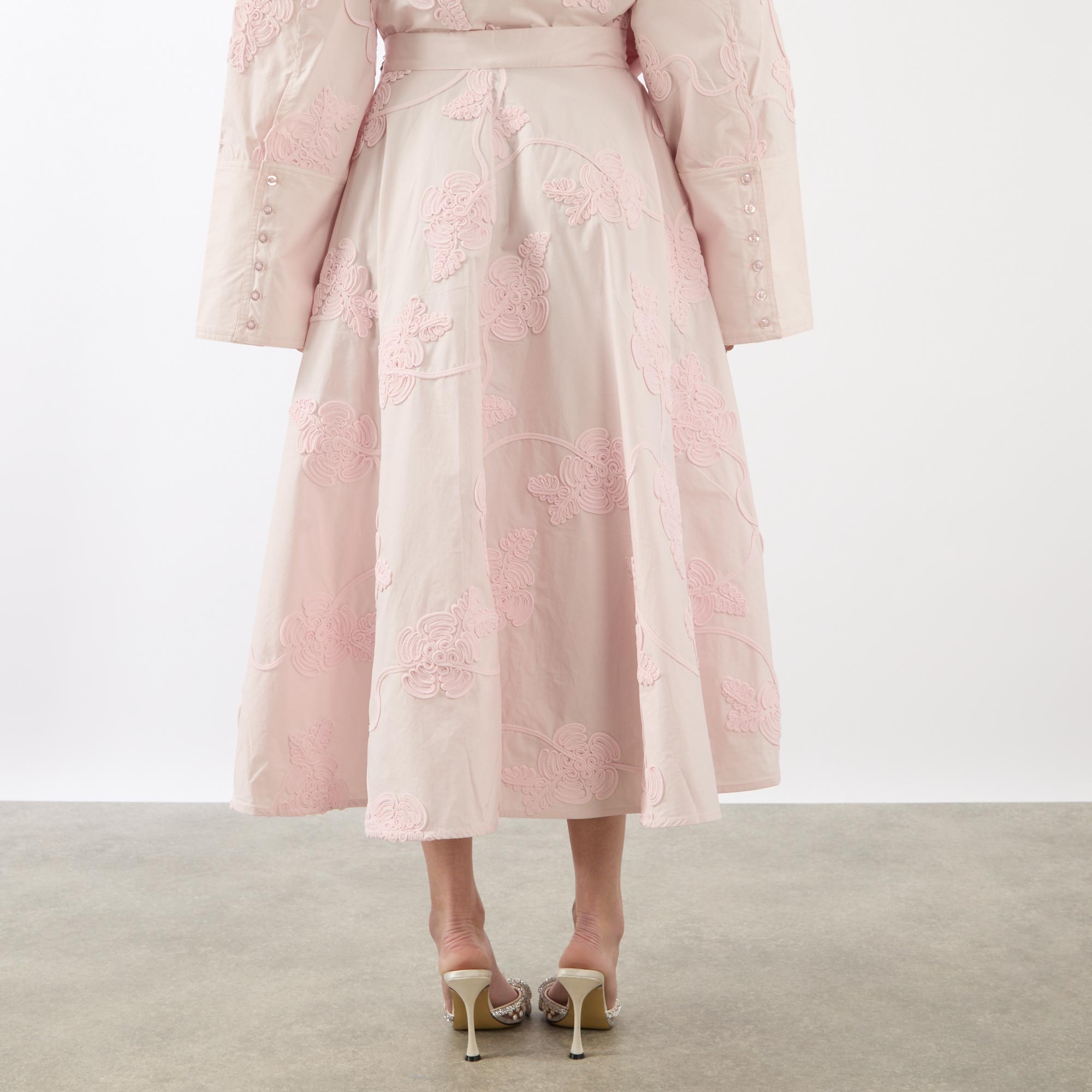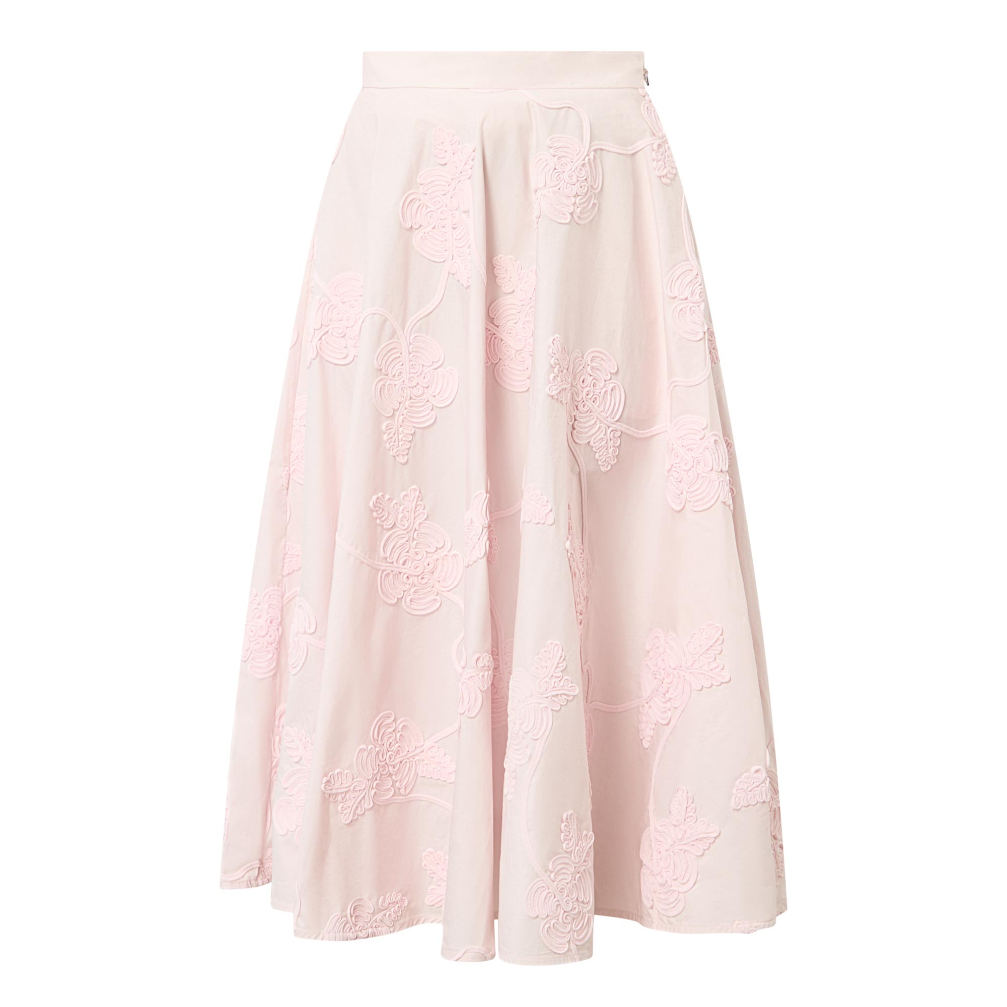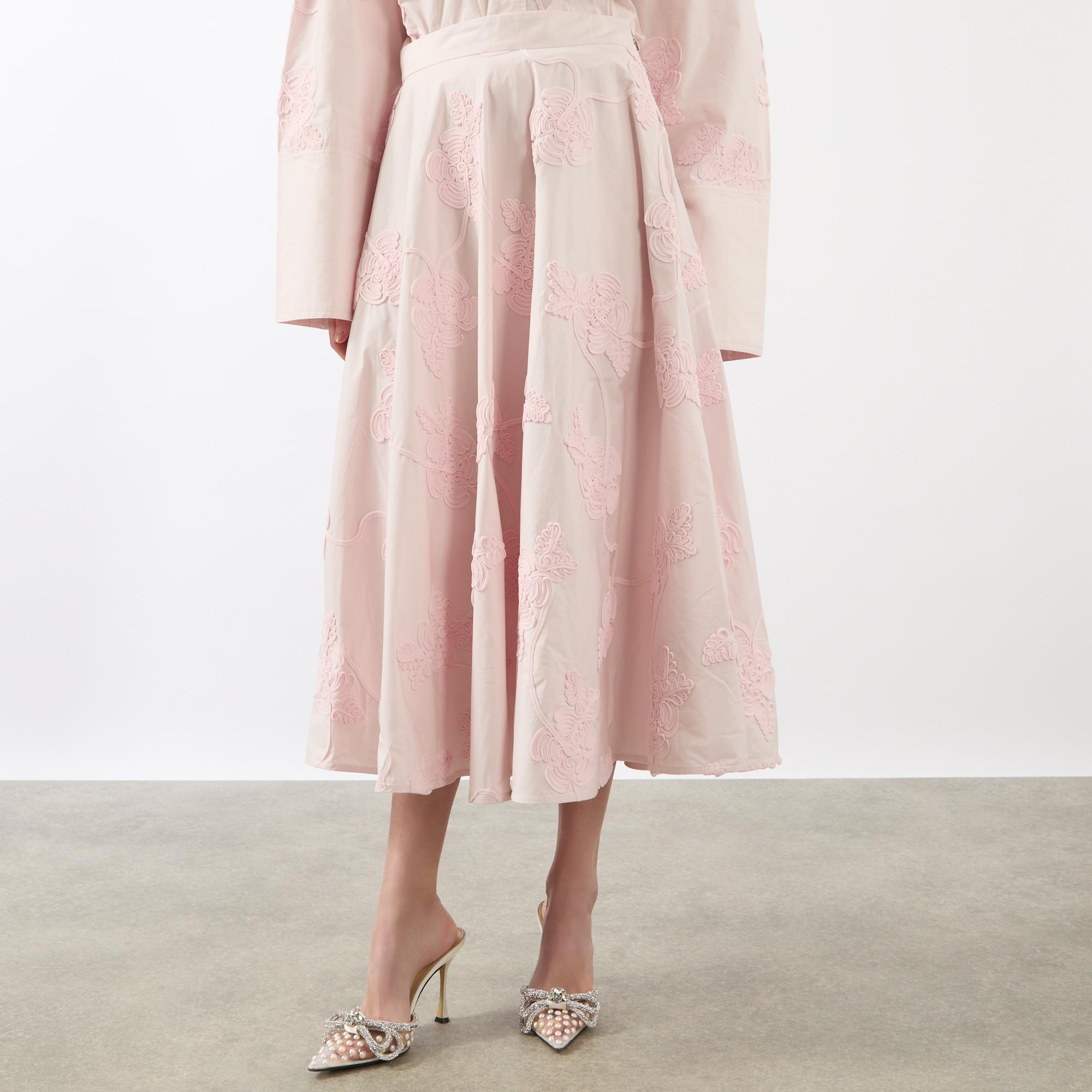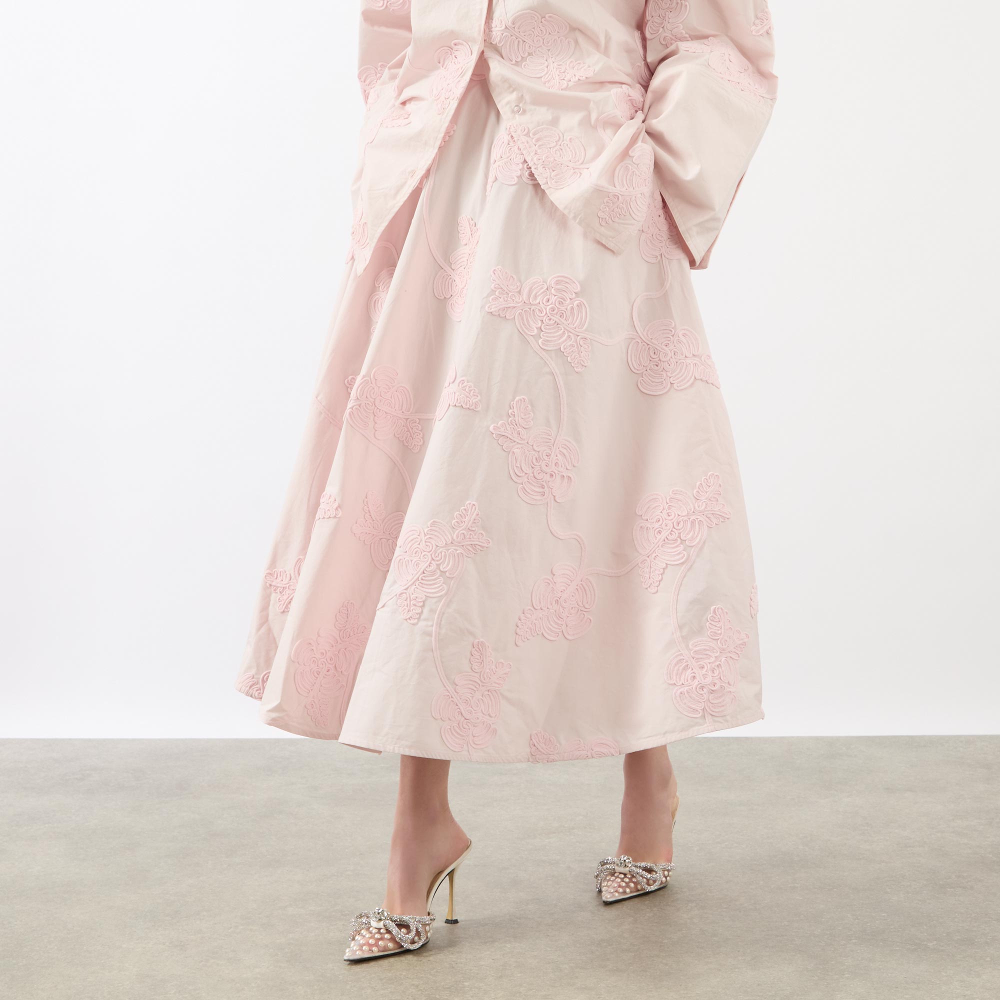 - Structured waistband, midi length, voluminous hemline, embroidered floral details, side entry pockets