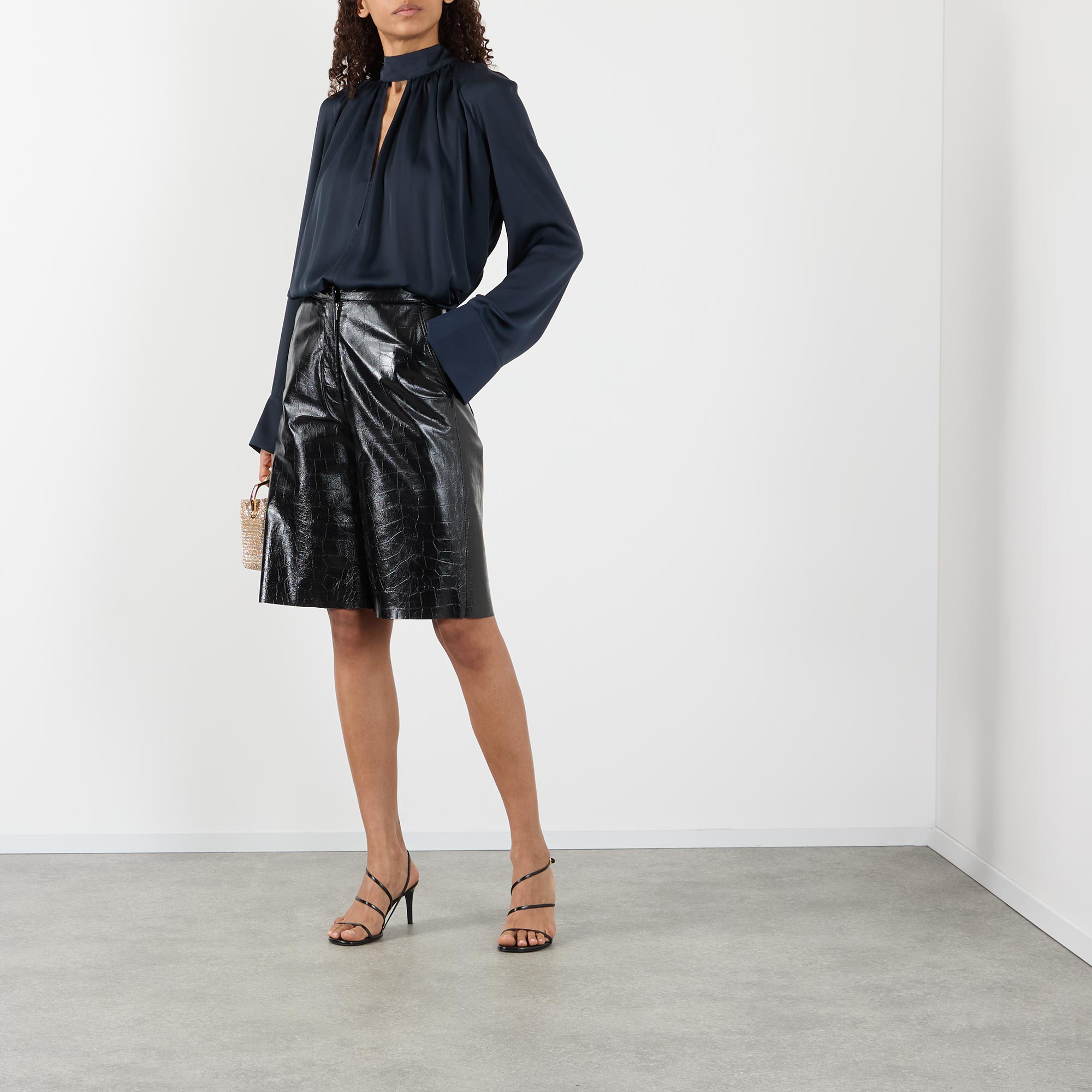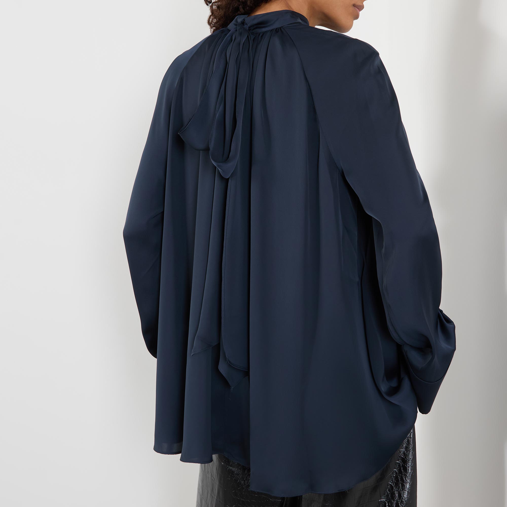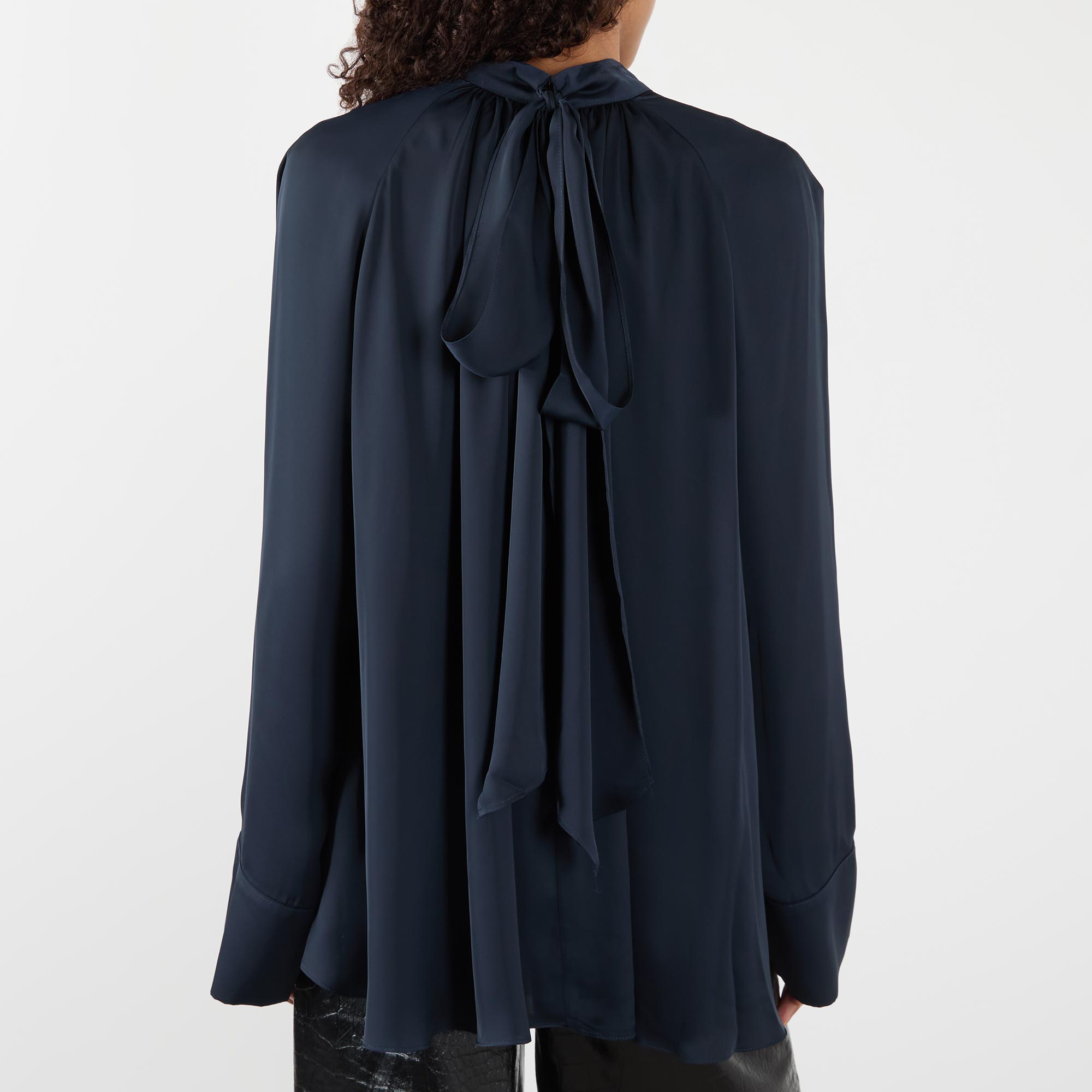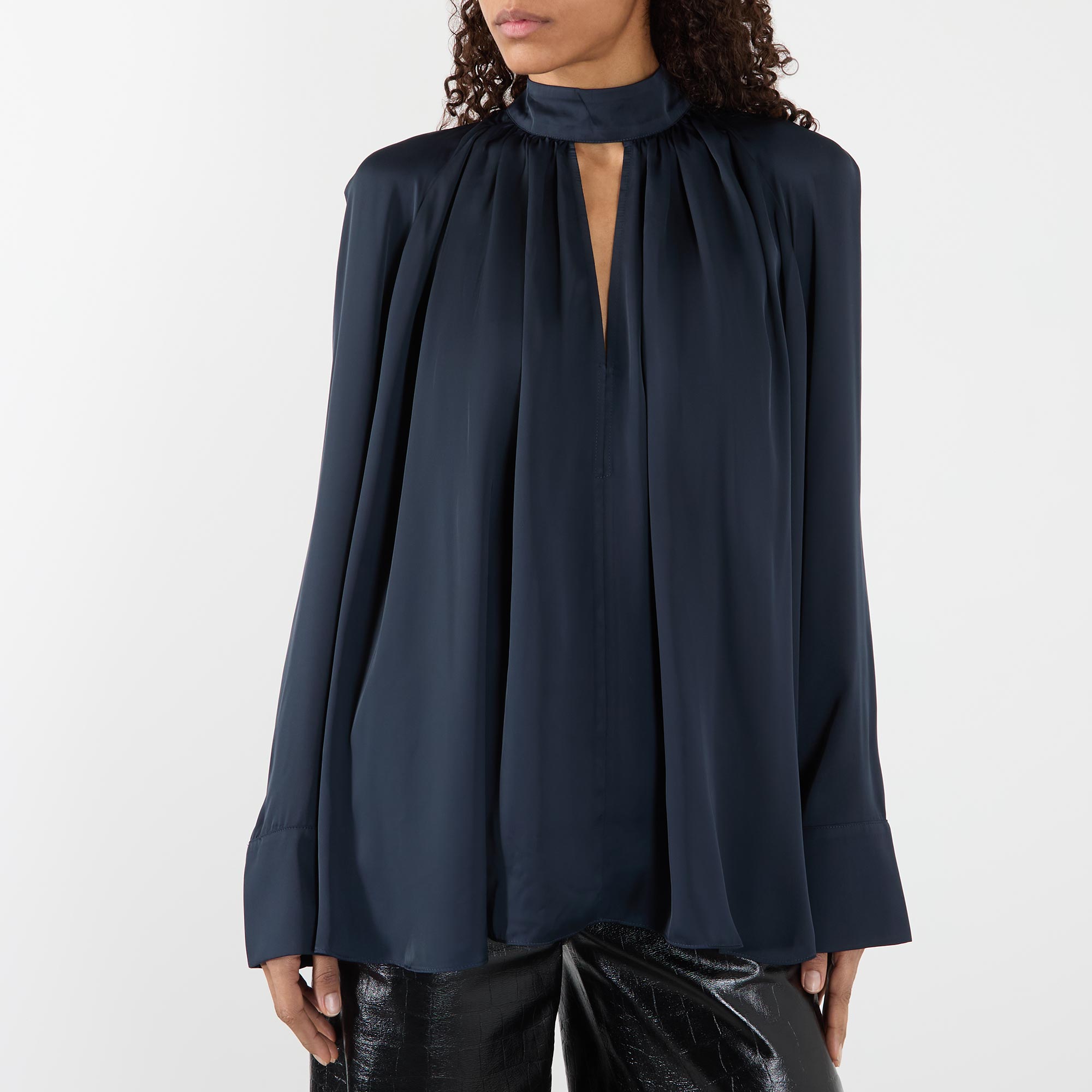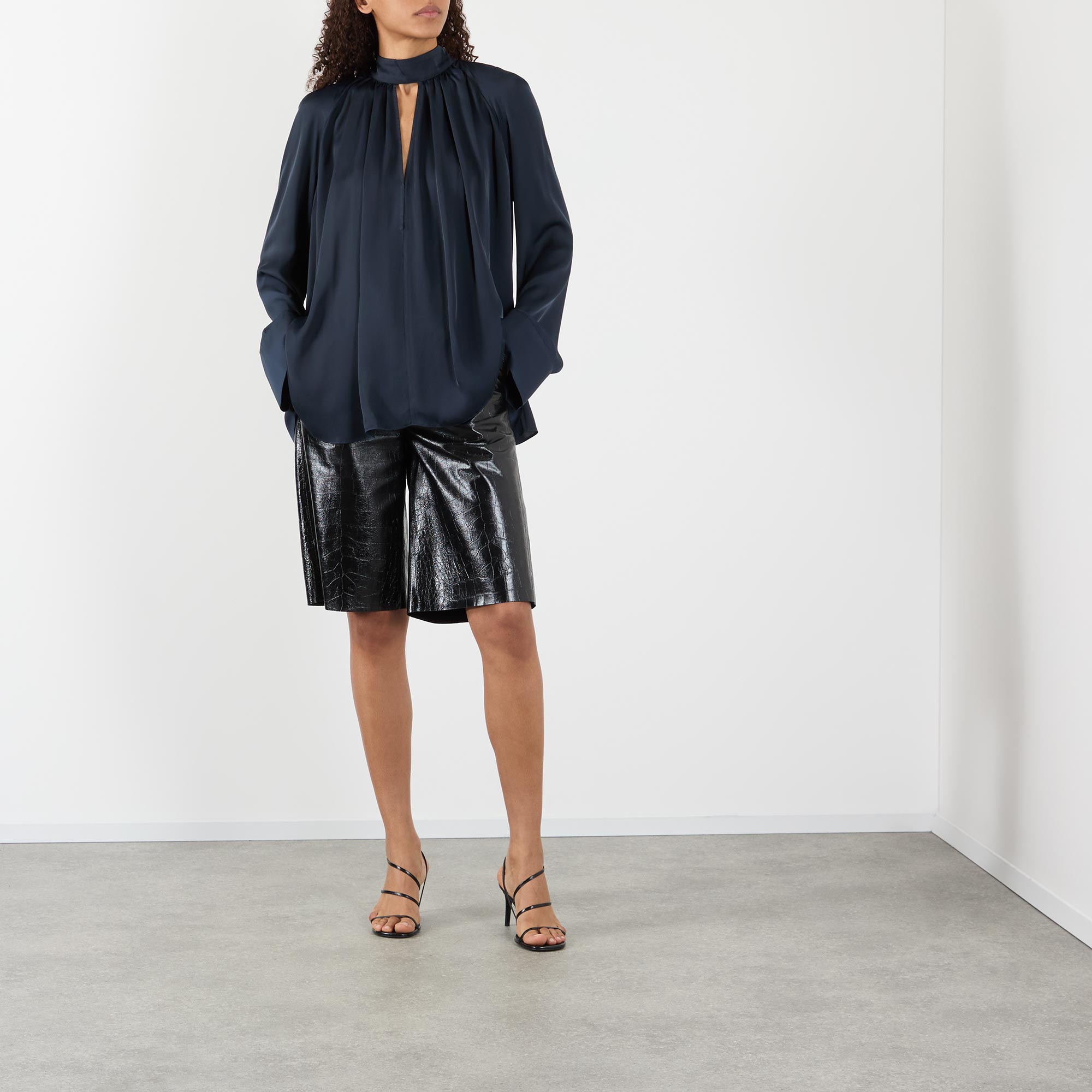 - Stand-up collar, peekaboo cut-out, long sleeves, pleated style, rear bow detail, smooth satin finish