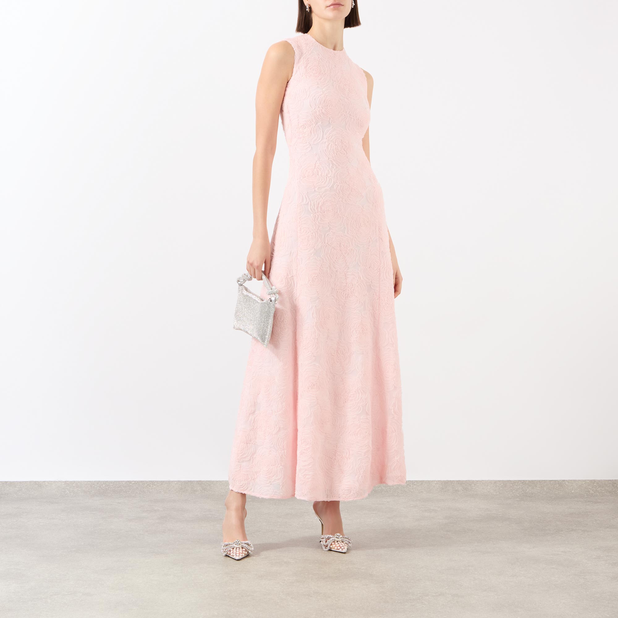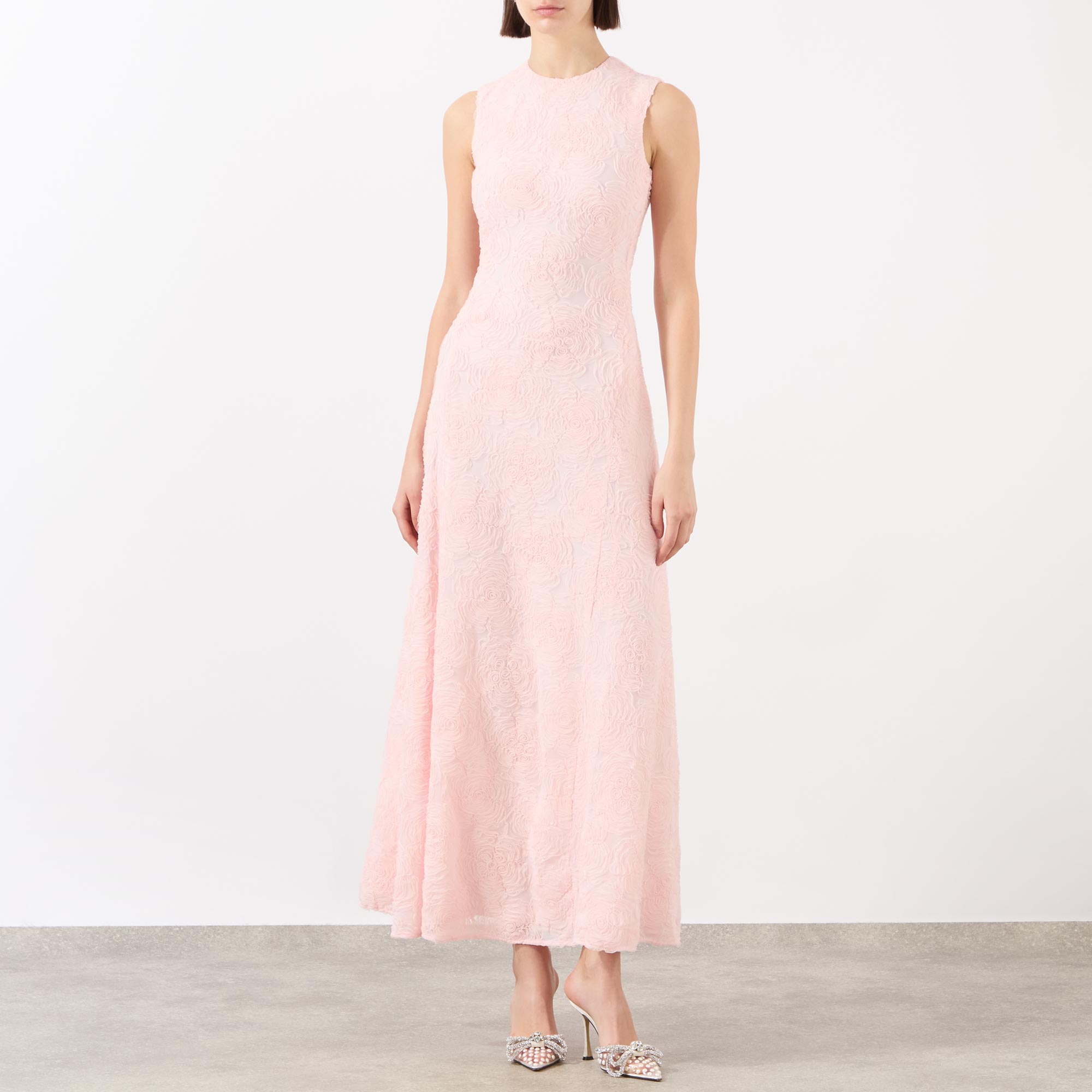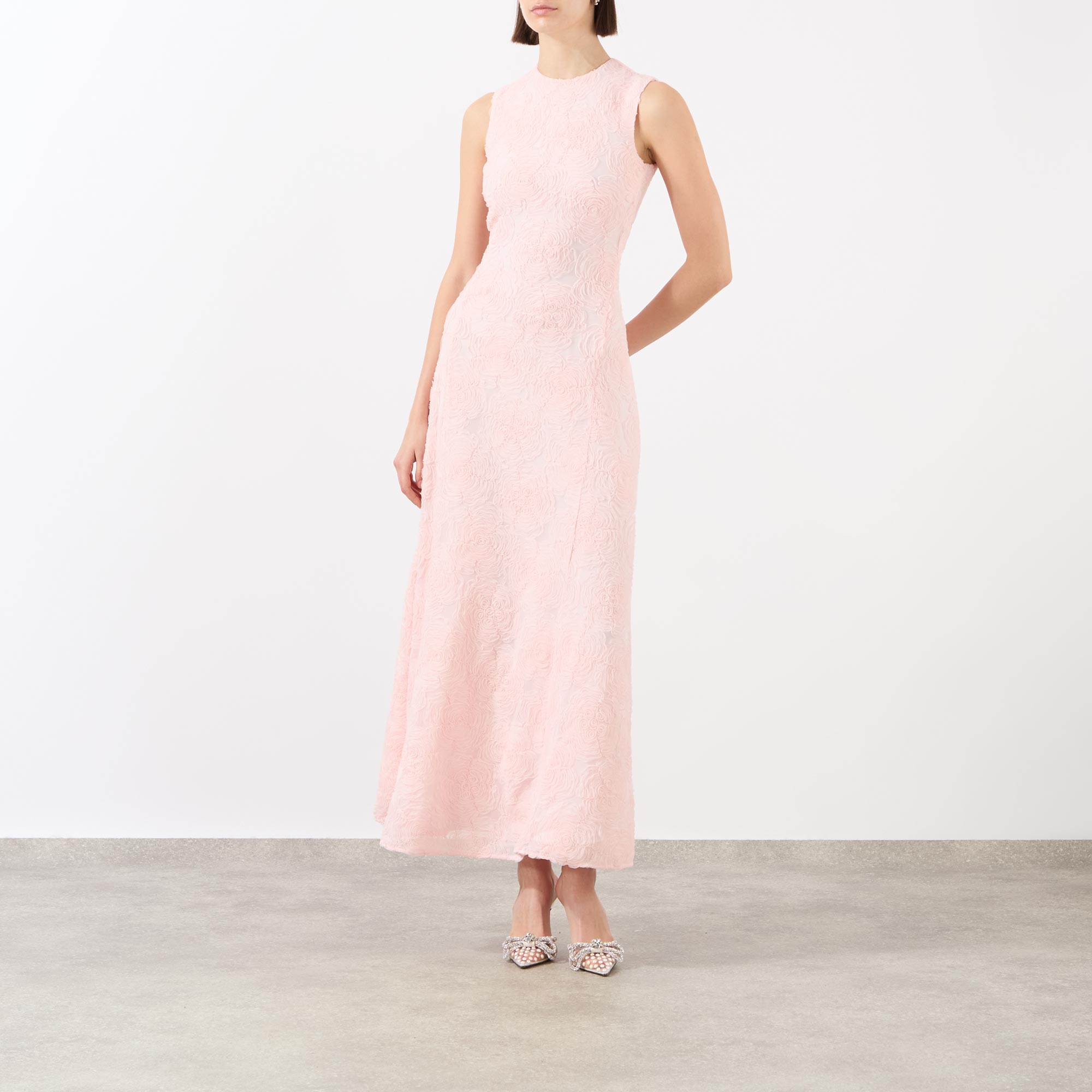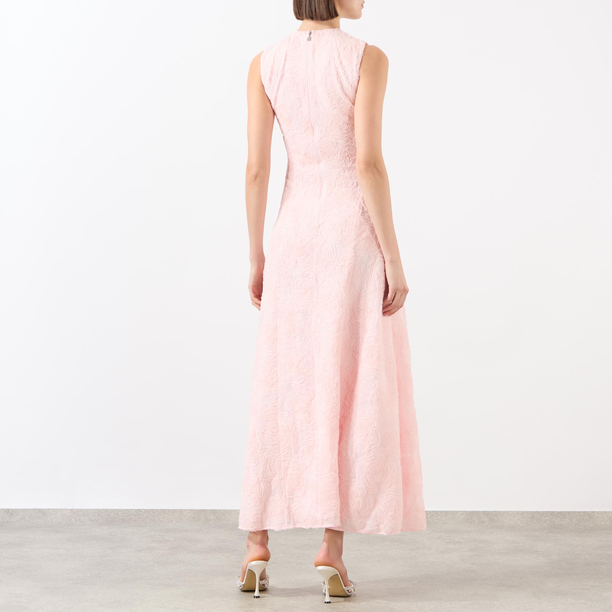 - Round neckline, sleeveless, maxi length, jacquard floral details, zip fastening