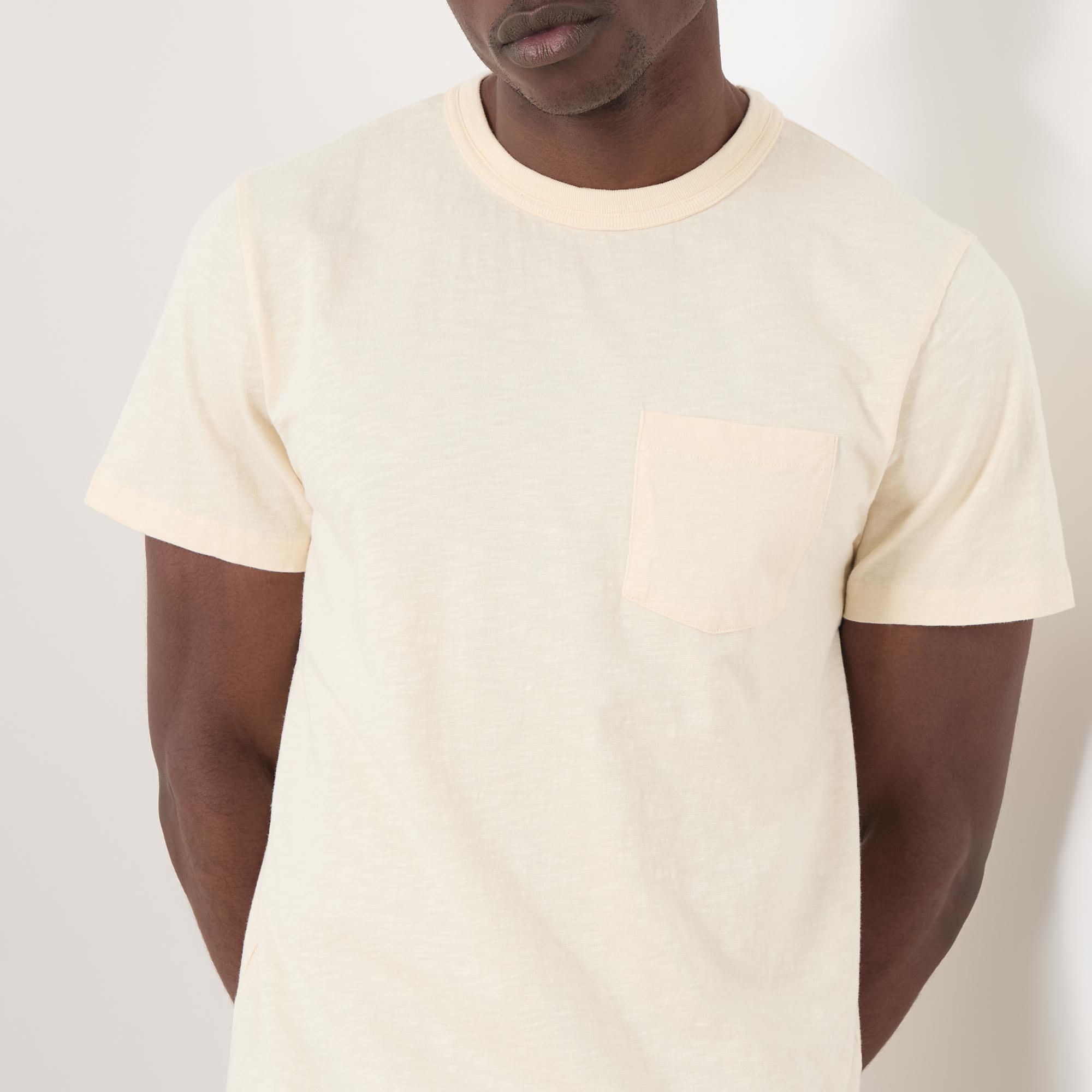- Round neck, short sleeves, straight hemline, chest pocket