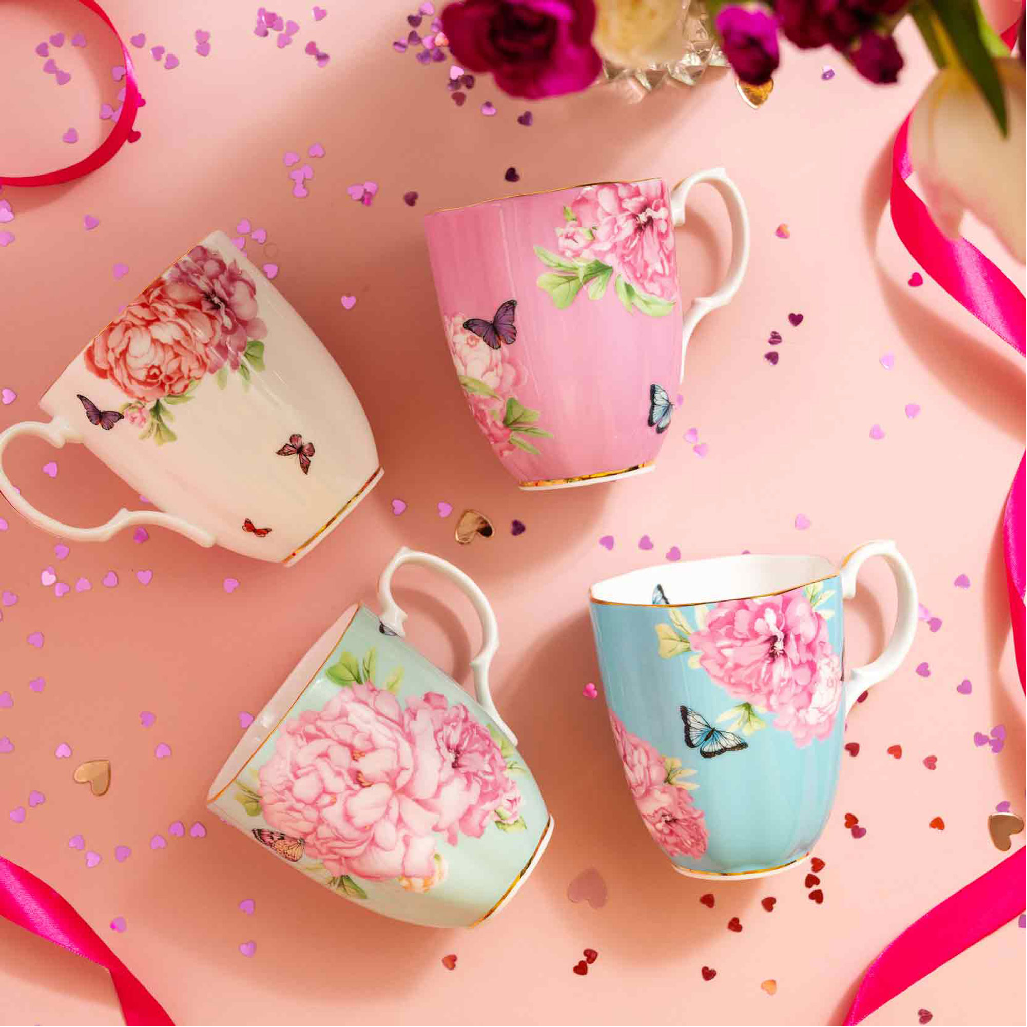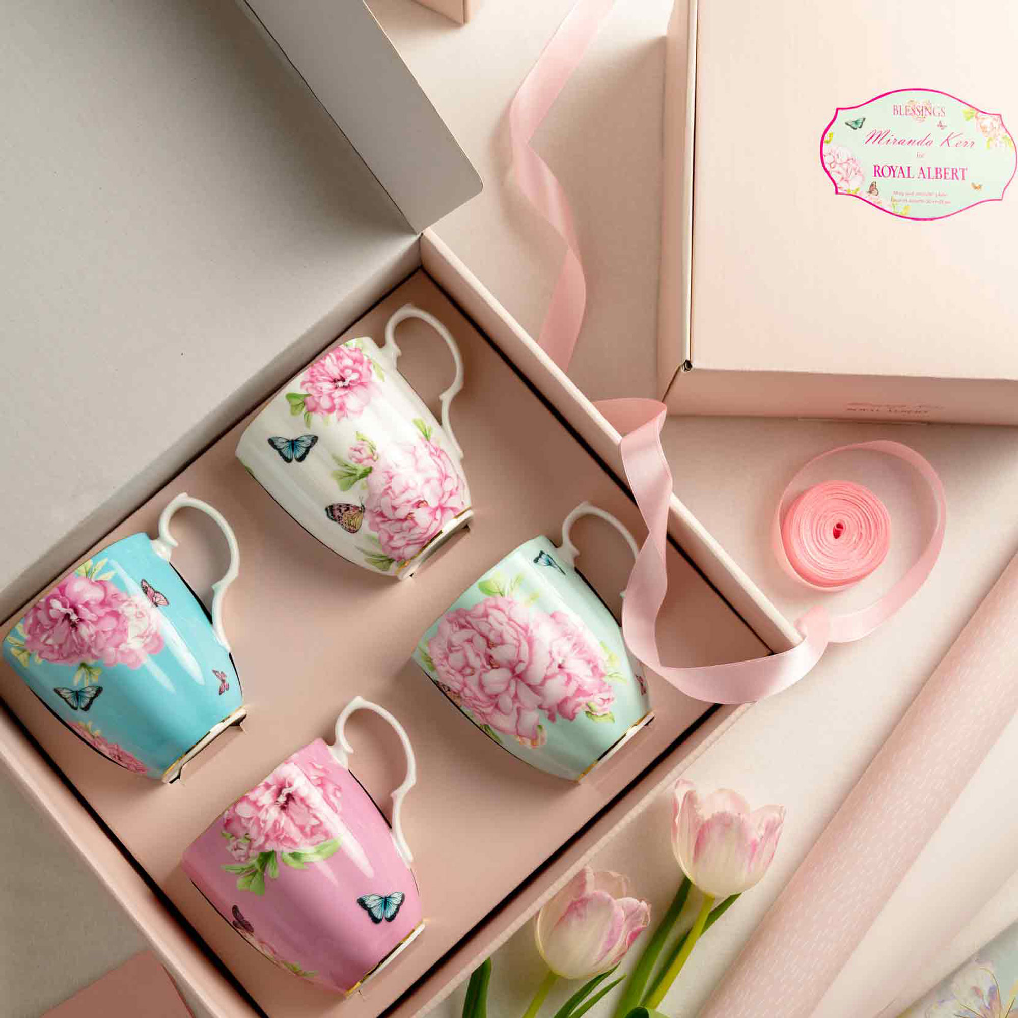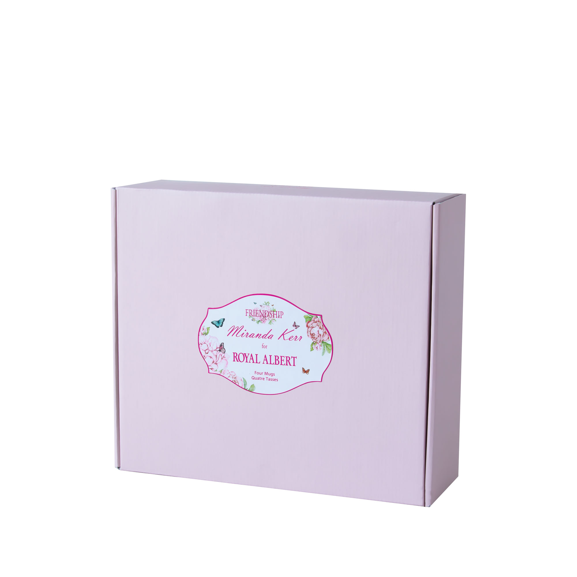 This beautiful four-piece Friendship Mug set from the Miranda Kerr Collection is made of fine bone china. Decorated with bright floral patterns and butterfly accents, this charming mix and match set is ideal for hosting family and friends at home for tea.