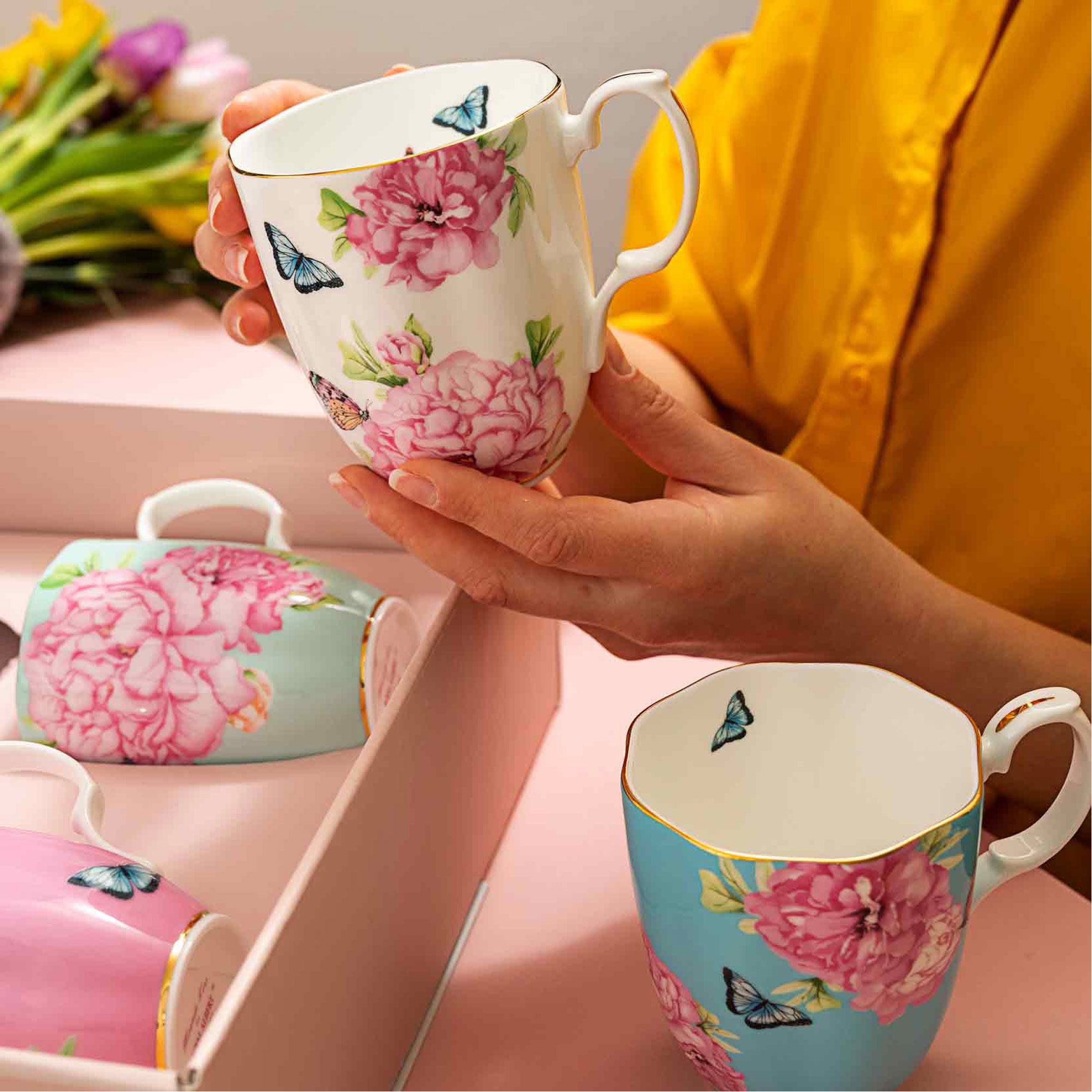 - Miranda Kerr Friendship design, four mugs, gold-tone lining, floral pattern, mix and match style