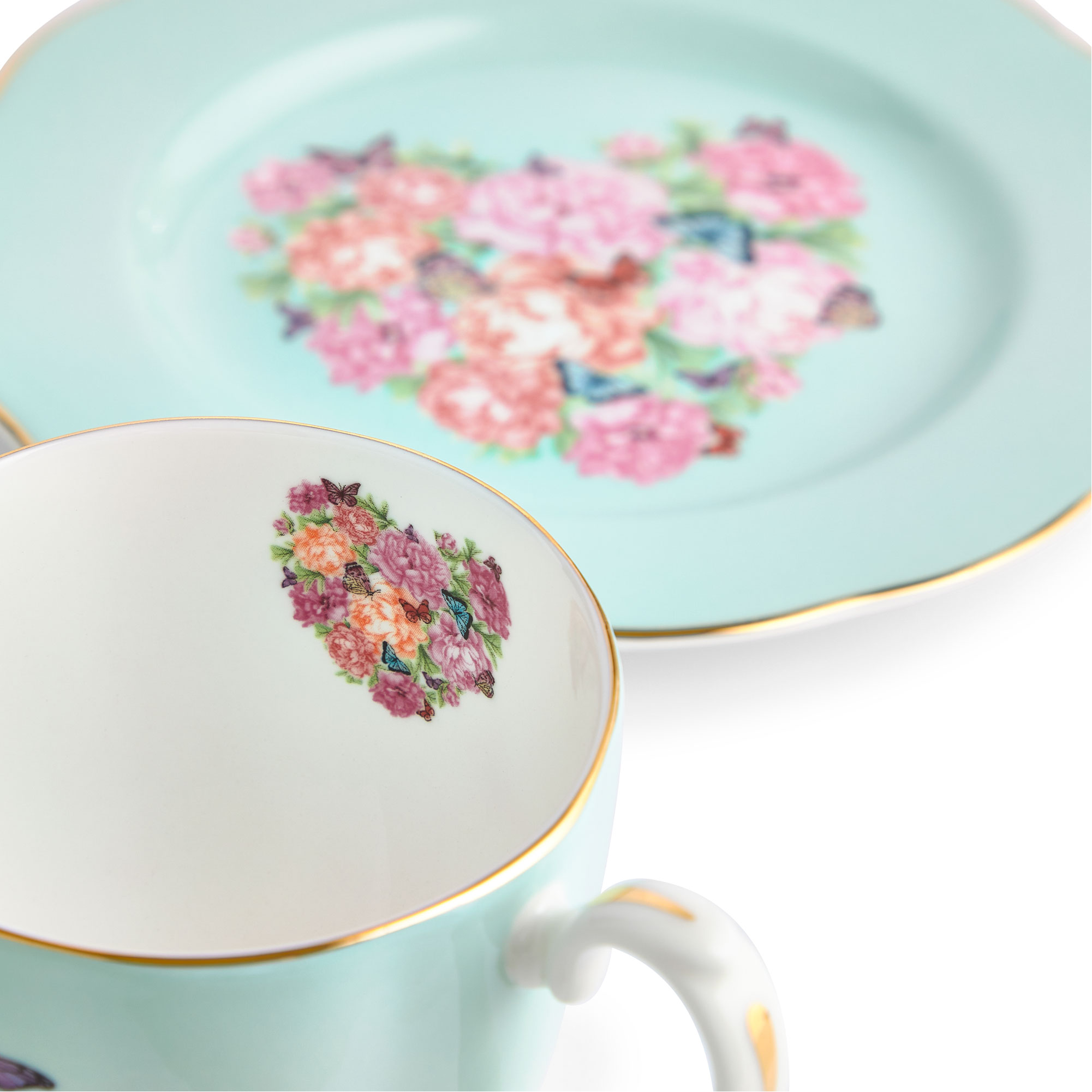 • Mug and plate set, fine bone china, gold-tone lining, floral pattern