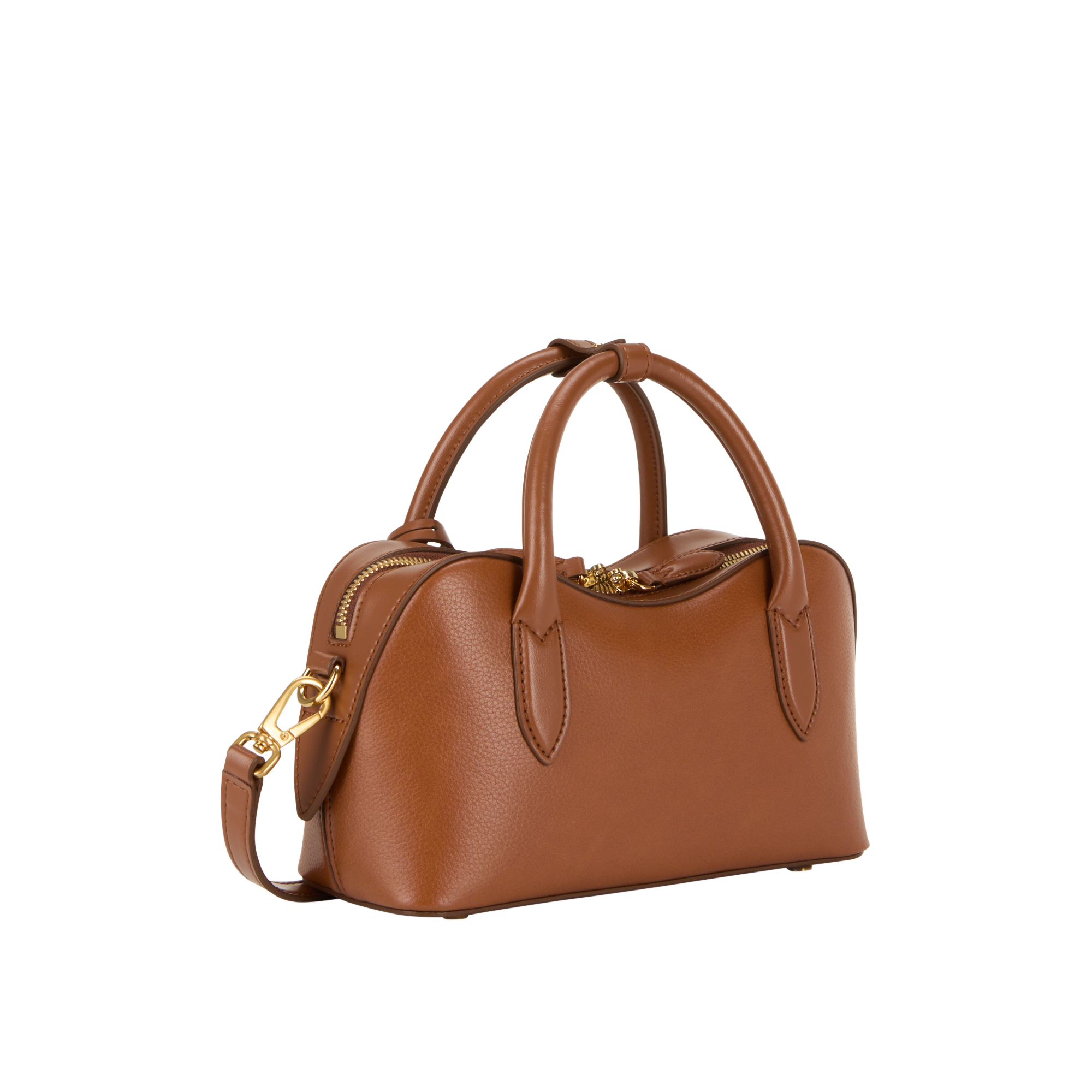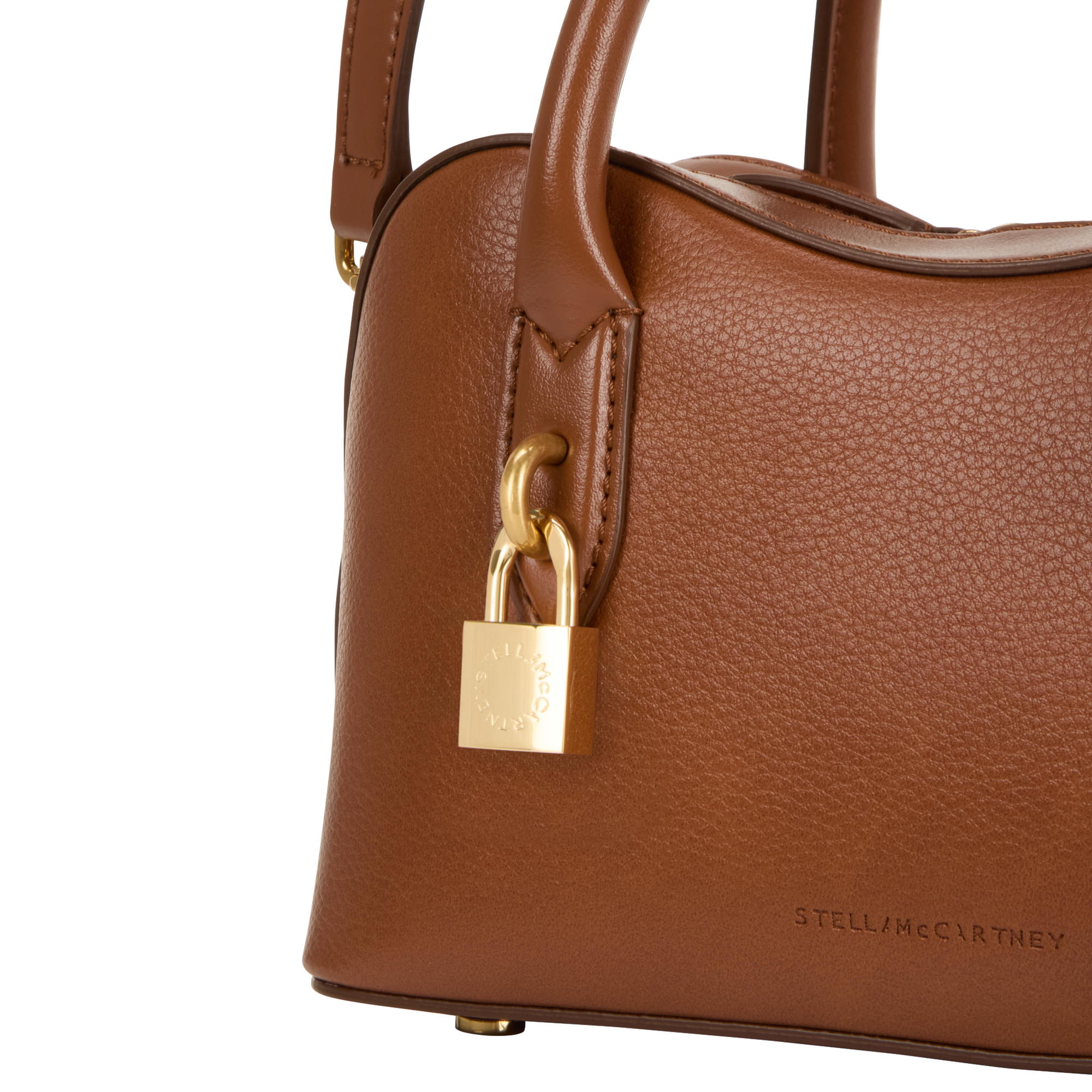 - Top handles, two-way top zip fastening, detachable and adjustable crossbody strap, detachable tag, lock charm, gold-tone hardware, structured silhouette, logo detail, four protective foot studs
