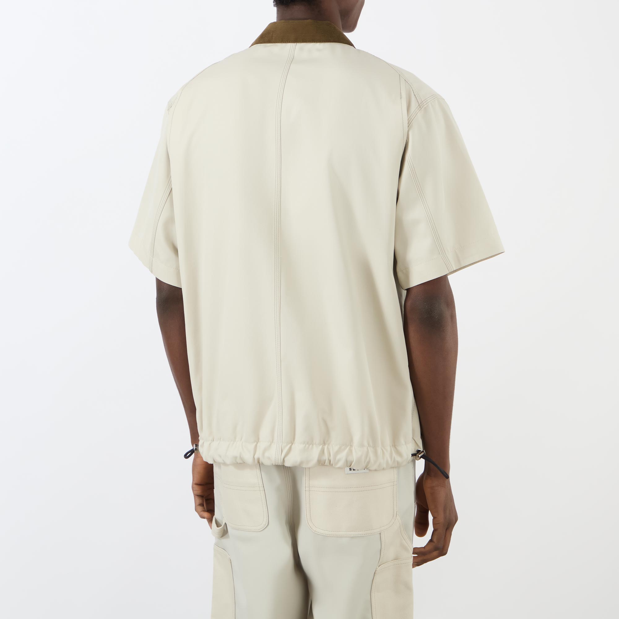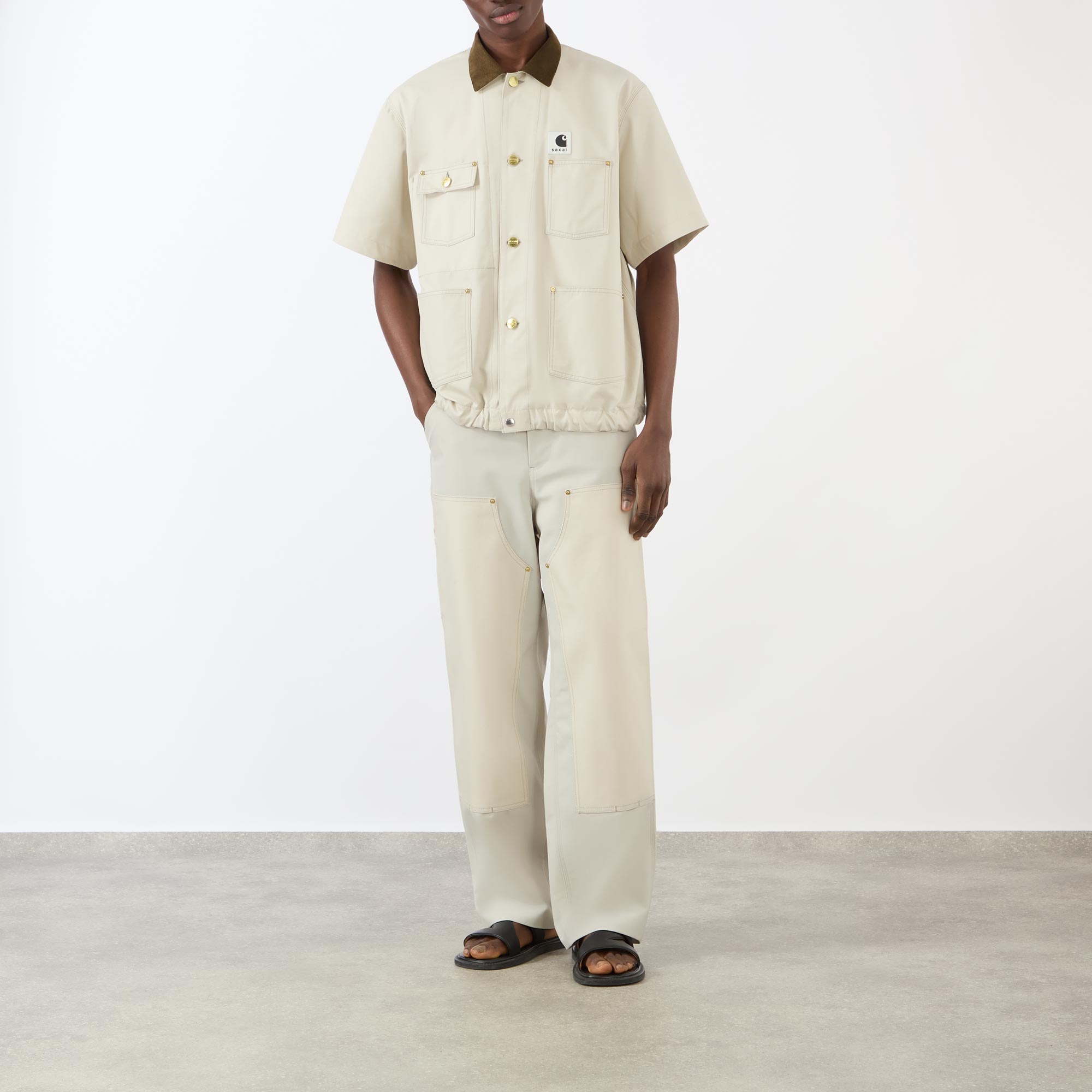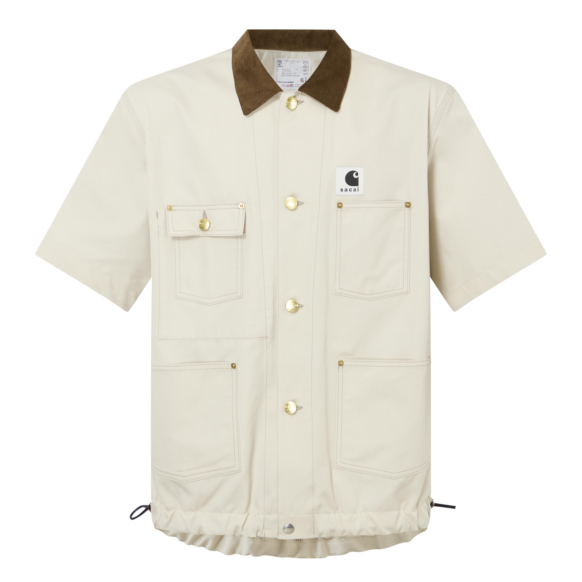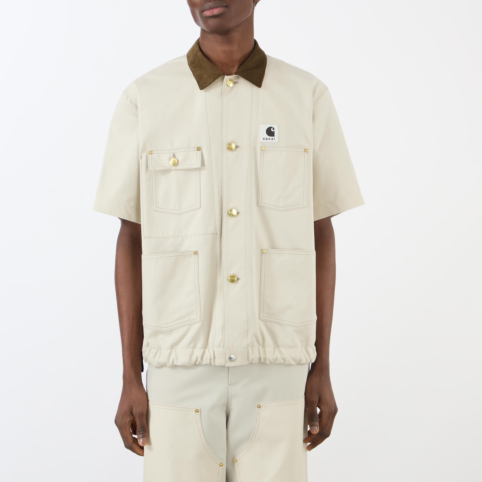 - Flat corduroy collar, button fastening, short sleeves, chest pockets, patch pockets, sacai x Carhartt WIP logo badge, toggle adjustable hemline