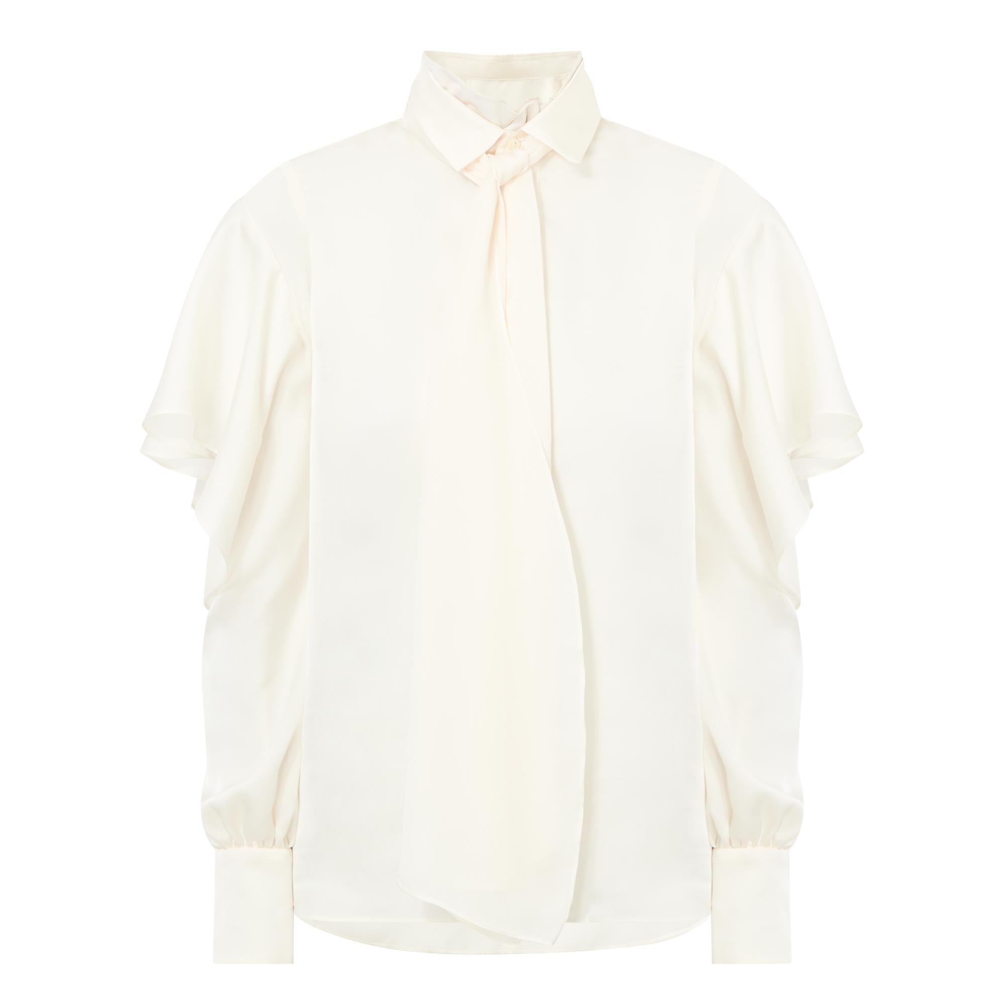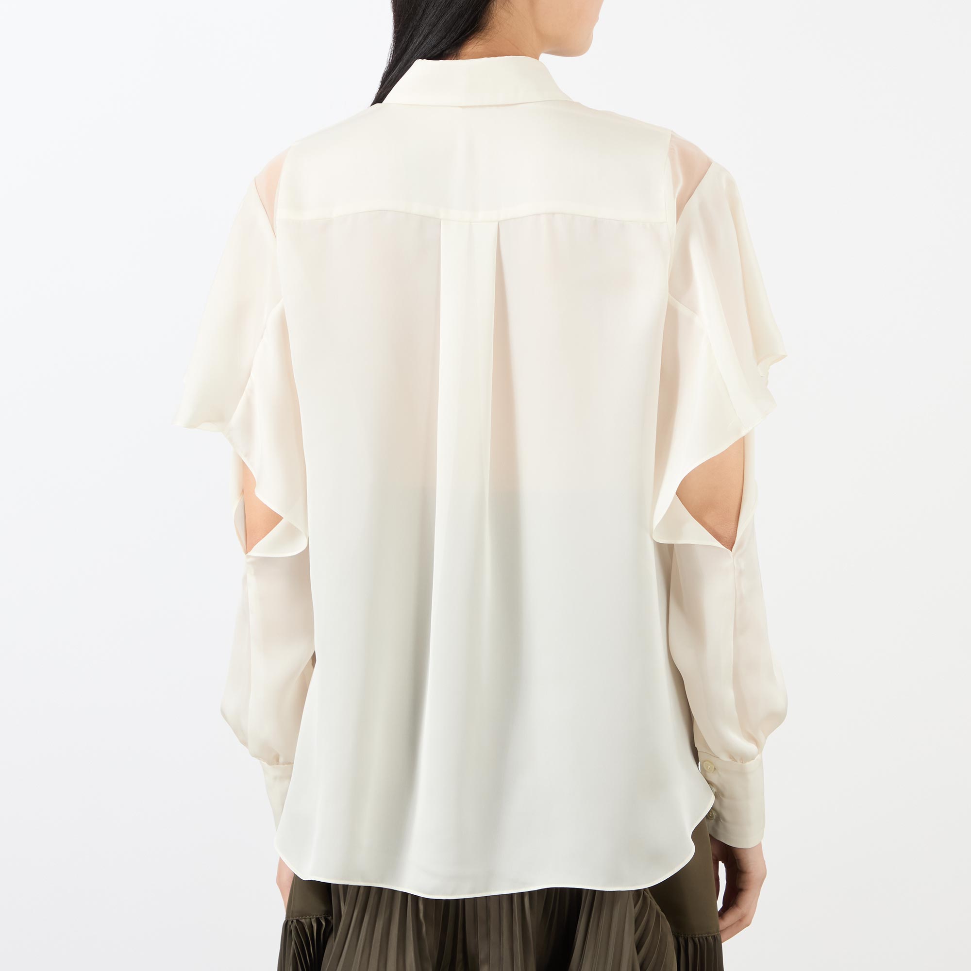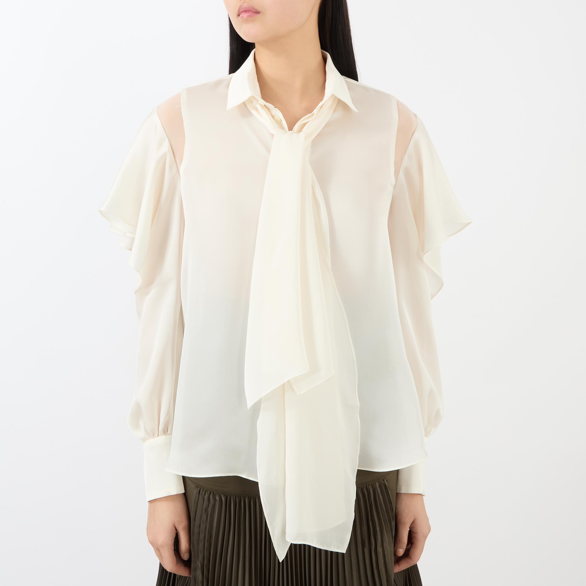 - Point collar, long ruffle sleeves with open cut-outs, concealed button placket, long neck tie detail, back box pleat, buttoned cuffs, curved hemline, smooth chiffon fabric