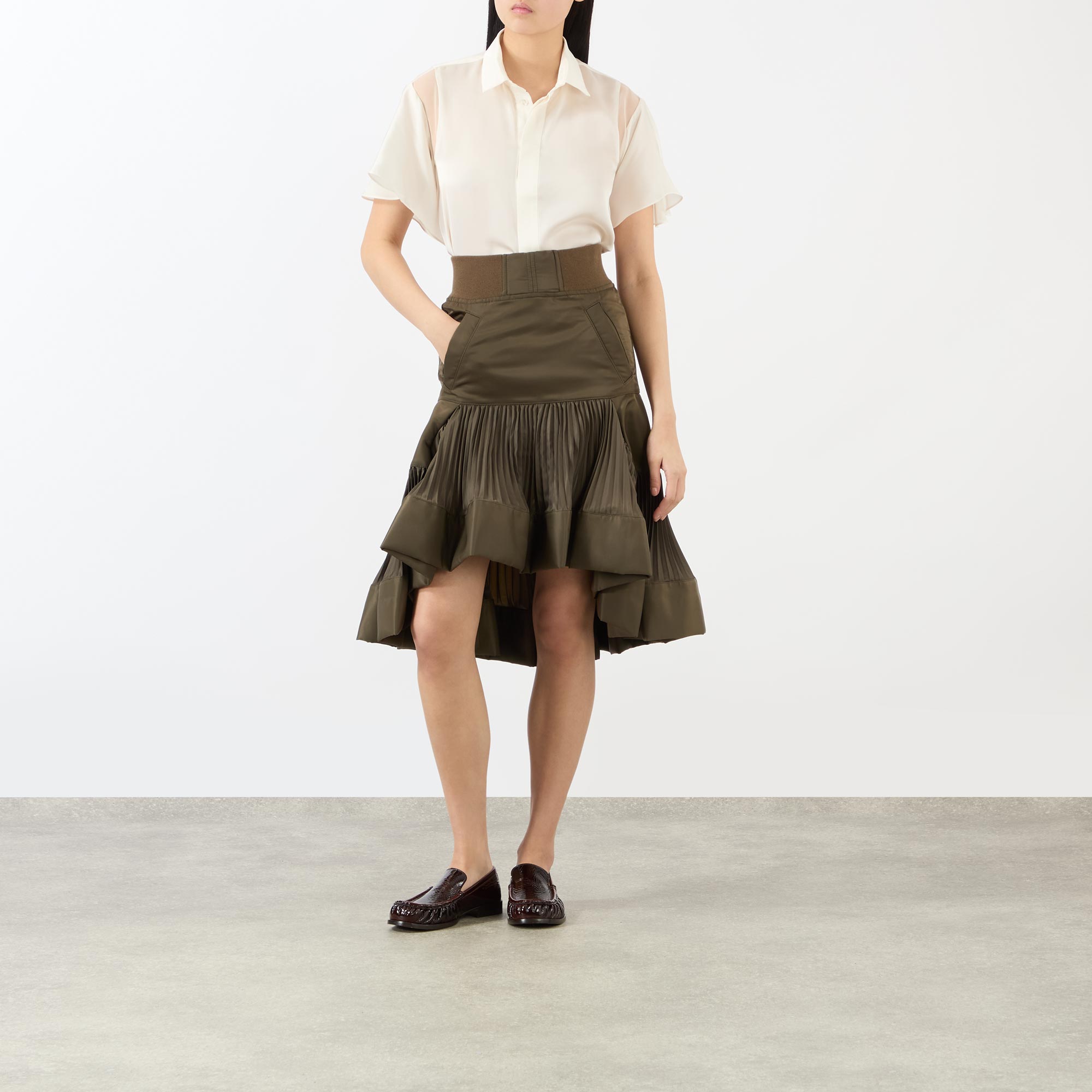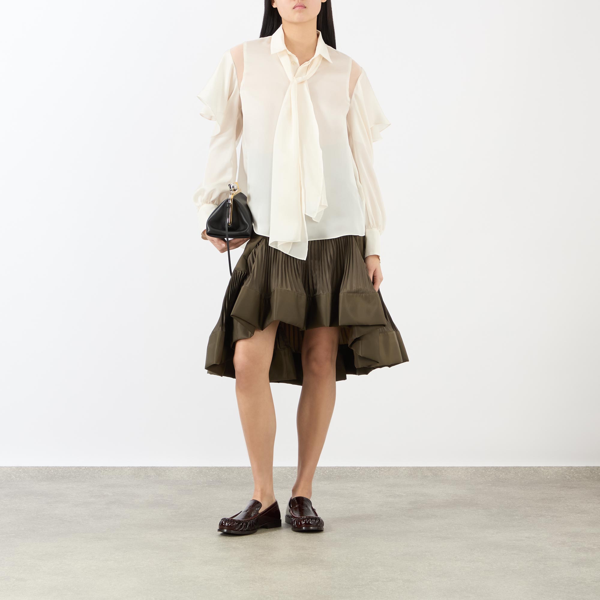 The SS26 collection from Sacai redefines modern elegance through expert tailoring, exemplified in the design of this blouse. Framed by a classic point collar, the design features long ruffled sleeves with cut-out panels that showcase the brand’s exceptional craftsmanship. A fluid neck tie drapes down the front, while buttoned cuffs and a softly curved hem complete the look with polished precision.