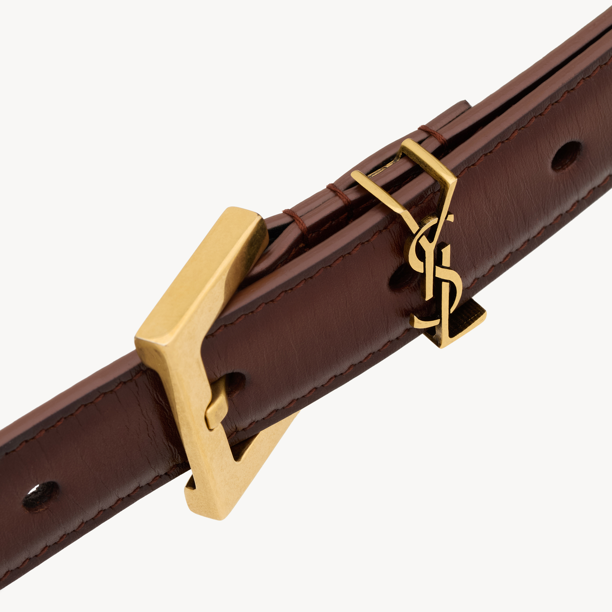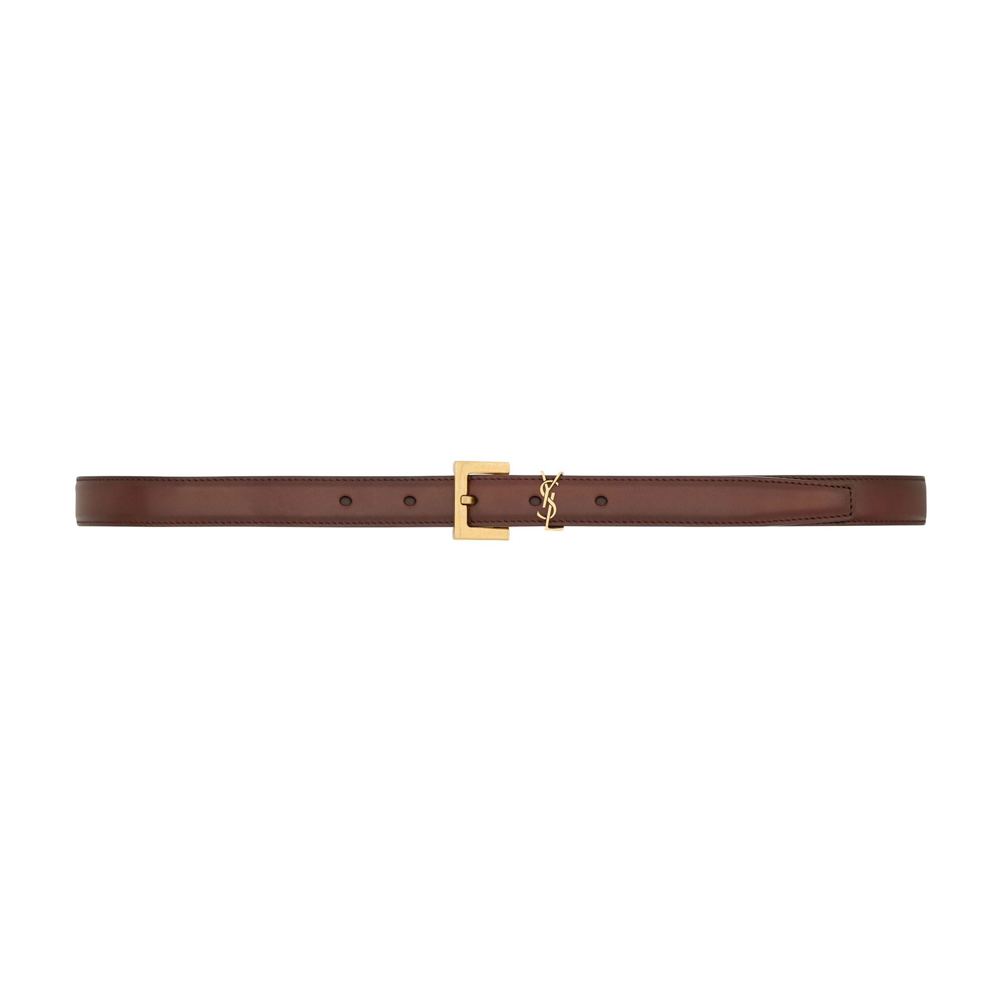 • Thin style, smooth leather with a vintage effect, square buckle, Cassandre loop, bronze-tone hardware, adjustable pin buckle